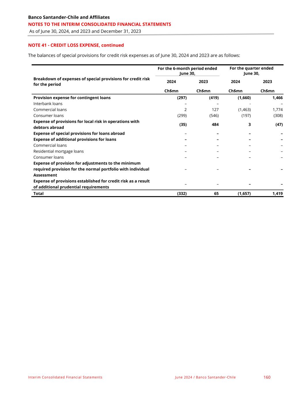 Banco Santander-Chile and Affiliates NOTES TO THE INTERIM CONSOLIDATED FINANCIAL STATEMENTS As of June 30, 2024, and 2023 and December 31, 2023 Interim Consolidated Financial Statements June 2024 / Banco Santander-Chile 160 NOTE 41 - CREDIT LOSS EXPENSE, continued The balances of special provisions for credit risk expenses as of June 30, 2024 and 2023 are as follows: For the 6-month period ended June 30, For the quarter ended June 30, Breakdown of expenses of special provisions for credit risk for the period 2024 2023 2024 2023 Ch$mn Ch$mn Ch$mn Ch$mn Provision expense for contingent loans (297) (419) (1,660) 1,466 Interbank loans – – - – Commercial loans 2 127 (1,463) 1,774 Consumer loans (299) (546) (197) (308) Expense of provisions for local risk in operations with debtors abroad (35) 484 3 (47) Expense of special provisions for loans abroad – – – – Expense of additional provisions for loans – – – – Commercial loans – – – – Residential mortgage loans – – – – Consumer loans – – – – Expense of provision for adjustments to the minimum required provision for the normal portfolio with individual Assessment – – – – Expense of provisions established for credit risk as a result of additional prudential requirements – – – – Total (332) 65 (1,657) 1,419