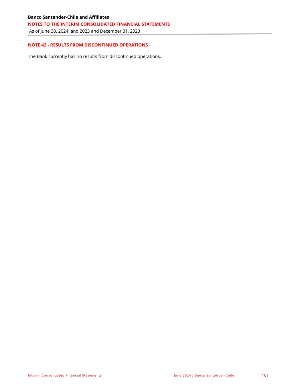 Banco Santander-Chile and Affiliates NOTES TO THE INTERIM CONSOLIDATED FINANCIAL STATEMENTS As of June 30, 2024, and 2023 and December 31, 2023 Interim Consolidated Financial Statements June 2024 / Banco Santander-Chile 161 NOTE 42 - RESULTS FROM DISCONTINUED OPERATIONS The Bank currently has no results from discontinued operations.