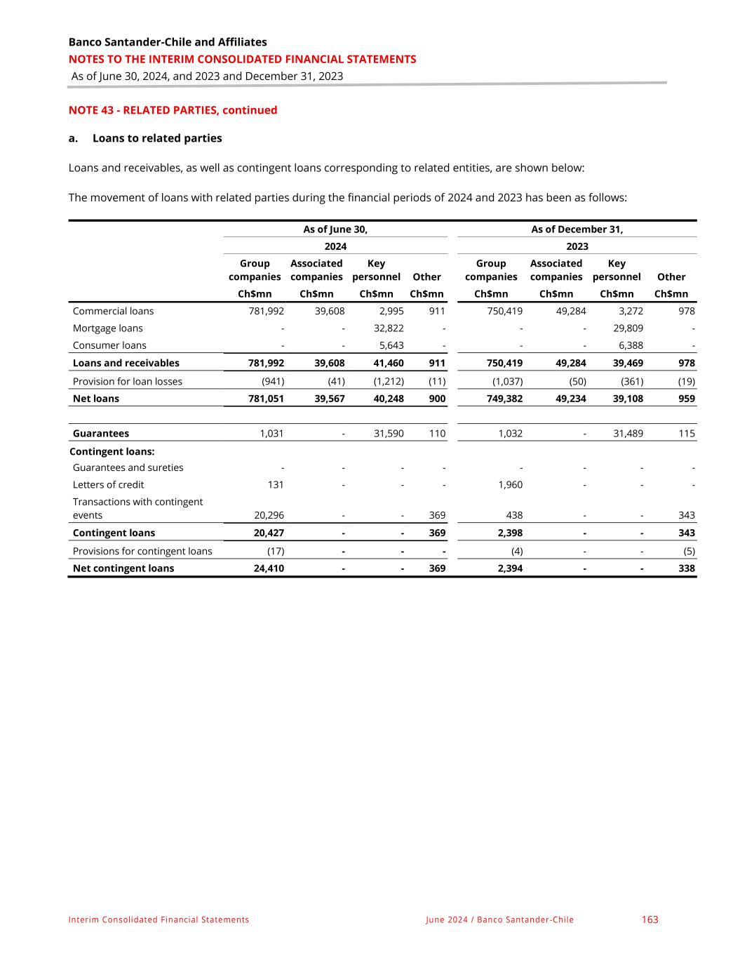 Banco Santander-Chile and Affiliates NOTES TO THE INTERIM CONSOLIDATED FINANCIAL STATEMENTS As of June 30, 2024, and 2023 and December 31, 2023 Interim Consolidated Financial Statements June 2024 / Banco Santander-Chile 163 NOTE 43 - RELATED PARTIES, continued a. Loans to related parties Loans and receivables, as well as contingent loans corresponding to related entities, are shown below: The movement of loans with related parties during the financial periods of 2024 and 2023 has been as follows: As of June 30, As of December 31, 2024 2023 Group companies Associated companies Key personnel Other Group companies Associated companies Key personnel Other Ch$mn Ch$mn Ch$mn Ch$mn Ch$mn Ch$mn Ch$mn Ch$mn Commercial loans 781,992 39,608 2,995 911 750,419 49,284 3,272 978 Mortgage loans - - 32,822 - - - 29,809 - Consumer loans - - 5,643 - - - 6,388 - Loans and receivables 781,992 39,608 41,460 911 750,419 49,284 39,469 978 Provision for loan losses (941) (41) (1,212) (11) (1,037) (50) (361) (19) Net loans 781,051 39,567 40,248 900 749,382 49,234 39,108 959 Guarantees 1,031 - 31,590 110 1,032 - 31,489 115 Contingent loans: Guarantees and sureties - - - - - - - - Letters of credit 131 - - - 1,960 - - - Transactions with contingent events 20,296 - - 369 438 - - 343 Contingent loans 20,427 - - 369 2,398 - - 343 Provisions for contingent loans (17) - - - (4) - - (5) Net contingent loans 24,410 - - 369 2,394 - - 338