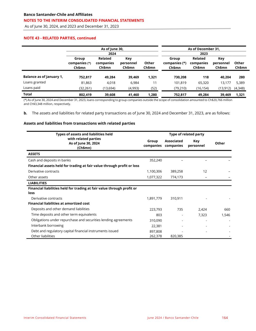 Banco Santander-Chile and Affiliates NOTES TO THE INTERIM CONSOLIDATED FINANCIAL STATEMENTS As of June 30, 2024, and 2023 and December 31, 2023 Interim Consolidated Financial Statements June 2024 / Banco Santander-Chile 164 NOTE 43 - RELATED PARTIES, continued As of June 30, As of December 31, 2024 2023 Group Related Key Other Group Related Key Other companies (*) companies personnel companies (*) companies personnel Ch$mn Ch$mn Ch$mn Ch$mn Ch$mn Ch$mn Ch$mn Ch$mn Balance as of January 1, 752,817 49,284 39,469 1,321 730,208 118 40,204 280 Loans granted 81,863 4,018 6,984 11 101,819 65,320 13,177 5,389 Loans paid (32,261) (13,694) (4,993) (52) (79,210) (16,154) (13,912) (4,348) Total 802,419 39,608 41,460 1,280 752,817 49,284 39,469 1,321 (*) As of June 30, 2024 and December 31, 2023, loans corresponding to group companies outside the scope of consolidation amounted to Ch$20,766 million and Ch$3,348 million, respectively. b. The assets and liabilities for related party transactions as of June 30, 2024 and December 31, 2023, are as follows: Assets and liabilities from transactions with related parties Types of assets and liabilities held with related parties As of June 30, 2024 (Ch$mn) Type of related party Group companies Associated companies Key personnel Other ASSETS Cash and deposits in banks 352,240 – – – Financial assets held for trading at fair value through profit or loss Derivative contracts 1,100,306 389,258 12 – Other assets 1,077,322 774,173 – – LIABILITIES Financial liabilities held for trading at fair value through profit or loss Derivative contracts 1,891,779 310,911 - - Financial liabilities at amortized cost Deposits and other demand liabilities 223,793 735 2,424 660 Time deposits and other term equivalents 803 - 7,323 1,546 Obligations under repurchase and securities lending agreements 310,090 - - - Interbank borrowing 22,381 - - - Debt and regulatory capital financial instruments issued 897,808 - - - Other liabilities 262,378 820,385 -