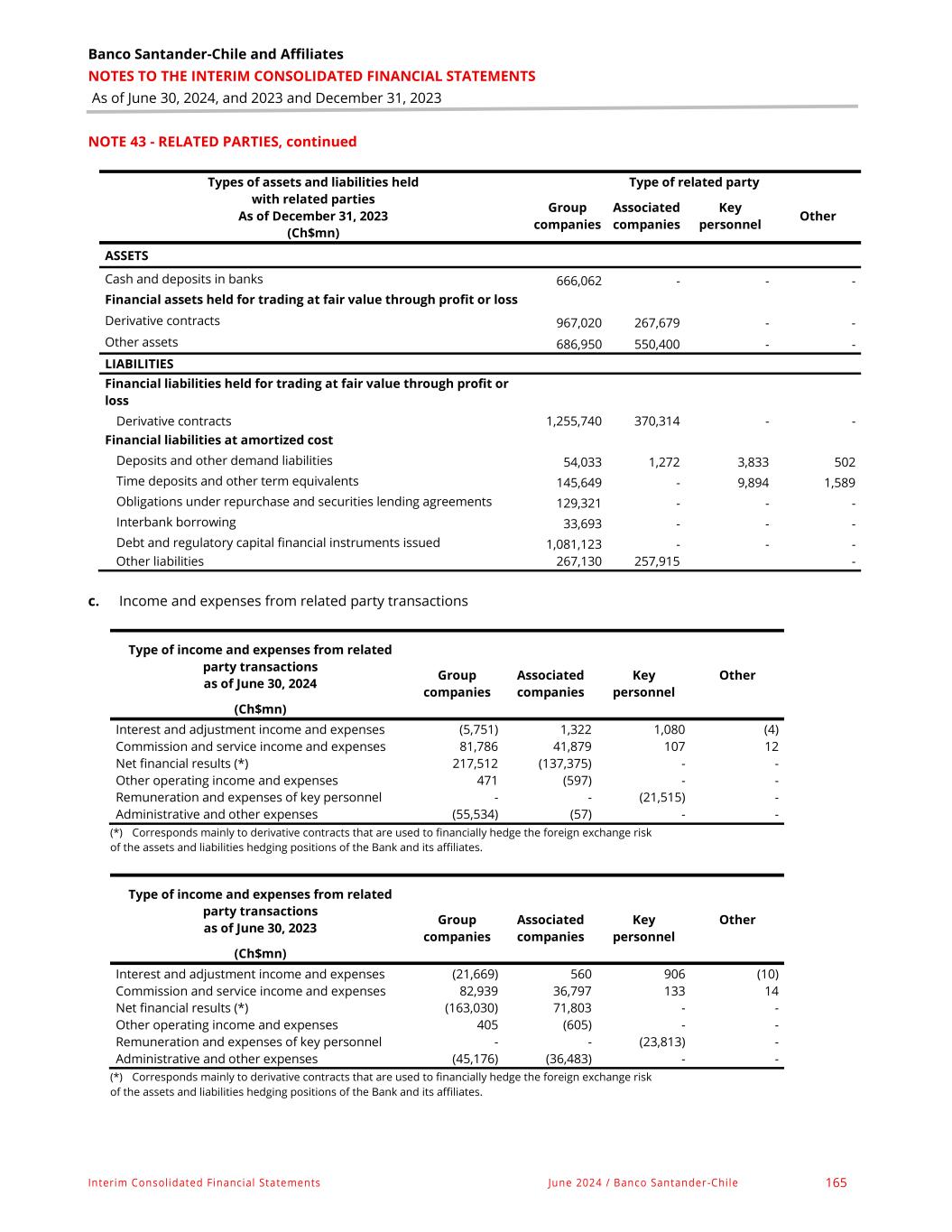 Banco Santander-Chile and Affiliates NOTES TO THE INTERIM CONSOLIDATED FINANCIAL STATEMENTS As of June 30, 2024, and 2023 and December 31, 2023 Interim Consolidated Financial Statements June 2024 / Banco Santander-Chile 165 NOTE 43 - RELATED PARTIES, continued Types of assets and liabilities held with related parties As of December 31, 2023 (Ch$mn) Type of related party Group companies Associated companies Key personnel Other ASSETS Cash and deposits in banks 666,062 - - - Financial assets held for trading at fair value through profit or loss Derivative contracts 967,020 267,679 - - Other assets 686,950 550,400 - - LIABILITIES Financial liabilities held for trading at fair value through profit or loss Derivative contracts 1,255,740 370,314 - - Financial liabilities at amortized cost Deposits and other demand liabilities 54,033 1,272 3,833 502 Time deposits and other term equivalents 145,649 - 9,894 1,589 Obligations under repurchase and securities lending agreements 129,321 - - - Interbank borrowing 33,693 - - - Debt and regulatory capital financial instruments issued 1,081,123 - - - Other liabilities 267,130 257,915 - c. Income and expenses from related party transactions Type of income and expenses from related party transactions as of June 30, 2024 Group companies Associated companies Key personnel Other (Ch$mn) Interest and adjustment income and expenses (5,751) 1,322 1,080 (4) Commission and service income and expenses 81,786 41,879 107 12 Net financial results (*) 217,512 (137,375) - - Other operating income and expenses 471 (597) - - Remuneration and expenses of key personnel - - (21,515) - Administrative and other expenses (55,534) (57) - - (*) Corresponds mainly to derivative contracts that are used to financially hedge the foreign exchange risk of the assets and liabilities hedging positions of the Bank and its affiliates. Type of income and expenses from related party transactions as of June 30, 2023 Group companies Associated companies Key personnel Other (Ch$mn) Interest and adjustment income and expenses (21,669) 560 906 (10) Commission and service income and expenses 82,939 36,797 133 14 Net financial results (*) (163,030) 71,803 - - Other operating income and expenses 405 (605) - - Remuneration and expenses of key personnel - - (23,813) - Administrative and other expenses (45,176) (36,483) - - (*) Corresponds mainly to derivative contracts that are used to financially hedge the foreign exchange risk of the assets and liabilities hedging positions of the Bank and its affiliates.