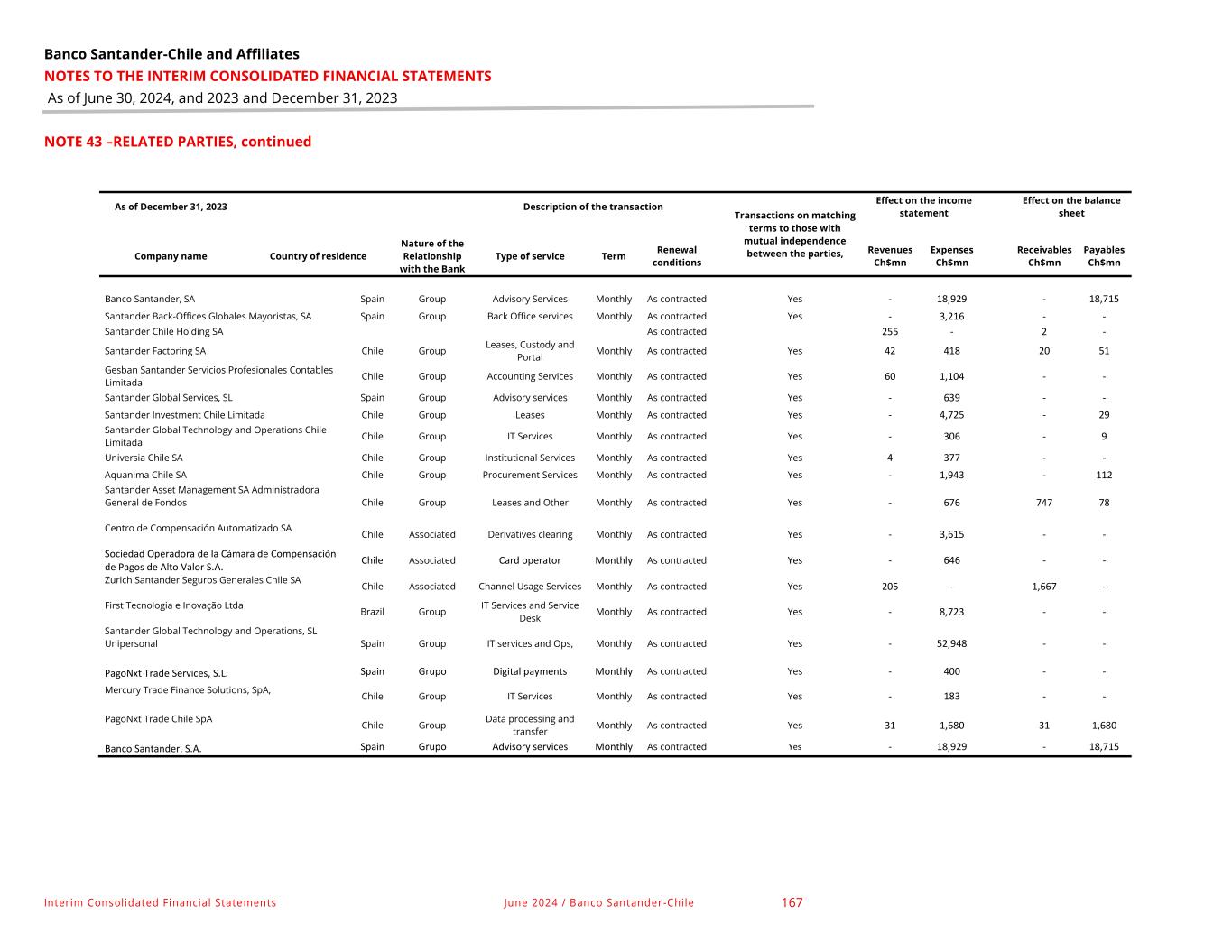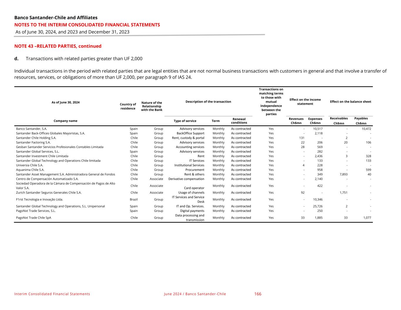Banco Santander-Chile and Affiliates NOTES TO THE INTERIM CONSOLIDATED FINANCIAL STATEMENTS As of June 30, 2024, and 2023 and December 31, 2023 Interim Consolidated Financial Statements June 2024 / Banco Santander-Chile 166 NOTE 43 –RELATED PARTIES, continued d. Transactions with related parties greater than UF 2,000 Individual transactions in the period with related parties that are legal entities that are not normal business transactions with customers in general and that involve a transfer of resources, services, or obligations of more than UF 2,000, per paragraph 9 of IAS 24. As of June 30, 2024 Country of residence Nature of the Relationship with the Bank Description of the transaction Transactions on matching terms to those with mutual independence between the parties Effect on the income statement Effect on the balance sheet Company name Type of service Term Renewal conditions Revenues Ch$mn Expenses Ch$mn Receivables Ch$mn Payables Ch$mn Banco Santander, S.A. Spain Group Advisory services Monthly As contracted Yes - 10,517 - 10,472 Santander Back-Offices Globales Mayoristas, S.A. Spain Group BackOffice Support Monthly As contracted Yes - 2,118 - - Santander Chile Holding S.A. Chile Group Rent, custody & portal Monthly As contracted Yes 131 - 2 - Santander Factoring S.A. Chile Group Advisory services Monthly As contracted Yes 22 206 20 106 Gesban Santander Servicios Profesionales Contables Limitada Chile Group Accounting services Monthly As contracted Yes 28 569 - - Santander Global Services, S.L. Spain Group Advisory services Monthly As contracted Yes - 282 - - Santander Investment Chile Limitada Chile Group Rent Monthly As contracted Yes - 2,436 3 328 Santander Global Technology and Operations Chile limitada Chile Group IT Services Monthly As contracted Yes - 133 - 133 Universia Chile S.A. Chile Group Institutional Services Monthly As contracted Yes 4 228 - - Aquanima Chile S.A. Chile Group Procurement Monthly As contracted Yes - 958 - 599 Santander Asset Management S.A. Administradora General de Fondos Chile Group Rent & others Monthly As contracted Yes - 349 7,893 40 Centro de Compensación Automatizado S.A. Chile Associate Derivative compensation Monthly As contracted Yes - 2,140 - - Sociedad Operadora de la Cámara de Compensación de Pagos de Alto Valor S.A. Chile Associate Card operator Monthly As contracted Yes - 422 - - Zurich Santander Seguros Generales Chile S.A. Chile Associate Usage of channels Monthly As contracted Yes 92 - 1,751 - F1rst Tecnologia e Inovação Ltda. Brazil Group IT Services and Service Desk Monthly As contracted Yes - 10,346 - - Santander Global Technology and Operations, S.L. Unipersonal Spain Group IT and Op. Services. Monthly As contracted Yes - 25,726 2 - PagoNxt Trade Services, S.L. Spain Group Digital payments Monthly As contracted Yes - 250 - - PagoNxt Trade Chile SpA Chile Group Data processing and transmission Monthly As contracted Yes 33 1,885 33 1,077
