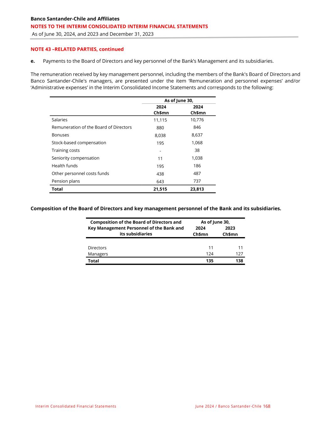Banco Santander-Chile and Affiliates NOTES TO THE INTERIM CONSOLIDATED INTERIM FINANCIAL STATEMENTS As of June 30, 2024, and 2023 and December 31, 2023 Interim Consolidated Financial Statements June 2024 / Banco Santander -Chile 168 NOTE 43 –RELATED PARTIES, continued e. Payments to the Board of Directors and key personnel of the Bank’s Management and its subsidiaries. The remuneration received by key management personnel, including the members of the Bank's Board of Directors and Banco Santander-Chile's managers, are presented under the item ‘Remuneration and personnel expenses’ and/or ‘Administrative expenses’ in the Interim Consolidated Income Statements and corresponds to the following: As of June 30, 2024 2024 Ch$mn Ch$mn Salaries 11,115 10,776 Remuneration of the Board of Directors 880 846 Bonuses 8,038 8,637 Stock-based compensation 195 1,068 Training costs - 38 Seniority compensation 11 1,038 Health funds 195 195438 186 Other personnel costs funds 438 438 487 Pension plans 643 737 Total 21,515 23,813 Composition of the Board of Directors and key management personnel of the Bank and its subsidiaries. Composition of the Board of Directors and Key Management Personnel of the Bank and its subsidiaries As of June 30, 2024 2023 Ch$mn Ch$mn Directors 11 11 Managers 124 127 Total 135 138