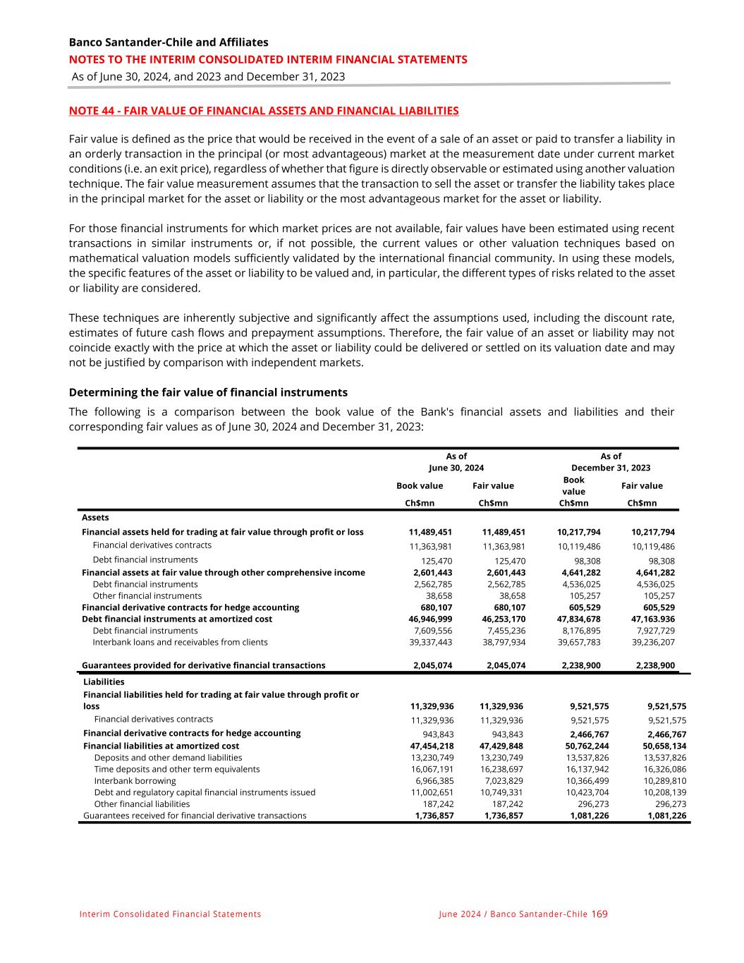 Banco Santander-Chile and Affiliates NOTES TO THE INTERIM CONSOLIDATED INTERIM FINANCIAL STATEMENTS As of June 30, 2024, and 2023 and December 31, 2023 Interim Consolidated Financial Statements June 2024 / Banco Santander -Chile 169 NOTE 44 - FAIR VALUE OF FINANCIAL ASSETS AND FINANCIAL LIABILITIES Fair value is defined as the price that would be received in the event of a sale of an asset or paid to transfer a liability in an orderly transaction in the principal (or most advantageous) market at the measurement date under current market conditions (i.e. an exit price), regardless of whether that figure is directly observable or estimated using another valuation technique. The fair value measurement assumes that the transaction to sell the asset or transfer the liability takes place in the principal market for the asset or liability or the most advantageous market for the asset or liability. For those financial instruments for which market prices are not available, fair values have been estimated using recent transactions in similar instruments or, if not possible, the current values or other valuation techniques based on mathematical valuation models sufficiently validated by the international financial community. In using these models, the specific features of the asset or liability to be valued and, in particular, the different types of risks related to the asset or liability are considered. These techniques are inherently subjective and significantly affect the assumptions used, including the discount rate, estimates of future cash flows and prepayment assumptions. Therefore, the fair value of an asset or liability may not coincide exactly with the price at which the asset or liability could be delivered or settled on its valuation date and may not be justified by comparison with independent markets. Determining the fair value of financial instruments The following is a comparison between the book value of the Bank's financial assets and liabilities and their corresponding fair values as of June 30, 2024 and December 31, 2023: As of June 30, 2024 As of December 31, 2023 Book value Fair value Book value Fair value Ch$mn Ch$mn Ch$mn Ch$mn Assets Financial assets held for trading at fair value through profit or loss 11,489,451 11,489,451 10,217,794 10,217,794 Financial derivatives contracts 11,363,981 11,363,981 10,119,486 10,119,486 Debt financial instruments 125,470 125,470 98,308 98,308 Financial assets at fair value through other comprehensive income 2,601,443 2,601,443 4,641,282 4,641,282 Debt financial instruments 2,562,785 2,562,785 4,536,025 4,536,025 Other financial instruments 38,658 38,658 105,257 105,257 Financial derivative contracts for hedge accounting 680,107 680,107 605,529 605,529 Debt financial instruments at amortized cost 46,946,999 46,253,170 47,834,678 47,163.936 Debt financial instruments 7,609,556 7,455,236 8,176,895 7,927,729 Interbank loans and receivables from clients 39,337,443 38,797,934 39,657,783 39,236,207 Guarantees provided for derivative financial transactions 2,045,074 2,045,074 2,238,900 2,238,900 Liabilities Financial liabilities held for trading at fair value through profit or loss 11,329,936 11,329,936 9,521,575 9,521,575 Financial derivatives contracts 11,329,936 11,329,936 9,521,575 9,521,575 Financial derivative contracts for hedge accounting 943,843 943,843 2,466,767 2,466,767 Financial liabilities at amortized cost 47,454,218 47,429,848 50,762,244 50,658,134 Deposits and other demand liabilities 13,230,749 13,230,749 13,537,826 13,537,826 Time deposits and other term equivalents 16,067,191 16,238,697 16,137,942 16,326,086 Interbank borrowing 6,966,385 7,023,829 10,366,499 10,289,810 Debt and regulatory capital financial instruments issued 11,002,651 10,749,331 10,423,704 10,208,139 Other financial liabilities 187,242 187,242 296,273 296,273 Guarantees received for financial derivative transactions 1,736,857 1,736,857 1,081,226 1,081,226