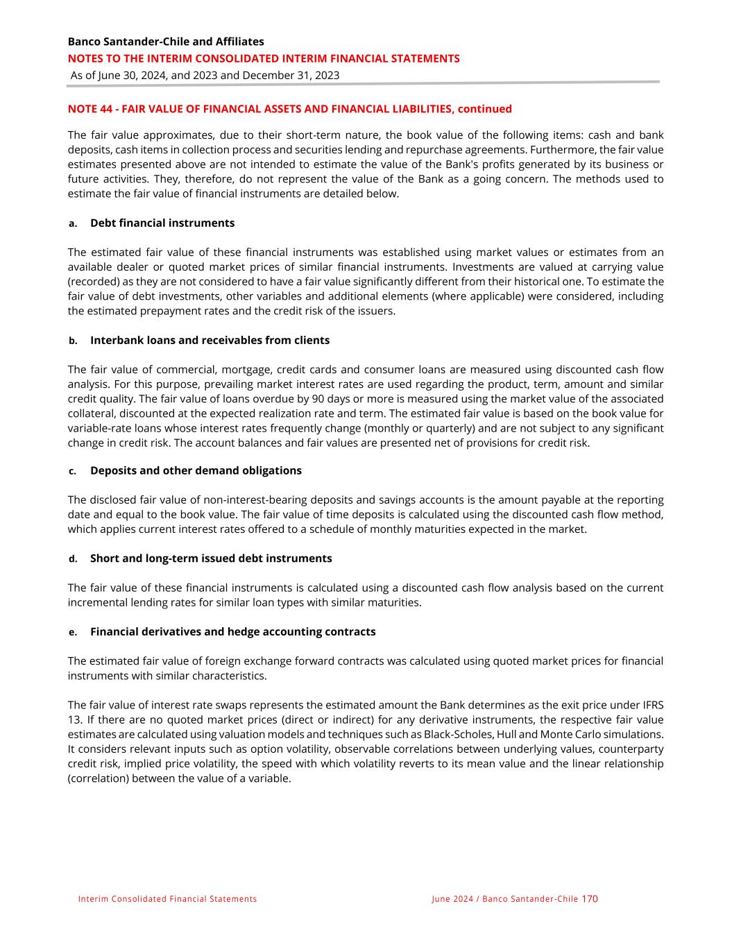 Banco Santander-Chile and Affiliates NOTES TO THE INTERIM CONSOLIDATED INTERIM FINANCIAL STATEMENTS As of June 30, 2024, and 2023 and December 31, 2023 Interim Consolidated Financial Statements June 2024 / Banco Santander -Chile 170 NOTE 44 - FAIR VALUE OF FINANCIAL ASSETS AND FINANCIAL LIABILITIES, continued The fair value approximates, due to their short-term nature, the book value of the following items: cash and bank deposits, cash items in collection process and securities lending and repurchase agreements. Furthermore, the fair value estimates presented above are not intended to estimate the value of the Bank's profits generated by its business or future activities. They, therefore, do not represent the value of the Bank as a going concern. The methods used to estimate the fair value of financial instruments are detailed below. a. Debt financial instruments The estimated fair value of these financial instruments was established using market values or estimates from an available dealer or quoted market prices of similar financial instruments. Investments are valued at carrying value (recorded) as they are not considered to have a fair value significantly different from their historical one. To estimate the fair value of debt investments, other variables and additional elements (where applicable) were considered, including the estimated prepayment rates and the credit risk of the issuers. b. Interbank loans and receivables from clients The fair value of commercial, mortgage, credit cards and consumer loans are measured using discounted cash flow analysis. For this purpose, prevailing market interest rates are used regarding the product, term, amount and similar credit quality. The fair value of loans overdue by 90 days or more is measured using the market value of the associated collateral, discounted at the expected realization rate and term. The estimated fair value is based on the book value for variable-rate loans whose interest rates frequently change (monthly or quarterly) and are not subject to any significant change in credit risk. The account balances and fair values are presented net of provisions for credit risk. c. Deposits and other demand obligations The disclosed fair value of non-interest-bearing deposits and savings accounts is the amount payable at the reporting date and equal to the book value. The fair value of time deposits is calculated using the discounted cash flow method, which applies current interest rates offered to a schedule of monthly maturities expected in the market. d. Short and long-term issued debt instruments The fair value of these financial instruments is calculated using a discounted cash flow analysis based on the current incremental lending rates for similar loan types with similar maturities. e. Financial derivatives and hedge accounting contracts The estimated fair value of foreign exchange forward contracts was calculated using quoted market prices for financial instruments with similar characteristics. The fair value of interest rate swaps represents the estimated amount the Bank determines as the exit price under IFRS 13. If there are no quoted market prices (direct or indirect) for any derivative instruments, the respective fair value estimates are calculated using valuation models and techniques such as Black-Scholes, Hull and Monte Carlo simulations. It considers relevant inputs such as option volatility, observable correlations between underlying values, counterparty credit risk, implied price volatility, the speed with which volatility reverts to its mean value and the linear relationship (correlation) between the value of a variable.