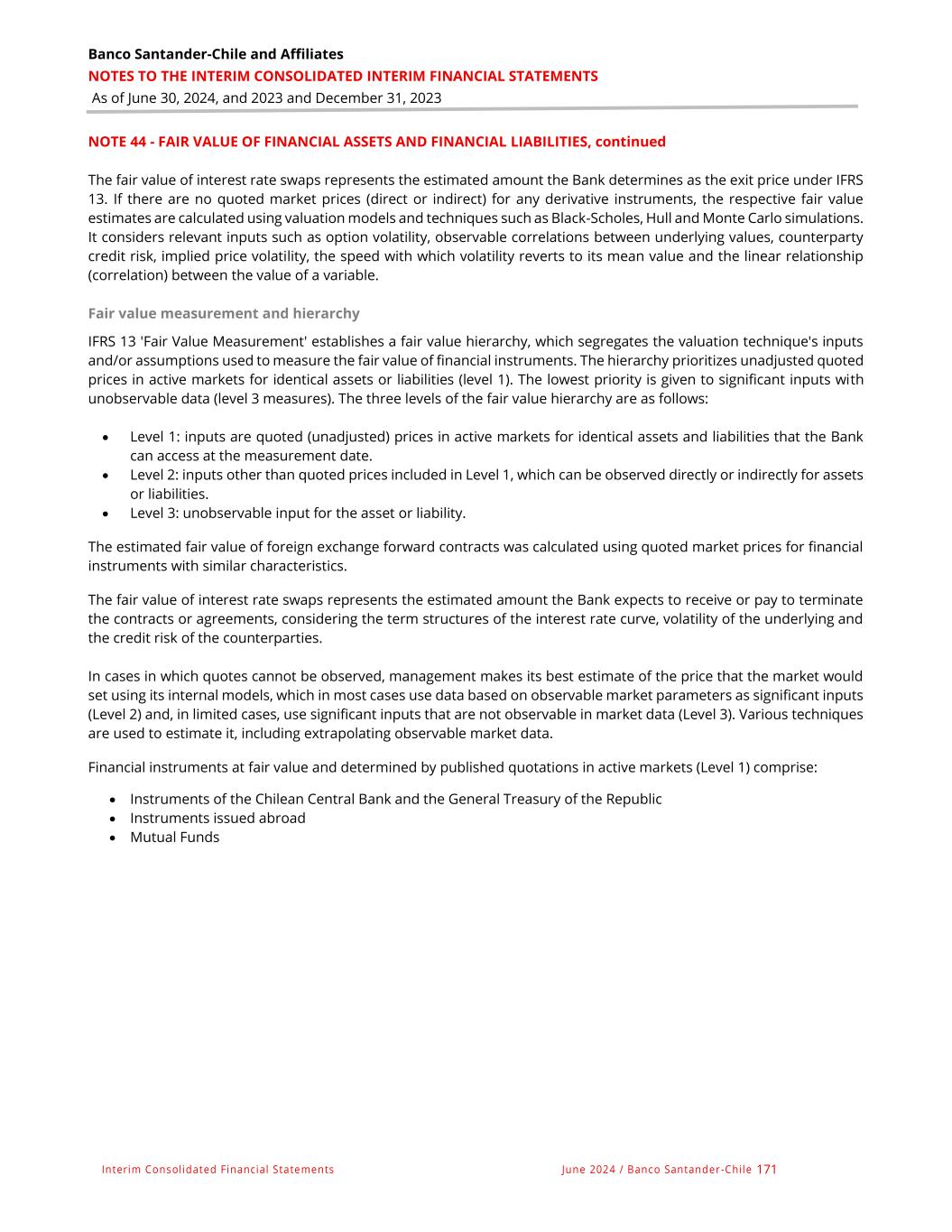 Banco Santander-Chile and Affiliates NOTES TO THE INTERIM CONSOLIDATED INTERIM FINANCIAL STATEMENTS As of June 30, 2024, and 2023 and December 31, 2023 Interim Consolidated Financial Statements June 2024 / Banco Santander -Chile 171 NOTE 44 - FAIR VALUE OF FINANCIAL ASSETS AND FINANCIAL LIABILITIES, continued The fair value of interest rate swaps represents the estimated amount the Bank determines as the exit price under IFRS 13. If there are no quoted market prices (direct or indirect) for any derivative instruments, the respective fair value estimates are calculated using valuation models and techniques such as Black-Scholes, Hull and Monte Carlo simulations. It considers relevant inputs such as option volatility, observable correlations between underlying values, counterparty credit risk, implied price volatility, the speed with which volatility reverts to its mean value and the linear relationship (correlation) between the value of a variable. Fair value measurement and hierarchy IFRS 13 'Fair Value Measurement' establishes a fair value hierarchy, which segregates the valuation technique's inputs and/or assumptions used to measure the fair value of financial instruments. The hierarchy prioritizes unadjusted quoted prices in active markets for identical assets or liabilities (level 1). The lowest priority is given to significant inputs with unobservable data (level 3 measures). The three levels of the fair value hierarchy are as follows: • Level 1: inputs are quoted (unadjusted) prices in active markets for identical assets and liabilities that the Bank can access at the measurement date. • Level 2: inputs other than quoted prices included in Level 1, which can be observed directly or indirectly for assets or liabilities. • Level 3: unobservable input for the asset or liability. The estimated fair value of foreign exchange forward contracts was calculated using quoted market prices for financial instruments with similar characteristics. The fair value of interest rate swaps represents the estimated amount the Bank expects to receive or pay to terminate the contracts or agreements, considering the term structures of the interest rate curve, volatility of the underlying and the credit risk of the counterparties. In cases in which quotes cannot be observed, management makes its best estimate of the price that the market would set using its internal models, which in most cases use data based on observable market parameters as significant inputs (Level 2) and, in limited cases, use significant inputs that are not observable in market data (Level 3). Various techniques are used to estimate it, including extrapolating observable market data. Financial instruments at fair value and determined by published quotations in active markets (Level 1) comprise: • Instruments of the Chilean Central Bank and the General Treasury of the Republic • Instruments issued abroad • Mutual Funds