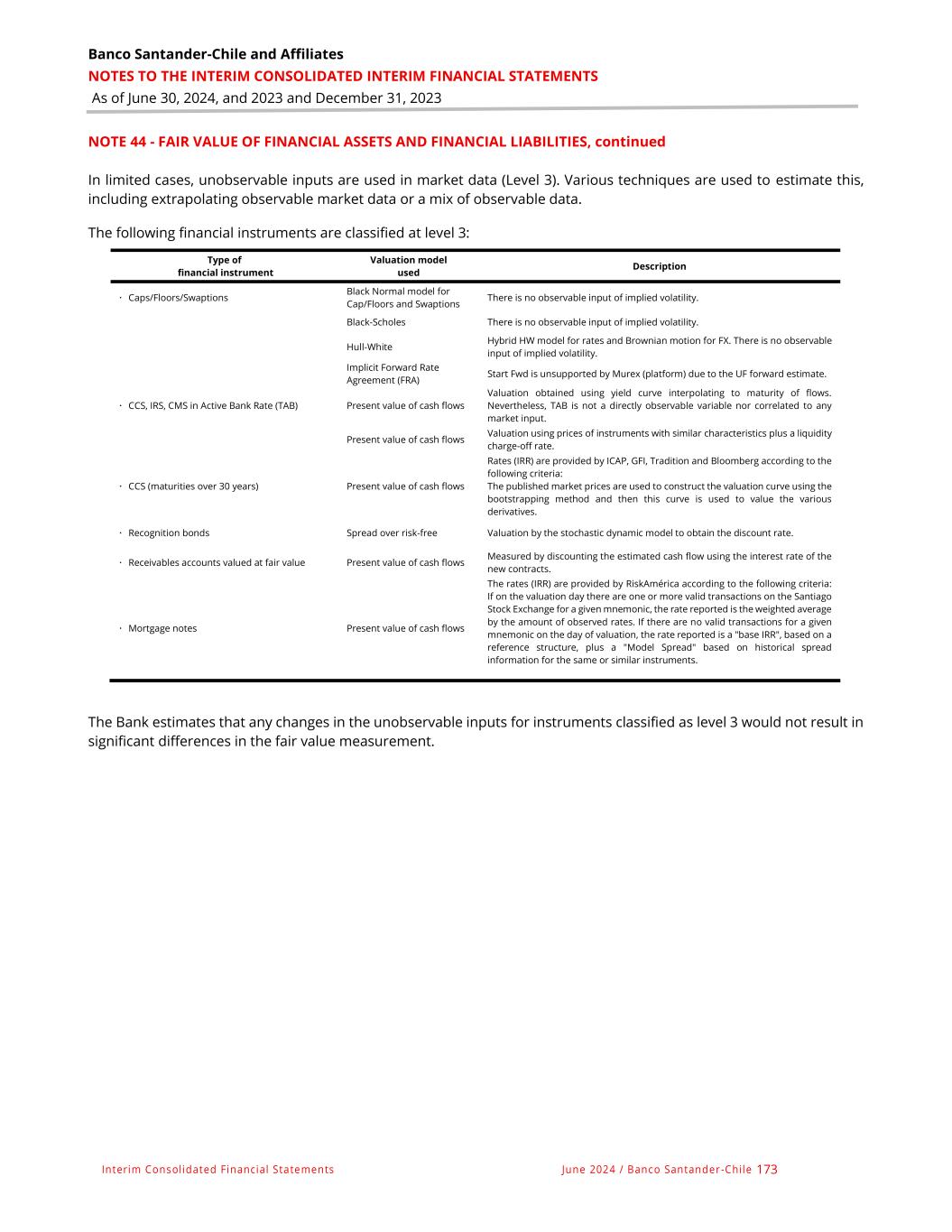 Banco Santander-Chile and Affiliates NOTES TO THE INTERIM CONSOLIDATED INTERIM FINANCIAL STATEMENTS As of June 30, 2024, and 2023 and December 31, 2023 Interim Consolidated Financial Statements June 2024 / Banco Santander -Chile 173 NOTE 44 - FAIR VALUE OF FINANCIAL ASSETS AND FINANCIAL LIABILITIES, continued In limited cases, unobservable inputs are used in market data (Level 3). Various techniques are used to estimate this, including extrapolating observable market data or a mix of observable data. The following financial instruments are classified at level 3: The Bank estimates that any changes in the unobservable inputs for instruments classified as level 3 would not result in significant differences in the fair value measurement. Type of financial instrument Valuation model used Description  Caps/Floors/Swaptions Black Normal model for Cap/Floors and Swaptions There is no observable input of implied volatility. Black-Scholes There is no observable input of implied volatility. Hull-White Hybrid HW model for rates and Brownian motion for FX. There is no observable input of implied volatility. Implicit Forward Rate Agreement (FRA) Start Fwd is unsupported by Murex (platform) due to the UF forward estimate.  CCS, IRS, CMS in Active Bank Rate (TAB) Present value of cash flows Valuation obtained using yield curve interpolating to maturity of flows. Nevertheless, TAB is not a directly observable variable nor correlated to any market input. Present value of cash flows Valuation using prices of instruments with similar characteristics plus a liquidity charge-off rate.  CCS (maturities over 30 years) Present value of cash flows Rates (IRR) are provided by ICAP, GFI, Tradition and Bloomberg according to the following criteria: The published market prices are used to construct the valuation curve using the bootstrapping method and then this curve is used to value the various derivatives.  Recognition bonds Spread over risk-free Valuation by the stochastic dynamic model to obtain the discount rate.  Receivables accounts valued at fair value Present value of cash flows Measured by discounting the estimated cash flow using the interest rate of the new contracts.  Mortgage notes Present value of cash flows The rates (IRR) are provided by RiskAmérica according to the following criteria: If on the valuation day there are one or more valid transactions on the Santiago Stock Exchange for a given mnemonic, the rate reported is the weighted average by the amount of observed rates. If there are no valid transactions for a given mnemonic on the day of valuation, the rate reported is a "base IRR", based on a reference structure, plus a "Model Spread" based on historical spread information for the same or similar instruments.