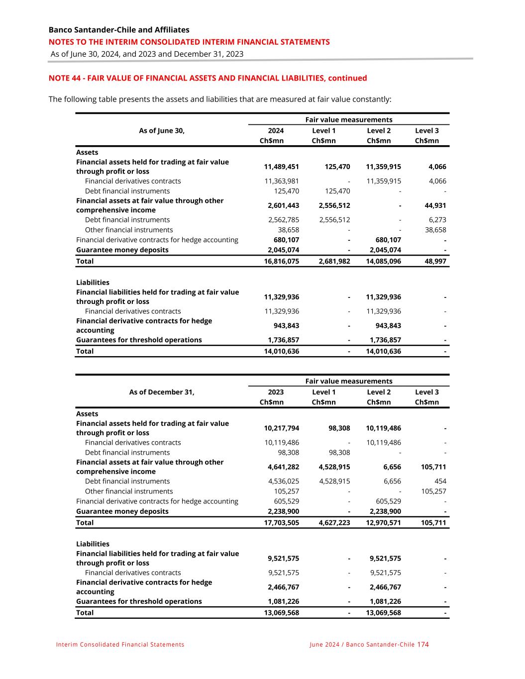 Banco Santander-Chile and Affiliates NOTES TO THE INTERIM CONSOLIDATED INTERIM FINANCIAL STATEMENTS As of June 30, 2024, and 2023 and December 31, 2023 Interim Consolidated Financial Statements June 2024 / Banco Santander -Chile 174 NOTE 44 - FAIR VALUE OF FINANCIAL ASSETS AND FINANCIAL LIABILITIES, continued The following table presents the assets and liabilities that are measured at fair value constantly: Fair value measurements As of June 30, 2024 Level 1 Level 2 Level 3 Ch$mn Ch$mn Ch$mn Ch$mn Assets Financial assets held for trading at fair value through profit or loss 11,489,451 125,470 11,359,915 4,066 Financial derivatives contracts 11,363,981 - 11,359,915 4,066 Debt financial instruments 125,470 125,470 - - Financial assets at fair value through other comprehensive income 2,601,443 2,556,512 - 44,931 Debt financial instruments 2,562,785 2,556,512 - 6,273 Other financial instruments 38,658 - - 38,658 Financial derivative contracts for hedge accounting 680,107 - 680,107 - Guarantee money deposits 2,045,074 - 2,045,074 - Total 16,816,075 2,681,982 14,085,096 48,997 Liabilities Financial liabilities held for trading at fair value through profit or loss 11,329,936 - 11,329,936 - Financial derivatives contracts 11,329,936 - 11,329,936 - Financial derivative contracts for hedge accounting 943,843 - 943,843 - Guarantees for threshold operations 1,736,857 - 1,736,857 - Total 14,010,636 - 14,010,636 - Fair value measurements As of December 31, 2023 Level 1 Level 2 Level 3 Ch$mn Ch$mn Ch$mn Ch$mn Assets Financial assets held for trading at fair value through profit or loss 10,217,794 98,308 10,119,486 - Financial derivatives contracts 10,119,486 - 10,119,486 - Debt financial instruments 98,308 98,308 - - Financial assets at fair value through other comprehensive income 4,641,282 4,528,915 6,656 105,711 Debt financial instruments 4,536,025 4,528,915 6,656 454 Other financial instruments 105,257 - - 105,257 Financial derivative contracts for hedge accounting 605,529 - 605,529 - Guarantee money deposits 2,238,900 - 2,238,900 - Total 17,703,505 4,627,223 12,970,571 105,711 Liabilities Financial liabilities held for trading at fair value through profit or loss 9,521,575 - 9,521,575 - Financial derivatives contracts 9,521,575 - 9,521,575 - Financial derivative contracts for hedge accounting 2,466,767 - 2,466,767 - Guarantees for threshold operations 1,081,226 - 1,081,226 - Total 13,069,568 - 13,069,568 -