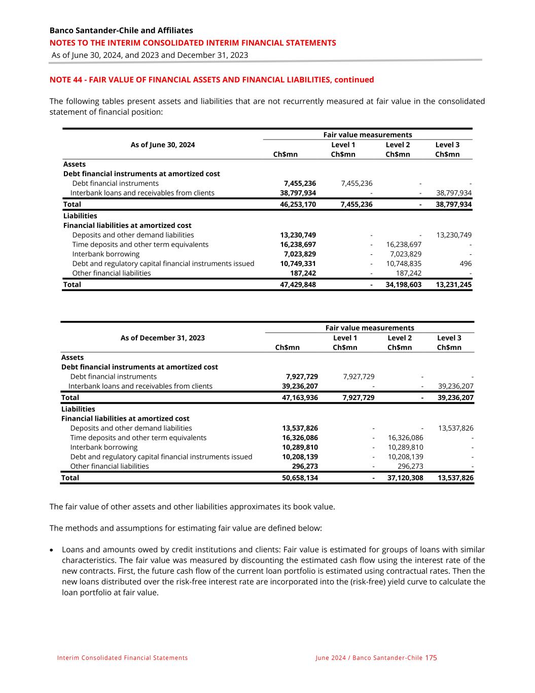 Banco Santander-Chile and Affiliates NOTES TO THE INTERIM CONSOLIDATED INTERIM FINANCIAL STATEMENTS As of June 30, 2024, and 2023 and December 31, 2023 Interim Consolidated Financial Statements June 2024 / Banco Santander -Chile 175 NOTE 44 - FAIR VALUE OF FINANCIAL ASSETS AND FINANCIAL LIABILITIES, continued The following tables present assets and liabilities that are not recurrently measured at fair value in the consolidated statement of financial position: Fair value measurements As of June 30, 2024 Level 1 Level 2 Level 3 Ch$mn Ch$mn Ch$mn Ch$mn Assets Debt financial instruments at amortized cost Debt financial instruments 7,455,236 7,455,236 - - Interbank loans and receivables from clients 38,797,934 - - 38,797,934 Total 46,253,170 7,455,236 - 38,797,934 Liabilities Financial liabilities at amortized cost Deposits and other demand liabilities 13,230,749 - - 13,230,749 Time deposits and other term equivalents 16,238,697 - 16,238,697 - Interbank borrowing 7,023,829 - 7,023,829 - Debt and regulatory capital financial instruments issued 10,749,331 - 10,748,835 496 Other financial liabilities 187,242 - 187,242 - Total 47,429,848 - 34,198,603 13,231,245 Fair value measurements As of December 31, 2023 Level 1 Level 2 Level 3 Ch$mn Ch$mn Ch$mn Ch$mn Assets Debt financial instruments at amortized cost Debt financial instruments 7,927,729 7,927,729 - - Interbank loans and receivables from clients 39,236,207 - - 39,236,207 Total 47,163,936 7,927,729 - 39,236,207 Liabilities Financial liabilities at amortized cost Deposits and other demand liabilities 13,537,826 - - 13,537,826 Time deposits and other term equivalents 16,326,086 - 16,326,086 - Interbank borrowing 10,289,810 - 10,289,810 - Debt and regulatory capital financial instruments issued 10,208,139 - 10,208,139 - Other financial liabilities 296,273 - 296,273 - Total 50,658,134 - 37,120,308 13,537,826 The fair value of other assets and other liabilities approximates its book value. The methods and assumptions for estimating fair value are defined below: • Loans and amounts owed by credit institutions and clients: Fair value is estimated for groups of loans with similar characteristics. The fair value was measured by discounting the estimated cash flow using the interest rate of the new contracts. First, the future cash flow of the current loan portfolio is estimated using contractual rates. Then the new loans distributed over the risk-free interest rate are incorporated into the (risk-free) yield curve to calculate the loan portfolio at fair value.