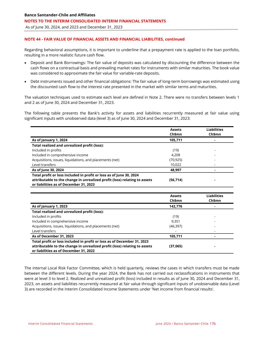 Banco Santander-Chile and Affiliates NOTES TO THE INTERIM CONSOLIDATED INTERIM FINANCIAL STATEMENTS As of June 30, 2024, and 2023 and December 31, 2023 Interim Consolidated Financial Statements June 2024 / Banco Santander -Chile 176 NOTE 44 - FAIR VALUE OF FINANCIAL ASSETS AND FINANCIAL LIABILITIES, continued Regarding behavioral assumptions, it is important to underline that a prepayment rate is applied to the loan portfolio, resulting in a more realistic future cash flow. • Deposit and Bank Borrowings: The fair value of deposits was calculated by discounting the difference between the cash flows on a contractual basis and prevailing market rates for instruments with similar maturities. The book value was considered to approximate the fair value for variable-rate deposits. • Debt instruments issued and other financial obligations: The fair value of long-term borrowings was estimated using the discounted cash flow to the interest rate presented in the market with similar terms and maturities. The valuation techniques used to estimate each level are defined in Note 2. There were no transfers between levels 1 and 2 as of June 30, 2024 and December 31, 2023. The following table presents the Bank's activity for assets and liabilities recurrently measured at fair value using significant inputs with unobserved data (level 3) as of June 30, 2024 and December 31, 2023: Assets Liabilities Ch$mn Ch$mn As of January 1, 2024 105,711 - Total realized and unrealized profit (loss): Included in profits (19) - Included in comprehensive income 4,208 - Acquisitions, issues, liquidations, and placements (net) (70,925) - Level transfers 10,022 - As of June 30, 2024 48,997 - Total profit or loss included in profit or loss as of June 30, 2024 attributable to the change in unrealized profit (loss) relating to assets or liabilities as of December 31, 2023 (56,714) - Assets Liabilities Ch$mn Ch$mn As of January 1, 2023 142,776 - Total realized and unrealized profit (loss): Included in profits (19) - Included in comprehensive income 9,351 - Acquisitions, issues, liquidations, and placements (net) (46,397) - Level transfers - - As of December 31, 2023 105,711 - Total profit or loss included in profit or loss as of December 31, 2023 attributable to the change in unrealized profit (loss) relating to assets or liabilities as of December 31, 2022 (37,065) - The internal Local Risk Factor Committee, which is held quarterly, reviews the cases in which transfers must be made between the different levels. During the year 2024, the Bank has not carried out reclassifications in instruments that were at level 3 to level 2. Realized and unrealized profit (loss) included in results as of June 30, 2024 and December 31, 2023, on assets and liabilities recurrently measured at fair value through significant inputs of unobservable data (Level 3) are recorded in the Interim Consolidated Income Statements under 'Net income from financial results'.
