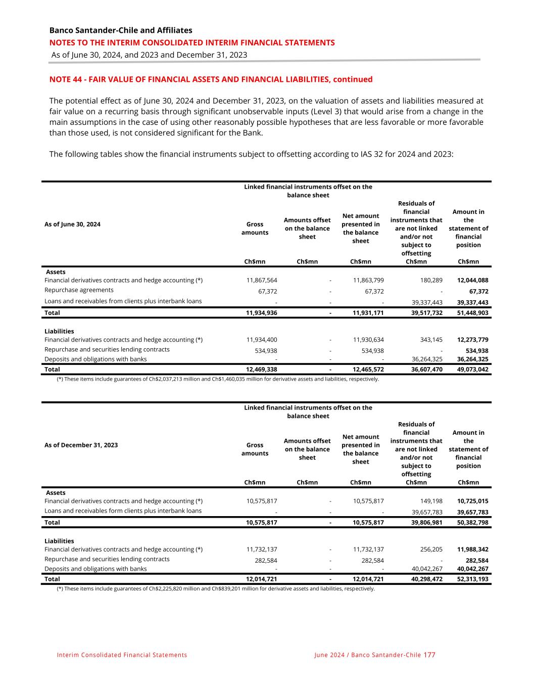 Banco Santander-Chile and Affiliates NOTES TO THE INTERIM CONSOLIDATED INTERIM FINANCIAL STATEMENTS As of June 30, 2024, and 2023 and December 31, 2023 Interim Consolidated Financial Statements June 2024 / Banco Santander -Chile 177 NOTE 44 - FAIR VALUE OF FINANCIAL ASSETS AND FINANCIAL LIABILITIES, continued The potential effect as of June 30, 2024 and December 31, 2023, on the valuation of assets and liabilities measured at fair value on a recurring basis through significant unobservable inputs (Level 3) that would arise from a change in the main assumptions in the case of using other reasonably possible hypotheses that are less favorable or more favorable than those used, is not considered significant for the Bank. The following tables show the financial instruments subject to offsetting according to IAS 32 for 2024 and 2023: Linked financial instruments offset on the balance sheet As of June 30, 2024 Gross amounts Amounts offset on the balance sheet Net amount presented in the balance sheet Residuals of financial instruments that are not linked and/or not subject to offsetting Amount in the statement of financial position Ch$mn Ch$mn Ch$mn Ch$mn Ch$mn Assets Financial derivatives contracts and hedge accounting (*) 11,867,564 - 11,863,799 180,289 12,044,088 Repurchase agreements 67,372 - 67,372 - 67,372 Loans and receivables from clients plus interbank loans - - - 39,337,443 39,337,443 Total 11,934,936 - 11,931,171 39,517,732 51,448,903 Liabilities Financial derivatives contracts and hedge accounting (*) 11,934,400 - 11,930,634 343,145 12,273,779 Repurchase and securities lending contracts 534,938 - 534,938 - 534,938 Deposits and obligations with banks - - - 36,264,325 36,264,325 Total 12,469,338 - 12,465,572 36,607,470 49,073,042 (*) These items include guarantees of Ch$2,037,213 million and Ch$1,460,035 million for derivative assets and liabilities, respectively. Linked financial instruments offset on the balance sheet As of December 31, 2023 Gross amounts Amounts offset on the balance sheet Net amount presented in the balance sheet Residuals of financial instruments that are not linked and/or not subject to offsetting Amount in the statement of financial position Ch$mn Ch$mn Ch$mn Ch$mn Ch$mn Assets Financial derivatives contracts and hedge accounting (*) 10,575,817 - 10,575,817 149,198 10,725,015 Loans and receivables form clients plus interbank loans - - - 39,657,783 39,657,783 Total 10,575,817 - 10,575,817 39,806,981 50,382,798 Liabilities Financial derivatives contracts and hedge accounting (*) 11,732,137 - 11,732,137 256,205 11,988,342 Repurchase and securities lending contracts 282,584 - 282,584 - 282,584 Deposits and obligations with banks - - - 40,042,267 40,042,267 Total 12,014,721 - 12,014,721 40,298,472 52,313,193 (*) These items include guarantees of Ch$2,225,820 million and Ch$839,201 million for derivative assets and liabilities, respectively.