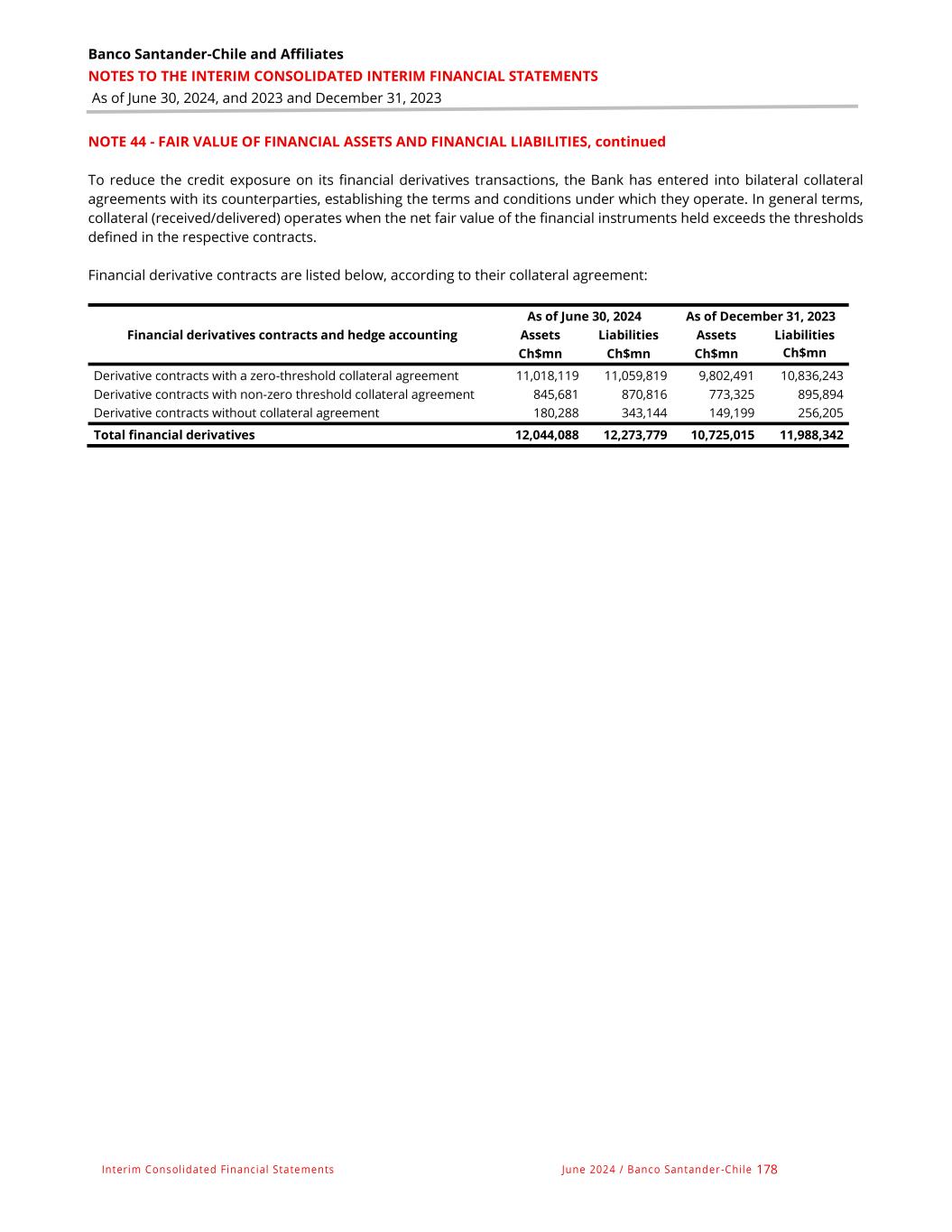 Banco Santander-Chile and Affiliates NOTES TO THE INTERIM CONSOLIDATED INTERIM FINANCIAL STATEMENTS As of June 30, 2024, and 2023 and December 31, 2023 Interim Consolidated Financial Statements June 2024 / Banco Santander -Chile 178 NOTE 44 - FAIR VALUE OF FINANCIAL ASSETS AND FINANCIAL LIABILITIES, continued To reduce the credit exposure on its financial derivatives transactions, the Bank has entered into bilateral collateral agreements with its counterparties, establishing the terms and conditions under which they operate. In general terms, collateral (received/delivered) operates when the net fair value of the financial instruments held exceeds the thresholds defined in the respective contracts. Financial derivative contracts are listed below, according to their collateral agreement: As of June 30, 2024 As of December 31, 2023 Financial derivatives contracts and hedge accounting Assets Liabilities Assets Liabilities Ch$mn Ch$mn Ch$mn Ch$mn Derivative contracts with a zero-threshold collateral agreement 11,018,119 11,059,819 9,802,491 10,836,243 Derivative contracts with non-zero threshold collateral agreement 845,681 870,816 773,325 895,894 Derivative contracts without collateral agreement 180,288 343,144 149,199 256,205 Total financial derivatives 12,044,088 12,273,779 10,725,015 11,988,342