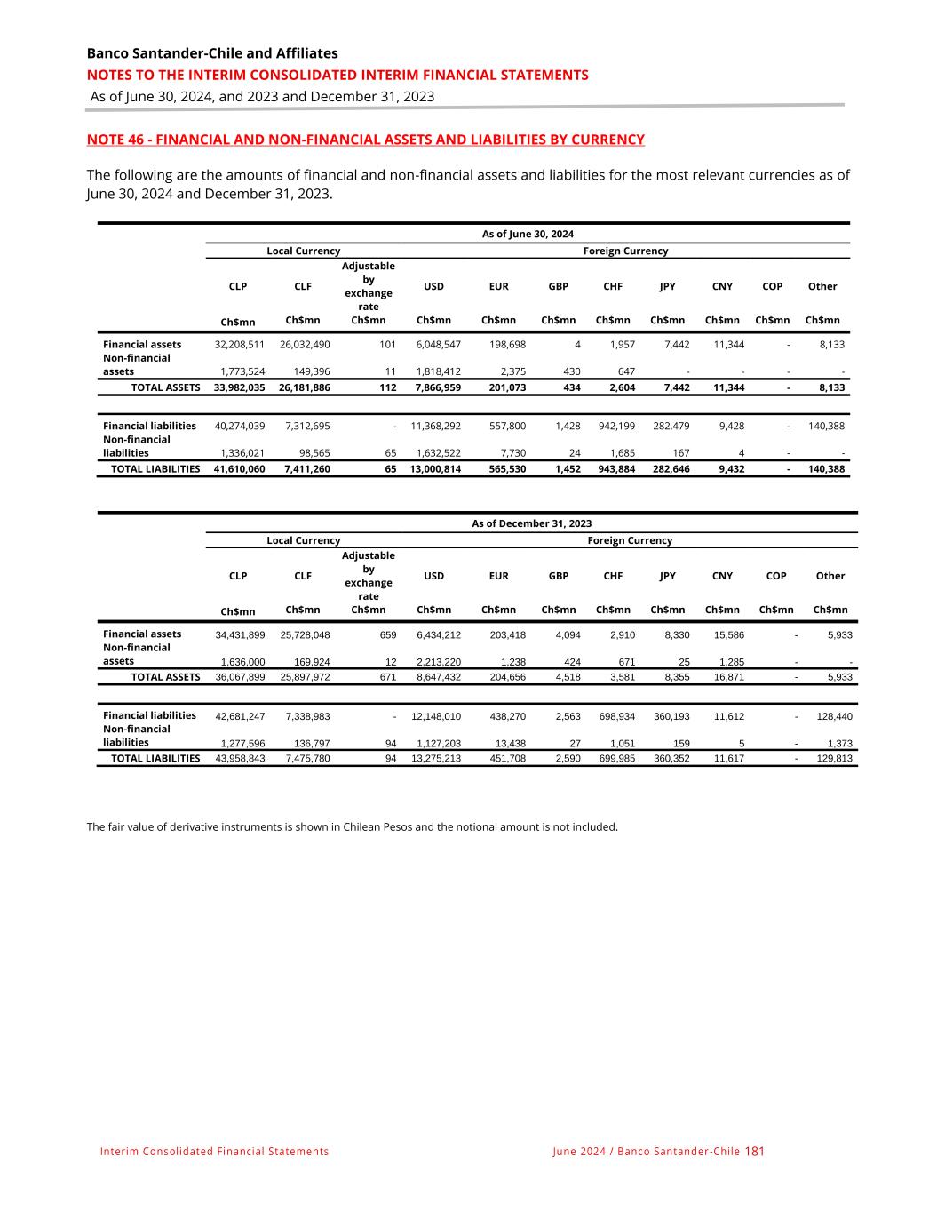 Banco Santander-Chile and Affiliates NOTES TO THE INTERIM CONSOLIDATED INTERIM FINANCIAL STATEMENTS As of June 30, 2024, and 2023 and December 31, 2023 Interim Consolidated Financial Statements June 2024 / Banco Santander -Chile 181 NOTE 46 - FINANCIAL AND NON-FINANCIAL ASSETS AND LIABILITIES BY CURRENCY The following are the amounts of financial and non-financial assets and liabilities for the most relevant currencies as of June 30, 2024 and December 31, 2023. As of June 30, 2024 Local Currency Foreign Currency CLP CLF Adjustable by exchange rate USD EUR GBP CHF JPY CNY COP Other Ch$mn Ch$mn Ch$mn Ch$mn Ch$mn Ch$mn Ch$mn Ch$mn Ch$mn Ch$mn Ch$mn Financial assets 32,208,511 26,032,490 101 6,048,547 198,698 4 1,957 7,442 11,344 - 8,133 Non-financial assets 1,773,524 149,396 11 1,818,412 2,375 430 647 - - - - TOTAL ASSETS 33,982,035 26,181,886 112 7,866,959 201,073 434 2,604 7,442 11,344 - 8,133 Financial liabilities 40,274,039 7,312,695 - 11,368,292 557,800 1,428 942,199 282,479 9,428 - 140,388 Non-financial liabilities 1,336,021 98,565 65 1,632,522 7,730 24 1,685 167 4 - - TOTAL LIABILITIES 41,610,060 7,411,260 65 13,000,814 565,530 1,452 943,884 282,646 9,432 - 140,388 As of December 31, 2023 Local Currency Foreign Currency CLP CLF Adjustable by exchange rate USD EUR GBP CHF JPY CNY COP Other Ch$mn Ch$mn Ch$mn Ch$mn Ch$mn Ch$mn Ch$mn Ch$mn Ch$mn Ch$mn Ch$mn Financial assets 34,431,899 25,728,048 659 6,434,212 203,418 4,094 2,910 8,330 15,586 - 5,933 Non-financial assets 1,636,000 169,924 12 2,213,220 1,238 424 671 25 1,285 - - TOTAL ASSETS 36,067,899 25,897,972 671 8,647,432 204,656 4,518 3,581 8,355 16,871 - 5,933 Financial liabilities 42,681,247 7,338,983 - 12,148,010 438,270 2,563 698,934 360,193 11,612 - 128,440 Non-financial liabilities 1,277,596 136,797 94 1,127,203 13,438 27 1,051 159 5 - 1,373 TOTAL LIABILITIES 43,958,843 7,475,780 94 13,275,213 451,708 2,590 699,985 360,352 11,617 - 129,813 The fair value of derivative instruments is shown in Chilean Pesos and the notional amount is not included.