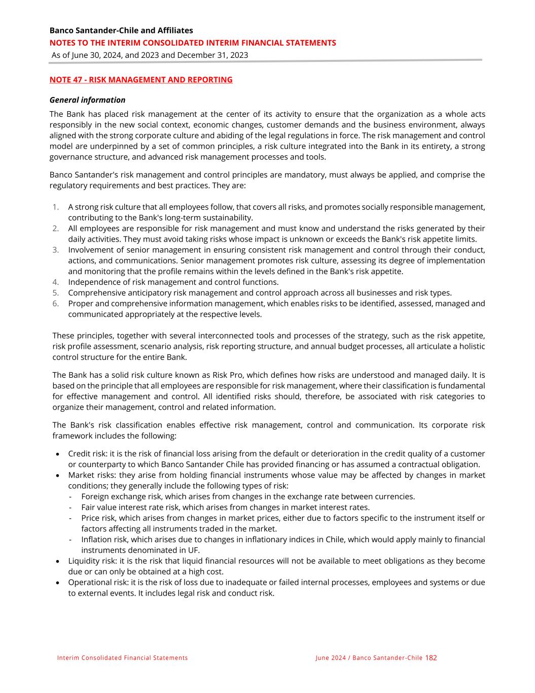 Banco Santander-Chile and Affiliates NOTES TO THE INTERIM CONSOLIDATED INTERIM FINANCIAL STATEMENTS As of June 30, 2024, and 2023 and December 31, 2023 Interim Consolidated Financial Statements June 2024 / Banco Santander -Chile 182 NOTE 47 - RISK MANAGEMENT AND REPORTING General information The Bank has placed risk management at the center of its activity to ensure that the organization as a whole acts responsibly in the new social context, economic changes, customer demands and the business environment, always aligned with the strong corporate culture and abiding of the legal regulations in force. The risk management and control model are underpinned by a set of common principles, a risk culture integrated into the Bank in its entirety, a strong governance structure, and advanced risk management processes and tools. Banco Santander's risk management and control principles are mandatory, must always be applied, and comprise the regulatory requirements and best practices. They are: 1. A strong risk culture that all employees follow, that covers all risks, and promotes socially responsible management, contributing to the Bank's long-term sustainability. 2. All employees are responsible for risk management and must know and understand the risks generated by their daily activities. They must avoid taking risks whose impact is unknown or exceeds the Bank's risk appetite limits. 3. Involvement of senior management in ensuring consistent risk management and control through their conduct, actions, and communications. Senior management promotes risk culture, assessing its degree of implementation and monitoring that the profile remains within the levels defined in the Bank's risk appetite. 4. Independence of risk management and control functions. 5. Comprehensive anticipatory risk management and control approach across all businesses and risk types. 6. Proper and comprehensive information management, which enables risks to be identified, assessed, managed and communicated appropriately at the respective levels. These principles, together with several interconnected tools and processes of the strategy, such as the risk appetite, risk profile assessment, scenario analysis, risk reporting structure, and annual budget processes, all articulate a holistic control structure for the entire Bank. The Bank has a solid risk culture known as Risk Pro, which defines how risks are understood and managed daily. It is based on the principle that all employees are responsible for risk management, where their classification is fundamental for effective management and control. All identified risks should, therefore, be associated with risk categories to organize their management, control and related information. The Bank's risk classification enables effective risk management, control and communication. Its corporate risk framework includes the following: • Credit risk: it is the risk of financial loss arising from the default or deterioration in the credit quality of a customer or counterparty to which Banco Santander Chile has provided financing or has assumed a contractual obligation. • Market risks: they arise from holding financial instruments whose value may be affected by changes in market conditions; they generally include the following types of risk: - Foreign exchange risk, which arises from changes in the exchange rate between currencies. - Fair value interest rate risk, which arises from changes in market interest rates. - Price risk, which arises from changes in market prices, either due to factors specific to the instrument itself or factors affecting all instruments traded in the market. - Inflation risk, which arises due to changes in inflationary indices in Chile, which would apply mainly to financial instruments denominated in UF. • Liquidity risk: it is the risk that liquid financial resources will not be available to meet obligations as they become due or can only be obtained at a high cost. • Operational risk: it is the risk of loss due to inadequate or failed internal processes, employees and systems or due to external events. It includes legal risk and conduct risk.