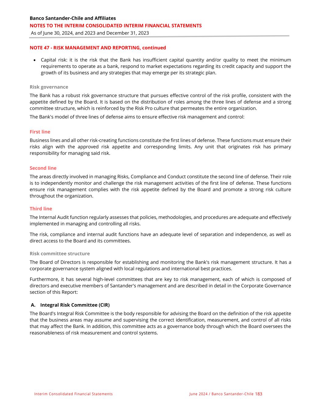 Banco Santander-Chile and Affiliates NOTES TO THE INTERIM CONSOLIDATED INTERIM FINANCIAL STATEMENTS As of June 30, 2024, and 2023 and December 31, 2023 Interim Consolidated Financial Statements June 2024 / Banco Santander -Chile 183 NOTE 47 - RISK MANAGEMENT AND REPORTING, continued • Capital risk: it is the risk that the Bank has insufficient capital quantity and/or quality to meet the minimum requirements to operate as a bank, respond to market expectations regarding its credit capacity and support the growth of its business and any strategies that may emerge per its strategic plan. Risk governance The Bank has a robust risk governance structure that pursues effective control of the risk profile, consistent with the appetite defined by the Board. It is based on the distribution of roles among the three lines of defense and a strong committee structure, which is reinforced by the Risk Pro culture that permeates the entire organization. The Bank's model of three lines of defense aims to ensure effective risk management and control: First line Business lines and all other risk-creating functions constitute the first lines of defense. These functions must ensure their risks align with the approved risk appetite and corresponding limits. Any unit that originates risk has primary responsibility for managing said risk. Second line The areas directly involved in managing Risks, Compliance and Conduct constitute the second line of defense. Their role is to independently monitor and challenge the risk management activities of the first line of defense. These functions ensure risk management complies with the risk appetite defined by the Board and promote a strong risk culture throughout the organization. Third line The Internal Audit function regularly assesses that policies, methodologies, and procedures are adequate and effectively implemented in managing and controlling all risks. The risk, compliance and internal audit functions have an adequate level of separation and independence, as well as direct access to the Board and its committees. Risk committee structure The Board of Directors is responsible for establishing and monitoring the Bank's risk management structure. It has a corporate governance system aligned with local regulations and international best practices. Furthermore, it has several high-level committees that are key to risk management, each of which is composed of directors and executive members of Santander's management and are described in detail in the Corporate Governance section of this Report: A. Integral Risk Committee (CIR) The Board's Integral Risk Committee is the body responsible for advising the Board on the definition of the risk appetite that the business areas may assume and supervising the correct identification, measurement, and control of all risks that may affect the Bank. In addition, this committee acts as a governance body through which the Board oversees the reasonableness of risk measurement and control systems.