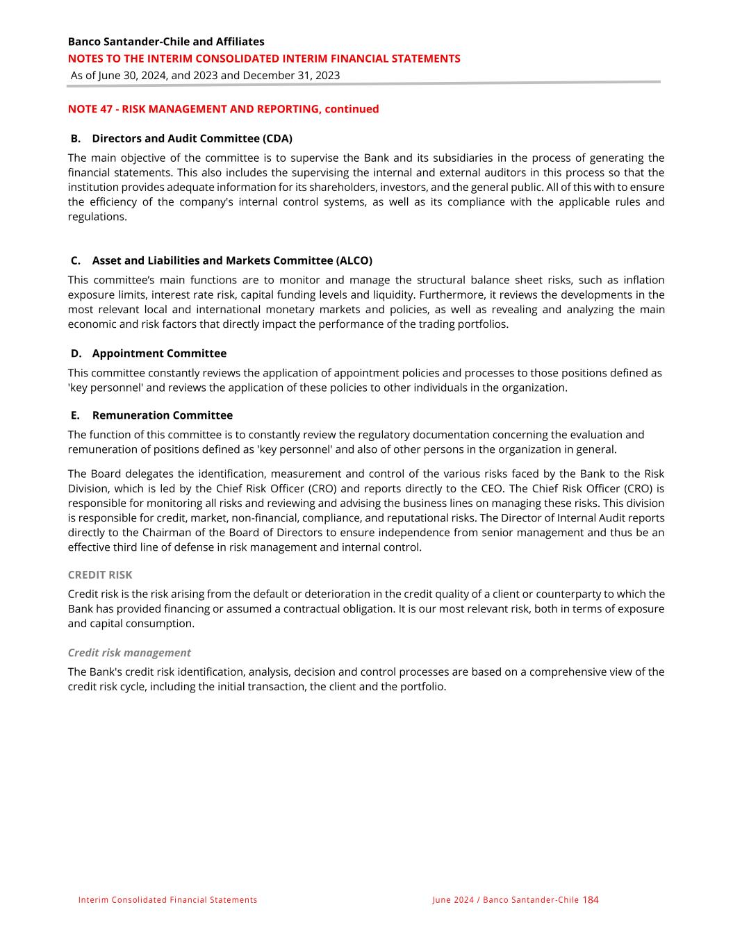 Banco Santander-Chile and Affiliates NOTES TO THE INTERIM CONSOLIDATED INTERIM FINANCIAL STATEMENTS As of June 30, 2024, and 2023 and December 31, 2023 Interim Consolidated Financial Statements June 2024 / Banco Santander -Chile 184 NOTE 47 - RISK MANAGEMENT AND REPORTING, continued B. Directors and Audit Committee (CDA) The main objective of the committee is to supervise the Bank and its subsidiaries in the process of generating the financial statements. This also includes the supervising the internal and external auditors in this process so that the institution provides adequate information for its shareholders, investors, and the general public. All of this with to ensure the efficiency of the company's internal control systems, as well as its compliance with the applicable rules and regulations. C. Asset and Liabilities and Markets Committee (ALCO) This committee’s main functions are to monitor and manage the structural balance sheet risks, such as inflation exposure limits, interest rate risk, capital funding levels and liquidity. Furthermore, it reviews the developments in the most relevant local and international monetary markets and policies, as well as revealing and analyzing the main economic and risk factors that directly impact the performance of the trading portfolios. D. Appointment Committee This committee constantly reviews the application of appointment policies and processes to those positions defined as 'key personnel' and reviews the application of these policies to other individuals in the organization. E. Remuneration Committee The function of this committee is to constantly review the regulatory documentation concerning the evaluation and remuneration of positions defined as 'key personnel' and also of other persons in the organization in general. The Board delegates the identification, measurement and control of the various risks faced by the Bank to the Risk Division, which is led by the Chief Risk Officer (CRO) and reports directly to the CEO. The Chief Risk Officer (CRO) is responsible for monitoring all risks and reviewing and advising the business lines on managing these risks. This division is responsible for credit, market, non-financial, compliance, and reputational risks. The Director of Internal Audit reports directly to the Chairman of the Board of Directors to ensure independence from senior management and thus be an effective third line of defense in risk management and internal control. CREDIT RISK Credit risk is the risk arising from the default or deterioration in the credit quality of a client or counterparty to which the Bank has provided financing or assumed a contractual obligation. It is our most relevant risk, both in terms of exposure and capital consumption. Credit risk management The Bank's credit risk identification, analysis, decision and control processes are based on a comprehensive view of the credit risk cycle, including the initial transaction, the client and the portfolio.
