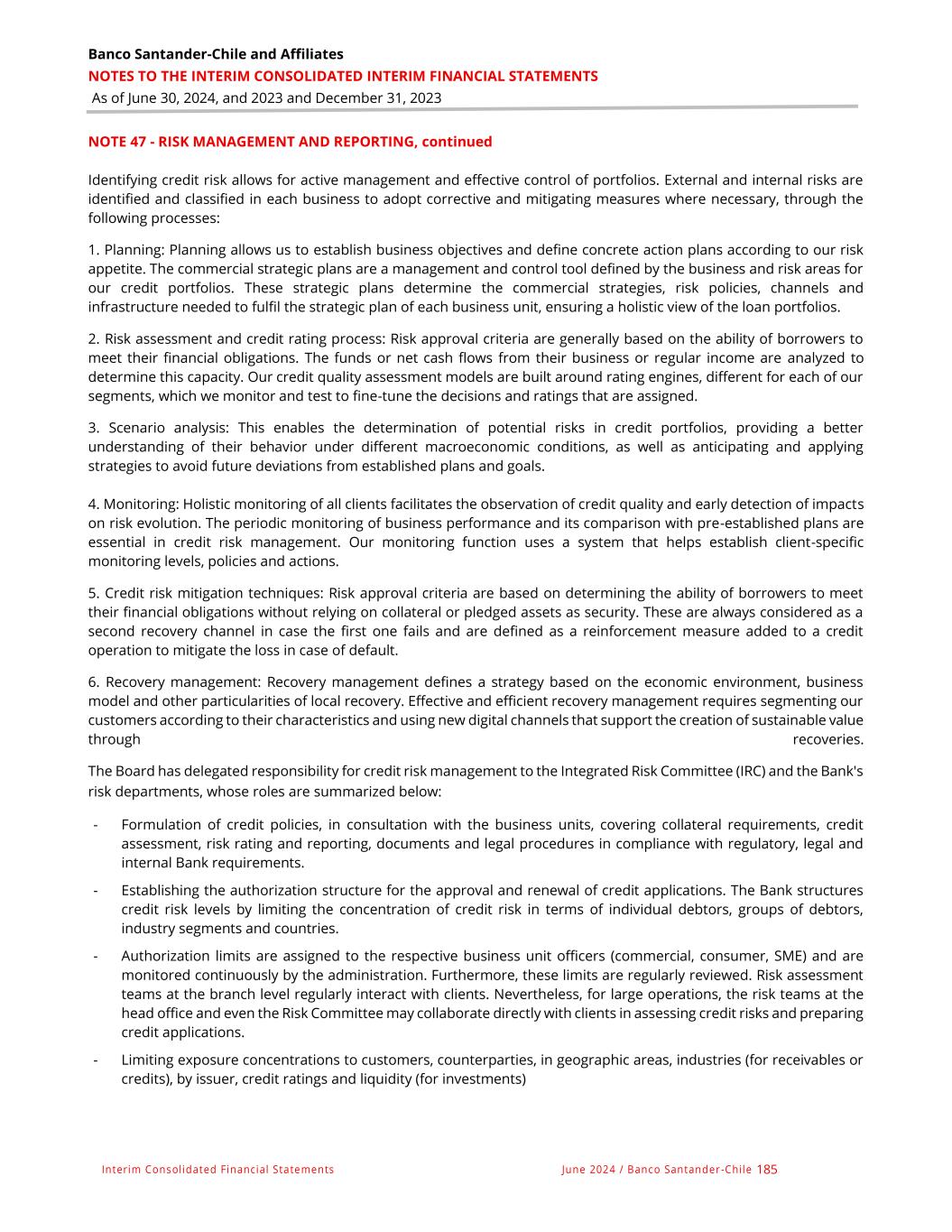 Banco Santander-Chile and Affiliates NOTES TO THE INTERIM CONSOLIDATED INTERIM FINANCIAL STATEMENTS As of June 30, 2024, and 2023 and December 31, 2023 Interim Consolidated Financial Statements June 2024 / Banco Santander -Chile 185 NOTE 47 - RISK MANAGEMENT AND REPORTING, continued Identifying credit risk allows for active management and effective control of portfolios. External and internal risks are identified and classified in each business to adopt corrective and mitigating measures where necessary, through the following processes: 1. Planning: Planning allows us to establish business objectives and define concrete action plans according to our risk appetite. The commercial strategic plans are a management and control tool defined by the business and risk areas for our credit portfolios. These strategic plans determine the commercial strategies, risk policies, channels and infrastructure needed to fulfil the strategic plan of each business unit, ensuring a holistic view of the loan portfolios. 2. Risk assessment and credit rating process: Risk approval criteria are generally based on the ability of borrowers to meet their financial obligations. The funds or net cash flows from their business or regular income are analyzed to determine this capacity. Our credit quality assessment models are built around rating engines, different for each of our segments, which we monitor and test to fine-tune the decisions and ratings that are assigned. 3. Scenario analysis: This enables the determination of potential risks in credit portfolios, providing a better understanding of their behavior under different macroeconomic conditions, as well as anticipating and applying strategies to avoid future deviations from established plans and goals. 4. Monitoring: Holistic monitoring of all clients facilitates the observation of credit quality and early detection of impacts on risk evolution. The periodic monitoring of business performance and its comparison with pre-established plans are essential in credit risk management. Our monitoring function uses a system that helps establish client-specific monitoring levels, policies and actions. 5. Credit risk mitigation techniques: Risk approval criteria are based on determining the ability of borrowers to meet their financial obligations without relying on collateral or pledged assets as security. These are always considered as a second recovery channel in case the first one fails and are defined as a reinforcement measure added to a credit operation to mitigate the loss in case of default. 6. Recovery management: Recovery management defines a strategy based on the economic environment, business model and other particularities of local recovery. Effective and efficient recovery management requires segmenting our customers according to their characteristics and using new digital channels that support the creation of sustainable value through recoveries. The Board has delegated responsibility for credit risk management to the Integrated Risk Committee (IRC) and the Bank's risk departments, whose roles are summarized below: - Formulation of credit policies, in consultation with the business units, covering collateral requirements, credit assessment, risk rating and reporting, documents and legal procedures in compliance with regulatory, legal and internal Bank requirements. - Establishing the authorization structure for the approval and renewal of credit applications. The Bank structures credit risk levels by limiting the concentration of credit risk in terms of individual debtors, groups of debtors, industry segments and countries. - Authorization limits are assigned to the respective business unit officers (commercial, consumer, SME) and are monitored continuously by the administration. Furthermore, these limits are regularly reviewed. Risk assessment teams at the branch level regularly interact with clients. Nevertheless, for large operations, the risk teams at the head office and even the Risk Committee may collaborate directly with clients in assessing credit risks and preparing credit applications. - Limiting exposure concentrations to customers, counterparties, in geographic areas, industries (for receivables or credits), by issuer, credit ratings and liquidity (for investments)