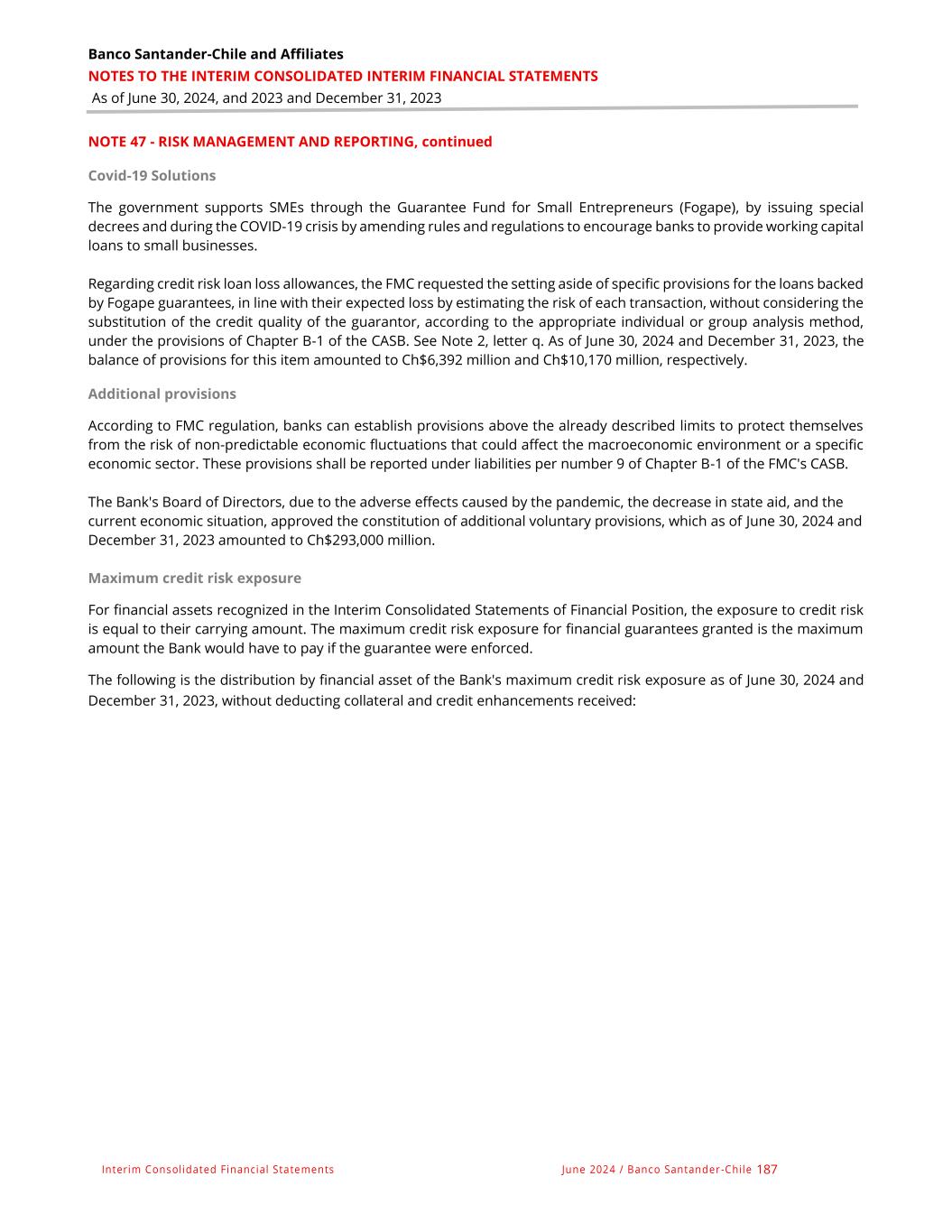 Banco Santander-Chile and Affiliates NOTES TO THE INTERIM CONSOLIDATED INTERIM FINANCIAL STATEMENTS As of June 30, 2024, and 2023 and December 31, 2023 Interim Consolidated Financial Statements June 2024 / Banco Santander -Chile 187 NOTE 47 - RISK MANAGEMENT AND REPORTING, continued Covid-19 Solutions The government supports SMEs through the Guarantee Fund for Small Entrepreneurs (Fogape), by issuing special decrees and during the COVID-19 crisis by amending rules and regulations to encourage banks to provide working capital loans to small businesses. Regarding credit risk loan loss allowances, the FMC requested the setting aside of specific provisions for the loans backed by Fogape guarantees, in line with their expected loss by estimating the risk of each transaction, without considering the substitution of the credit quality of the guarantor, according to the appropriate individual or group analysis method, under the provisions of Chapter B-1 of the CASB. See Note 2, letter q. As of June 30, 2024 and December 31, 2023, the balance of provisions for this item amounted to Ch$6,392 million and Ch$10,170 million, respectively. Additional provisions According to FMC regulation, banks can establish provisions above the already described limits to protect themselves from the risk of non-predictable economic fluctuations that could affect the macroeconomic environment or a specific economic sector. These provisions shall be reported under liabilities per number 9 of Chapter B-1 of the FMC's CASB. The Bank's Board of Directors, due to the adverse effects caused by the pandemic, the decrease in state aid, and the current economic situation, approved the constitution of additional voluntary provisions, which as of June 30, 2024 and December 31, 2023 amounted to Ch$293,000 million. Maximum credit risk exposure For financial assets recognized in the Interim Consolidated Statements of Financial Position, the exposure to credit risk is equal to their carrying amount. The maximum credit risk exposure for financial guarantees granted is the maximum amount the Bank would have to pay if the guarantee were enforced. The following is the distribution by financial asset of the Bank's maximum credit risk exposure as of June 30, 2024 and December 31, 2023, without deducting collateral and credit enhancements received: