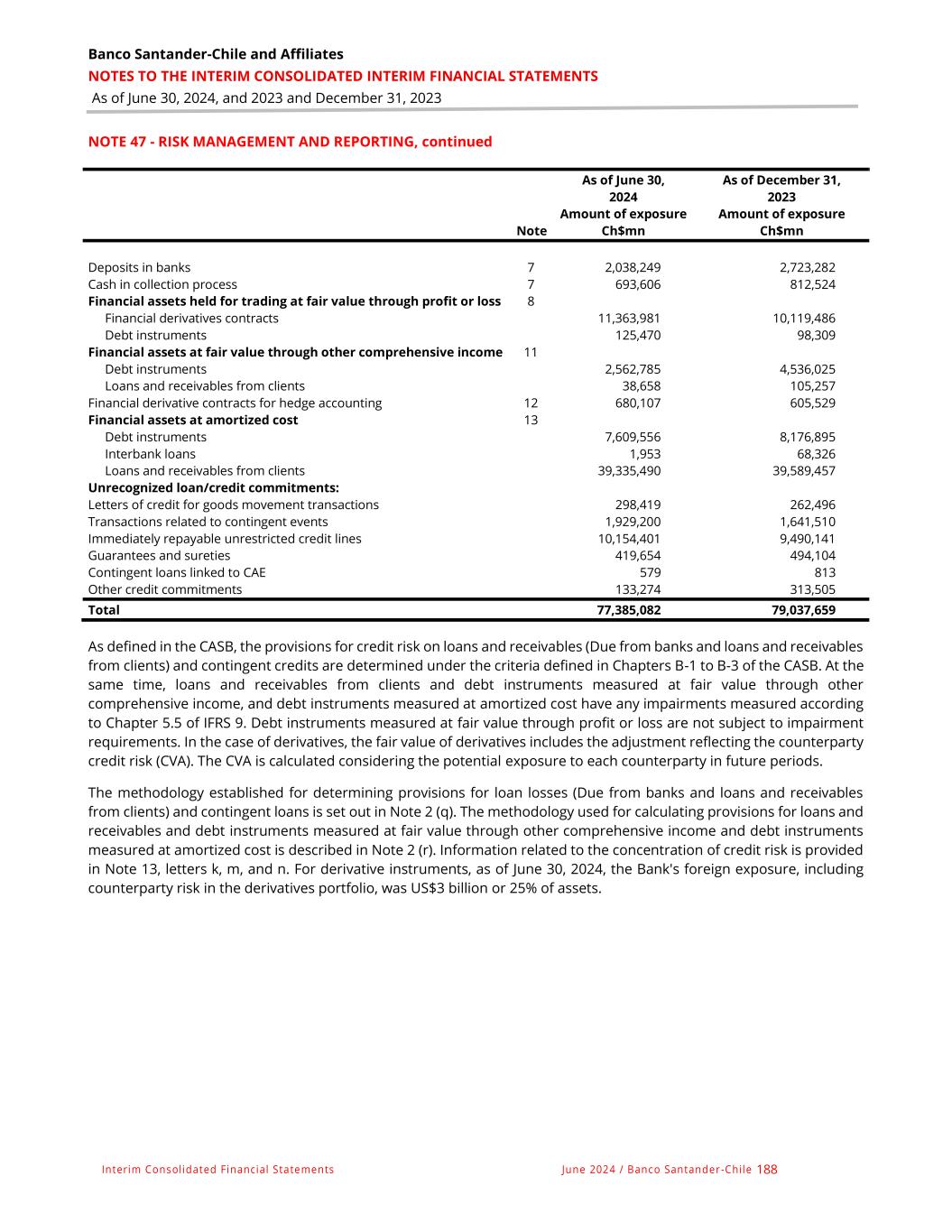 Banco Santander-Chile and Affiliates NOTES TO THE INTERIM CONSOLIDATED INTERIM FINANCIAL STATEMENTS As of June 30, 2024, and 2023 and December 31, 2023 Interim Consolidated Financial Statements June 2024 / Banco Santander -Chile 188 NOTE 47 - RISK MANAGEMENT AND REPORTING, continued As of June 30, 2024 As of December 31, 2023 Amount of exposure Amount of exposure Note Ch$mn Ch$mn Deposits in banks 7 2,038,249 2,723,282 Cash in collection process 7 693,606 812,524 Financial assets held for trading at fair value through profit or loss 8 Financial derivatives contracts 11,363,981 10,119,486 Debt instruments 125,470 98,309 Financial assets at fair value through other comprehensive income 11 Debt instruments 2,562,785 4,536,025 Loans and receivables from clients 38,658 105,257 Financial derivative contracts for hedge accounting 12 680,107 605,529 Financial assets at amortized cost 13 Debt instruments 7,609,556 8,176,895 Interbank loans 1,953 68,326 Loans and receivables from clients 39,335,490 39,589,457 Unrecognized loan/credit commitments: Letters of credit for goods movement transactions 298,419 262,496 Transactions related to contingent events 1,929,200 1,641,510 Immediately repayable unrestricted credit lines 10,154,401 9,490,141 Guarantees and sureties 419,654 494,104 Contingent loans linked to CAE 579 813 Other credit commitments 133,274 313,505 Total 77,385,082 79,037,659 As defined in the CASB, the provisions for credit risk on loans and receivables (Due from banks and loans and receivables from clients) and contingent credits are determined under the criteria defined in Chapters B-1 to B-3 of the CASB. At the same time, loans and receivables from clients and debt instruments measured at fair value through other comprehensive income, and debt instruments measured at amortized cost have any impairments measured according to Chapter 5.5 of IFRS 9. Debt instruments measured at fair value through profit or loss are not subject to impairment requirements. In the case of derivatives, the fair value of derivatives includes the adjustment reflecting the counterparty credit risk (CVA). The CVA is calculated considering the potential exposure to each counterparty in future periods. The methodology established for determining provisions for loan losses (Due from banks and loans and receivables from clients) and contingent loans is set out in Note 2 (q). The methodology used for calculating provisions for loans and receivables and debt instruments measured at fair value through other comprehensive income and debt instruments measured at amortized cost is described in Note 2 (r). Information related to the concentration of credit risk is provided in Note 13, letters k, m, and n. For derivative instruments, as of June 30, 2024, the Bank's foreign exposure, including counterparty risk in the derivatives portfolio, was US$3 billion or 25% of assets.