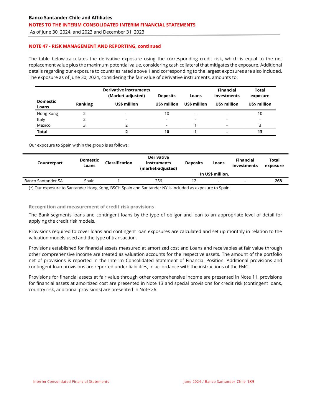 Banco Santander-Chile and Affiliates NOTES TO THE INTERIM CONSOLIDATED INTERIM FINANCIAL STATEMENTS As of June 30, 2024, and 2023 and December 31, 2023 Interim Consolidated Financial Statements June 2024 / Banco Santander -Chile 189 NOTE 47 - RISK MANAGEMENT AND REPORTING, continued The table below calculates the derivative exposure using the corresponding credit risk, which is equal to the net replacement value plus the maximum potential value, considering cash collateral that mitigates the exposure. Additional details regarding our exposure to countries rated above 1 and corresponding to the largest exposures are also included. The exposure as of June 30, 2024, considering the fair value of derivative instruments, amounts to: Derivative instruments Financial Total (Market-adjusted) Deposits Loans investments exposure Domestic Loans Ranking US$ million US$ million US$ million US$ million US$ million Hong Kong 2 - 10 - - 10 Italy 2 - - - - - Mexico 3 2 - 1 - 3 Total 2 10 1 - 13 Our exposure to Spain within the group is as follows: Counterpart Domestic Loans Classification Derivative instruments (market-adjusted) Deposits Loans Financial investments Total exposure In US$ million. Banco Santander SA Spain 1 256 12 - - 268 (*) Our exposure to Santander Hong Kong, BSCH Spain and Santander NY is included as exposure to Spain. Recognition and measurement of credit risk provisions The Bank segments loans and contingent loans by the type of obligor and loan to an appropriate level of detail for applying the credit risk models. Provisions required to cover loans and contingent loan exposures are calculated and set up monthly in relation to the valuation models used and the type of transaction. Provisions established for financial assets measured at amortized cost and Loans and receivables at fair value through other comprehensive income are treated as valuation accounts for the respective assets. The amount of the portfolio net of provisions is reported in the Interim Consolidated Statement of Financial Position. Additional provisions and contingent loan provisions are reported under liabilities, in accordance with the instructions of the FMC. Provisions for financial assets at fair value through other comprehensive income are presented in Note 11, provisions for financial assets at amortized cost are presented in Note 13 and special provisions for credit risk (contingent loans, country risk, additional provisions) are presented in Note 26.