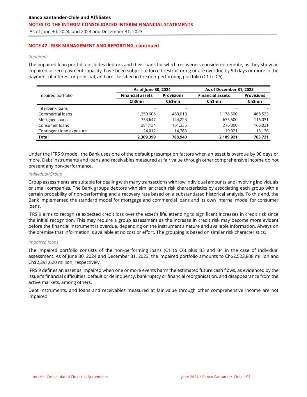 Banco Santander-Chile and Affiliates NOTES TO THE INTERIM CONSOLIDATED INTERIM FINANCIAL STATEMENTS As of June 30, 2024, and 2023 and December 31, 2023 Interim Consolidated Financial Statements June 2024 / Banco Santander -Chile 191 NOTE 47 - RISK MANAGEMENT AND REPORTING, continued Impaired The impaired loan portfolio includes debtors and their loans for which recovery is considered remote, as they show an impaired or zero payment capacity, have been subject to forced restructuring or are overdue by 90 days or more in the payment of interest or principal, and are classified in the non-performing portfolio (C1 to C6). As of June 30, 2024 As of December 31, 2023 Impaired portfolio Financial assets Provisions Financial assets Provisions Ch$mn Ch$mn Ch$mn Ch$mn Interbank loans - - - - Commercial loans 1,250,606 469,019 1,178,500 468,523 Mortgage loans 753,647 144,223 635,500 116,031 Consumer loans 281,134 161,335 276,000 166,031 Contingent loan exposure 24,012 14,363 19,921 13,136 Total 2,309,399 788,940 2,109,921 763,721 Under the IFRS 9 model, the Bank uses one of the default presumption factors when an asset is overdue by 90 days or more. Debt instruments and loans and receivables measured at fair value through other comprehensive income do not present any non-performance. Individual/Group Group assessments are suitable for dealing with many transactions with low individual amounts and involving individuals or small companies. The Bank groups debtors with similar credit risk characteristics by associating each group with a certain probability of non-performing and a recovery rate based on a substantiated historical analysis. To this end, the Bank implemented the standard model for mortgage and commercial loans and its own internal model for consumer loans. IFRS 9 aims to recognise expected credit loss over the asset's life, attending to significant increases in credit risk since the initial recognition. This may require a group assessment as the increase in credit risk may become more evident before the financial instrument is overdue, depending on the instrument's nature and available information. Always on the premise that information is available at no cost or effort. The grouping is based on similar risk characteristics. Impaired loans The impaired portfolio consists of the non-performing loans (C1 to C6) plus B3 and B4 in the case of individual assessment. As of June 30, 2024 and December 31, 2023, the impaired portfolio amounts to Ch$2,523,808 million and Ch$2,291,620 million, respectively. IFRS 9 defines an asset as impaired when one or more events harm the estimated future cash flows, as evidenced by the issuer's financial difficulties, default or delinquency, bankruptcy or financial reorganisation, and disappearance from the active markets, among others. Debt instruments, and loans and receivables measured at fair value through other comprehensive income are not impaired.