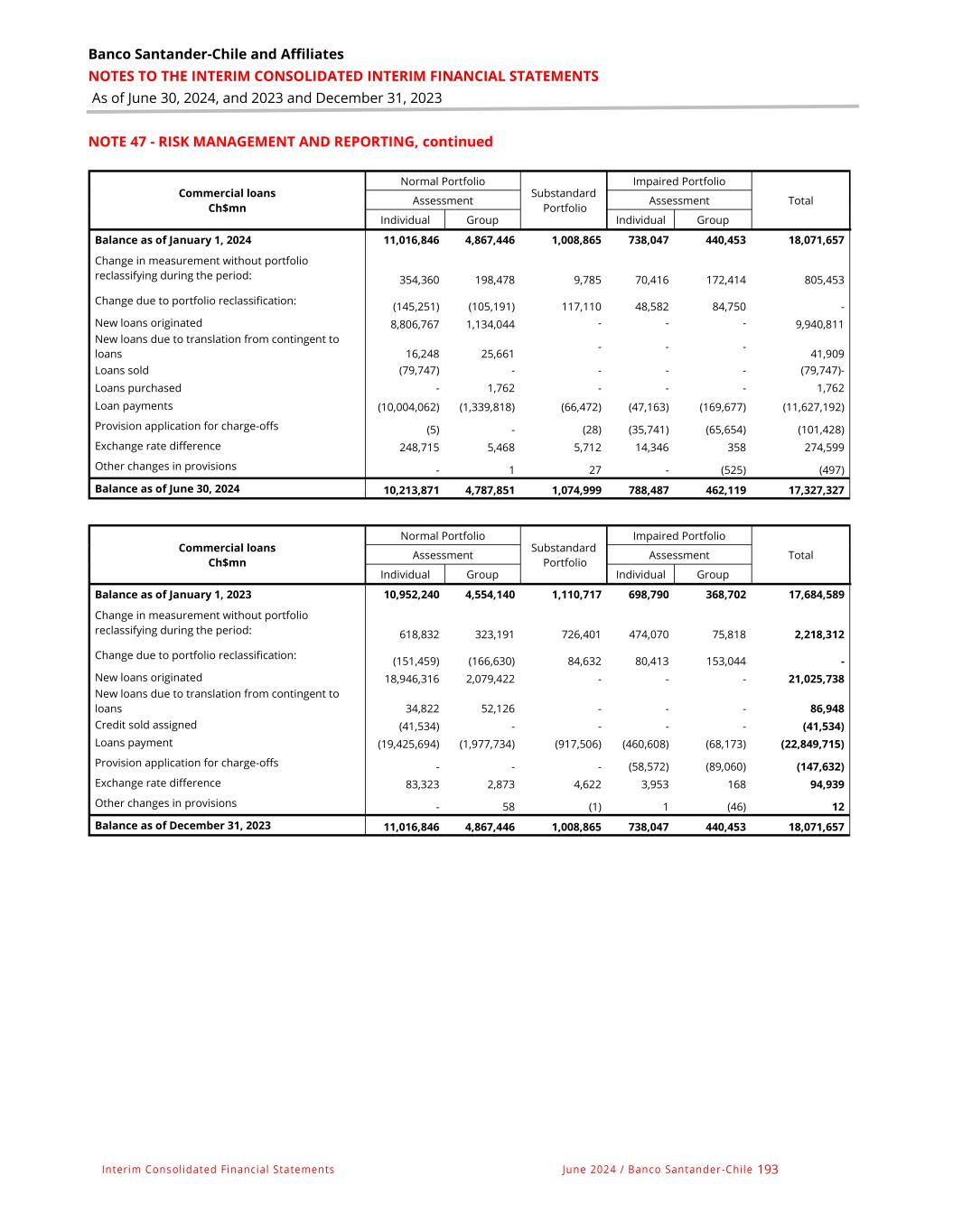 Banco Santander-Chile and Affiliates NOTES TO THE INTERIM CONSOLIDATED INTERIM FINANCIAL STATEMENTS As of June 30, 2024, and 2023 and December 31, 2023 Interim Consolidated Financial Statements June 2024 / Banco Santander -Chile 193 NOTE 47 - RISK MANAGEMENT AND REPORTING, continued Commercial loans Ch$mn Normal Portfolio Substandard Portfolio Impaired Portfolio Total Assessment Assessment Individual Group Individual Group Balance as of January 1, 2024 11,016,846 4,867,446 1,008,865 738,047 440,453 18,071,657 Change in measurement without portfolio reclassifying during the period: 354,360 198,478 9,785 70,416 172,414 805,453 Change due to portfolio reclassification: (145,251) (105,191) 117,110 48,582 84,750 - New loans originated 8,806,767 1,134,044 - - - 9,940,811 New loans due to translation from contingent to loans 16,248 25,661 - - - 41,909 Loans sold (79,747) - - - - (79,747)- Loans purchased - 1,762 - - - 1,762 Loan payments (10,004,062) (1,339,818) (66,472) (47,163) (169,677) (11,627,192) Provision application for charge-offs (5) - (28) (35,741) (65,654) (101,428) Exchange rate difference 248,715 5,468 5,712 14,346 358 274,599 Other changes in provisions - 1 27 - (525) (497) Balance as of June 30, 2024 10,213,871 4,787,851 1,074,999 788,487 462,119 17,327,327 Commercial loans Ch$mn Normal Portfolio Substandard Portfolio Impaired Portfolio Total Assessment Assessment Individual Group Individual Group Balance as of January 1, 2023 10,952,240 4,554,140 1,110,717 698,790 368,702 17,684,589 Change in measurement without portfolio reclassifying during the period: 618,832 323,191 726,401 474,070 75,818 2,218,312 Change due to portfolio reclassification: (151,459) (166,630) 84,632 80,413 153,044 - New loans originated 18,946,316 2,079,422 - - - 21,025,738 New loans due to translation from contingent to loans 34,822 52,126 - - - 86,948 Credit sold assigned (41,534) - - - - (41,534) Loans payment (19,425,694) (1,977,734) (917,506) (460,608) (68,173) (22,849,715) Provision application for charge-offs - - - (58,572) (89,060) (147,632) Exchange rate difference 83,323 2,873 4,622 3,953 168 94,939 Other changes in provisions - 58 (1) 1 (46) 12 Balance as of December 31, 2023 11,016,846 4,867,446 1,008,865 738,047 440,453 18,071,657