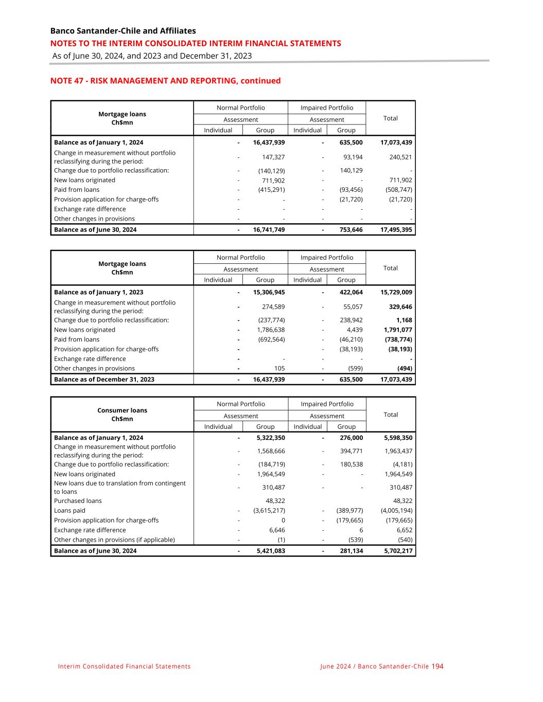 Banco Santander-Chile and Affiliates NOTES TO THE INTERIM CONSOLIDATED INTERIM FINANCIAL STATEMENTS As of June 30, 2024, and 2023 and December 31, 2023 Interim Consolidated Financial Statements June 2024 / Banco Santander -Chile 194 NOTE 47 - RISK MANAGEMENT AND REPORTING, continued Mortgage loans Ch$mn Normal Portfolio Impaired Portfolio Total Assessment Assessment Individual Group Individual Group Balance as of January 1, 2024 - 16,437,939 - 635,500 17,073,439 Change in measurement without portfolio reclassifying during the period: - 147,327 - 93,194 240,521 Change due to portfolio reclassification: - (140,129) - 140,129 - New loans originated - 711,902 - - 711,902 Paid from loans - (415,291) - (93,456) (508,747) Provision application for charge-offs - - - (21,720) (21,720) Exchange rate difference - - - - - Other changes in provisions - - - - - Balance as of June 30, 2024 - 16,741,749 - 753,646 17,495,395 Mortgage loans Ch$mn Normal Portfolio Impaired Portfolio Total Assessment Assessment Individual Group Individual Group Balance as of January 1, 2023 - 15,306,945 - 422,064 15,729,009 Change in measurement without portfolio reclassifying during the period: - 274,589 - 55,057 329,646 Change due to portfolio reclassification: - (237,774) - 238,942 1,168 New loans originated - 1,786,638 - 4,439 1,791,077 Paid from loans - (692,564) - (46,210) (738,774) Provision application for charge-offs - - (38,193) (38,193) Exchange rate difference - - - - - Other changes in provisions - 105 - (599) (494) Balance as of December 31, 2023 - 16,437,939 - 635,500 17,073,439 Consumer loans Ch$mn Normal Portfolio Impaired Portfolio Total Assessment Assessment Individual Group Individual Group Balance as of January 1, 2024 - 5,322,350 - 276,000 5,598,350 Change in measurement without portfolio reclassifying during the period: - 1,568,666 - 394,771 1,963,437 Change due to portfolio reclassification: - (184,719) - 180,538 (4,181) New loans originated - 1,964,549 - - 1,964,549 New loans due to translation from contingent to loans - 310,487 - - 310,487 Purchased loans 48,322 48,322 Loans paid - (3,615,217) - (389,977) (4,005,194) Provision application for charge-offs - 0 - (179,665) (179,665) Exchange rate difference - 6,646 - 6 6,652 Other changes in provisions (if applicable) - (1) - (539) (540) Balance as of June 30, 2024 - 5,421,083 - 281,134 5,702,217
