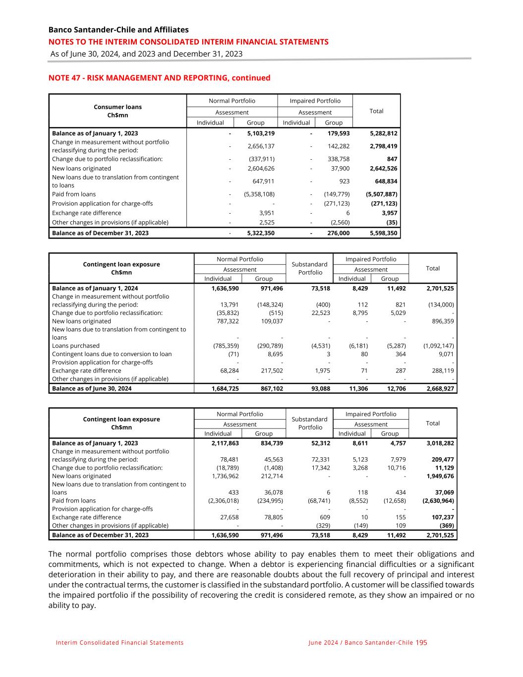 Banco Santander-Chile and Affiliates NOTES TO THE INTERIM CONSOLIDATED INTERIM FINANCIAL STATEMENTS As of June 30, 2024, and 2023 and December 31, 2023 Interim Consolidated Financial Statements June 2024 / Banco Santander -Chile 195 NOTE 47 - RISK MANAGEMENT AND REPORTING, continued Consumer loans Ch$mn Normal Portfolio Impaired Portfolio Total Assessment Assessment Individual Group Individual Group Balance as of January 1, 2023 - 5,103,219 - 179,593 5,282,812 Change in measurement without portfolio reclassifying during the period: - 2,656,137 - 142,282 2,798,419 Change due to portfolio reclassification: - (337,911) - 338,758 847 New loans originated - 2,604,626 - 37,900 2,642,526 New loans due to translation from contingent to loans - 647,911 - 923 648,834 Paid from loans - (5,358,108) - (149,779) (5,507,887) Provision application for charge-offs - - - (271,123) (271,123) Exchange rate difference - 3,951 - 6 3,957 Other changes in provisions (if applicable) - 2,525 - (2,560) (35) Balance as of December 31, 2023 - 5,322,350 - 276,000 5,598,350 Contingent loan exposure Ch$mn Normal Portfolio Substandard Portfolio Impaired Portfolio Total Assessment Assessment Individual Group Individual Group Balance as of January 1, 2024 1,636,590 971,496 73,518 8,429 11,492 2,701,525 Change in measurement without portfolio reclassifying during the period: 13,791 (148,324) (400) 112 821 (134,000) Change due to portfolio reclassification: (35,832) (515) 22,523 8,795 5,029 - New loans originated 787,322 109,037 - - - 896,359 New loans due to translation from contingent to loans - - - - - - Loans purchased (785,359) (290,789) (4,531) (6,181) (5,287) (1,092,147) Contingent loans due to conversion to loan (71) 8,695 3 80 364 9,071 Provision application for charge-offs - - - - - - Exchange rate difference 68,284 217,502 1,975 71 287 288,119 Other changes in provisions (if applicable) - - - - - - Balance as of June 30, 2024 1,684,725 867,102 93,088 11,306 12,706 2,668,927 Contingent loan exposure Ch$mn Normal Portfolio Substandard Portfolio Impaired Portfolio Total Assessment Assessment Individual Group Individual Group Balance as of January 1, 2023 2,117,863 834,739 52,312 8,611 4,757 3,018,282 Change in measurement without portfolio reclassifying during the period: 78,481 45,563 72,331 5,123 7,979 209,477 Change due to portfolio reclassification: (18,789) (1,408) 17,342 3,268 10,716 11,129 New loans originated 1,736,962 212,714 - - - 1,949,676 New loans due to translation from contingent to loans 433 36,078 6 118 434 37,069 Paid from loans (2,306,018) (234,995) (68,741) (8,552) (12,658) (2,630,964) Provision application for charge-offs - - - - - - Exchange rate difference 27,658 78,805 609 10 155 107,237 Other changes in provisions (if applicable) - - (329) (149) 109 (369) Balance as of December 31, 2023 1,636,590 971,496 73,518 8,429 11,492 2,701,525 The normal portfolio comprises those debtors whose ability to pay enables them to meet their obligations and commitments, which is not expected to change. When a debtor is experiencing financial difficulties or a significant deterioration in their ability to pay, and there are reasonable doubts about the full recovery of principal and interest under the contractual terms, the customer is classified in the substandard portfolio. A customer will be classified towards the impaired portfolio if the possibility of recovering the credit is considered remote, as they show an impaired or no ability to pay.