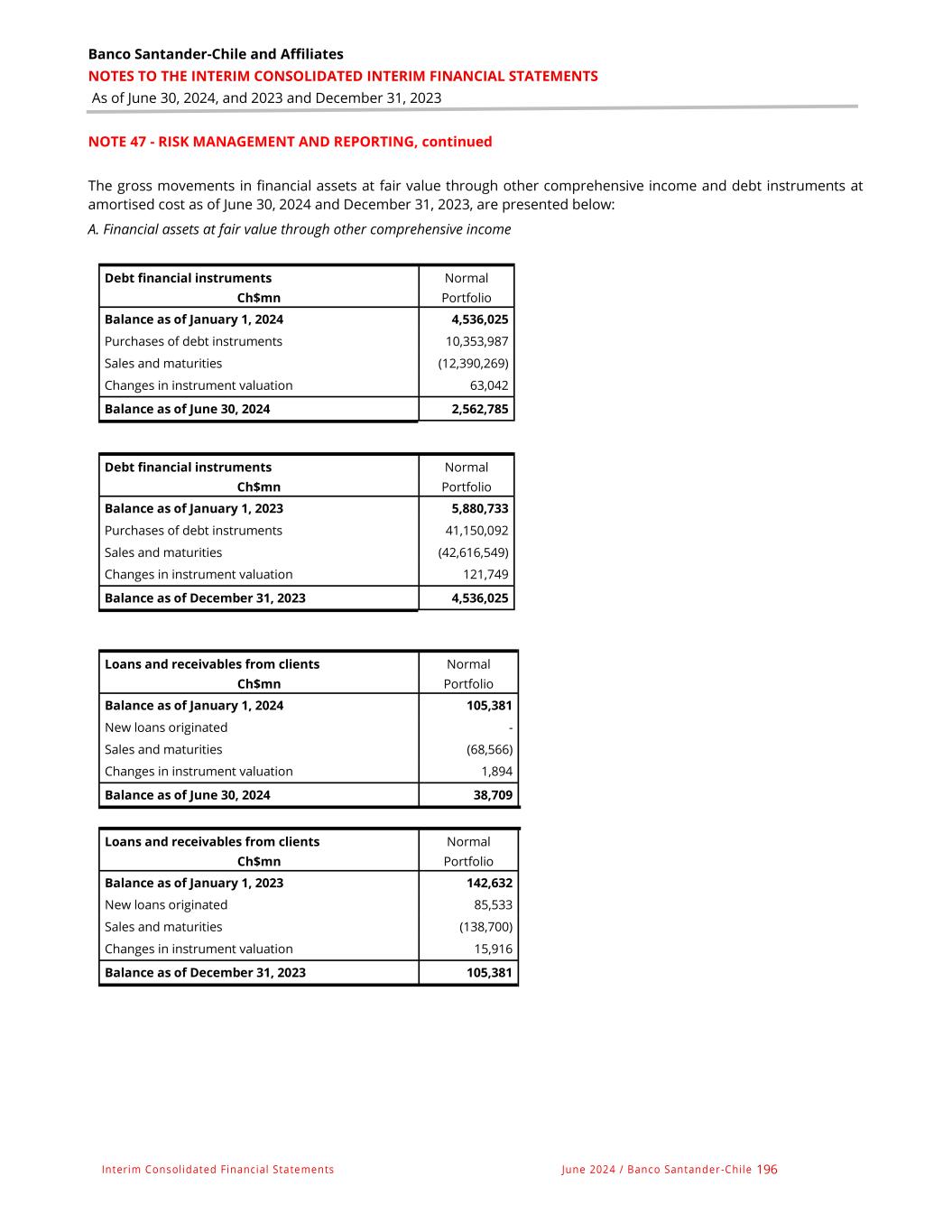 Banco Santander-Chile and Affiliates NOTES TO THE INTERIM CONSOLIDATED INTERIM FINANCIAL STATEMENTS As of June 30, 2024, and 2023 and December 31, 2023 Interim Consolidated Financial Statements June 2024 / Banco Santander -Chile 196 NOTE 47 - RISK MANAGEMENT AND REPORTING, continued The gross movements in financial assets at fair value through other comprehensive income and debt instruments at amortised cost as of June 30, 2024 and December 31, 2023, are presented below: A. Financial assets at fair value through other comprehensive income Loans and receivables from clients Normal Ch$mn Portfolio Balance as of January 1, 2024 105,381 New loans originated - Sales and maturities (68,566) Changes in instrument valuation 1,894 Balance as of June 30, 2024 38,709 Loans and receivables from clients Normal Ch$mn Portfolio Balance as of January 1, 2023 142,632 New loans originated 85,533 Sales and maturities (138,700) Changes in instrument valuation 15,916 Balance as of December 31, 2023 105,381 Debt financial instruments Normal Ch$mn Portfolio Balance as of January 1, 2024 4,536,025 Purchases of debt instruments 10,353,987 Sales and maturities (12,390,269) Changes in instrument valuation 63,042 Balance as of June 30, 2024 2,562,785 Debt financial instruments Normal Ch$mn Portfolio Balance as of January 1, 2023 5,880,733 Purchases of debt instruments 41,150,092 Sales and maturities (42,616,549) Changes in instrument valuation 121,749 Balance as of December 31, 2023 4,536,025