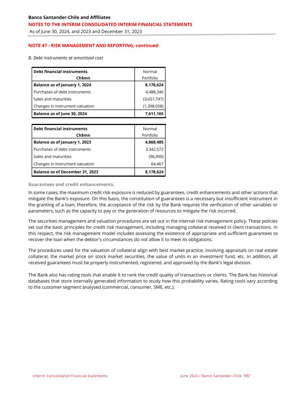 Banco Santander-Chile and Affiliates NOTES TO THE INTERIM CONSOLIDATED INTERIM FINANCIAL STATEMENTS As of June 30, 2024, and 2023 and December 31, 2023 Interim Consolidated Financial Statements June 2024 / Banco Santander -Chile 197 NOTE 47 - RISK MANAGEMENT AND REPORTING, continued B. Debt instruments at amortised cost Guarantees and credit enhancements. In some cases, the maximum credit risk exposure is reduced by guarantees, credit enhancements and other actions that mitigate the Bank's exposure. On this basis, the constitution of guarantees is a necessary but insufficient instrument in the granting of a loan; therefore, the acceptance of the risk by the Bank requires the verification of other variables or parameters, such as the capacity to pay or the generation of resources to mitigate the risk incurred. The securities management and valuation procedures are set out in the internal risk management policy. These policies set out the basic principles for credit risk management, including managing collateral received in client transactions. In this respect, the risk management model includes assessing the existence of appropriate and sufficient guarantees to recover the loan when the debtor's circumstances do not allow it to meet its obligations. The procedures used for the valuation of collateral align with best market practice, involving appraisals on real estate collateral, the market price on stock market securities, the value of units in an investment fund, etc. In addition, all received guarantees must be properly instrumented, registered, and approved by the Bank's legal division. The Bank also has rating tools that enable it to rank the credit quality of transactions or clients. The Bank has historical databases that store internally generated information to study how this probability varies. Rating tools vary according to the customer segment analysed (commercial, consumer, SME, etc.). Debt financial instruments Normal Ch$mn Portfolio Balance as of January 1, 2024 8,178,624 Purchases of debt instruments 4,488,346 Sales and maturities (3,657,747) Changes in instrument valuation (1,398,058) Balance as of June 30, 2024 7,611,165 Debt financial instruments Normal Ch$mn Portfolio Balance as of January 1, 2023 4,868,485 Purchases of debt instruments 3,342,572 Sales and maturities (96,900) Changes in instrument valuation 64,467 Balance as of December 31, 2023 8,178,624