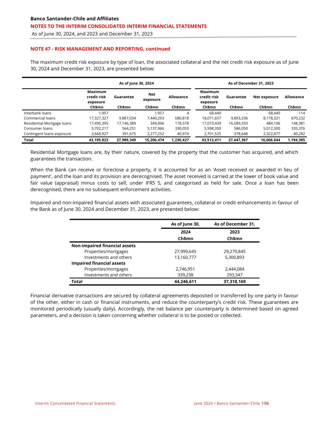 Banco Santander-Chile and Affiliates NOTES TO THE INTERIM CONSOLIDATED INTERIM FINANCIAL STATEMENTS As of June 30, 2024, and 2023 and December 31, 2023 Interim Consolidated Financial Statements June 2024 / Banco Santander -Chile 198 NOTE 47 - RISK MANAGEMENT AND REPORTING, continued The maximum credit risk exposure by type of loan, the associated collateral and the net credit risk exposure as of June 30, 2024 and December 31, 2023, are presented below: As of June 30, 2024 As of December 31, 2023 Maximum credit risk exposure Guarantee Net exposure Allowance Maximum credit risk exposure Guarantee Net exposure Allowance Ch$mn Ch$mn Ch$mn Ch$mn Ch$mn Ch$mn Ch$mn Ch$mn Interbank loans 1,957 - 1,957 4 68,440 - 68,440 114 Commercial loans 17,327,327 9,887,034 7,440,293 680,818 18,071,657 9,893,336 8,178,321 670,232 Residential Mortgage loans 17,495,395 17,146,389 349,006 178,578 17,073,439 16,589,333 484,106 148,381 Consumer loans 5,702,217 564,251 5,137,966 330,053 5,598,350 586,050 5,012,300 335,376 Contingent loans exposure 2,668,927 391,675 2,277,252 40,974 2,701,525 378,648 2,322,877 40,282 Total 43,195,823 27,989,349 15,206,474 1,230,427 43,513,411 27,447,367 16,066,044 1,194,385 Residential Mortgage loans are, by their nature, covered by the property that the customer has acquired, and which guarantees the transaction. When the Bank can receive or foreclose a property, it is accounted for as an 'Asset received or awarded in lieu of payment', and the loan and its provision are derecognised. The asset received is carried at the lower of book value and fair value (appraisal) minus costs to sell, under IFRS 5, and categorised as held for sale. Once a loan has been derecognised, there are no subsequent enforcement activities. Impaired and non-impaired financial assets with associated guarantees, collateral or credit enhancements in favour of the Bank as of June 30, 2024 and December 31, 2023, are presented below: As of June 30, As of December 31, 2024 2023 Ch$mn Ch$mn Non-impaired financial assets Properties/mortgages 27,999,645 29,279,845 Investments and others 13,160,777 5,300,893 Impaired financial assets Properties/mortgages 2,746,951 2,444,084 Investments and others 339,238 293,347 Total 44,246,611 37,318,169 Financial derivative transactions are secured by collateral agreements deposited or transferred by one party in favour of the other, either in cash or financial instruments, and reduce the counterparty's credit risk. These guarantees are monitored periodically (usually daily). Accordingly, the net balance per counterparty is determined based on agreed parameters, and a decision is taken concerning whether collateral is to be posted or collected.