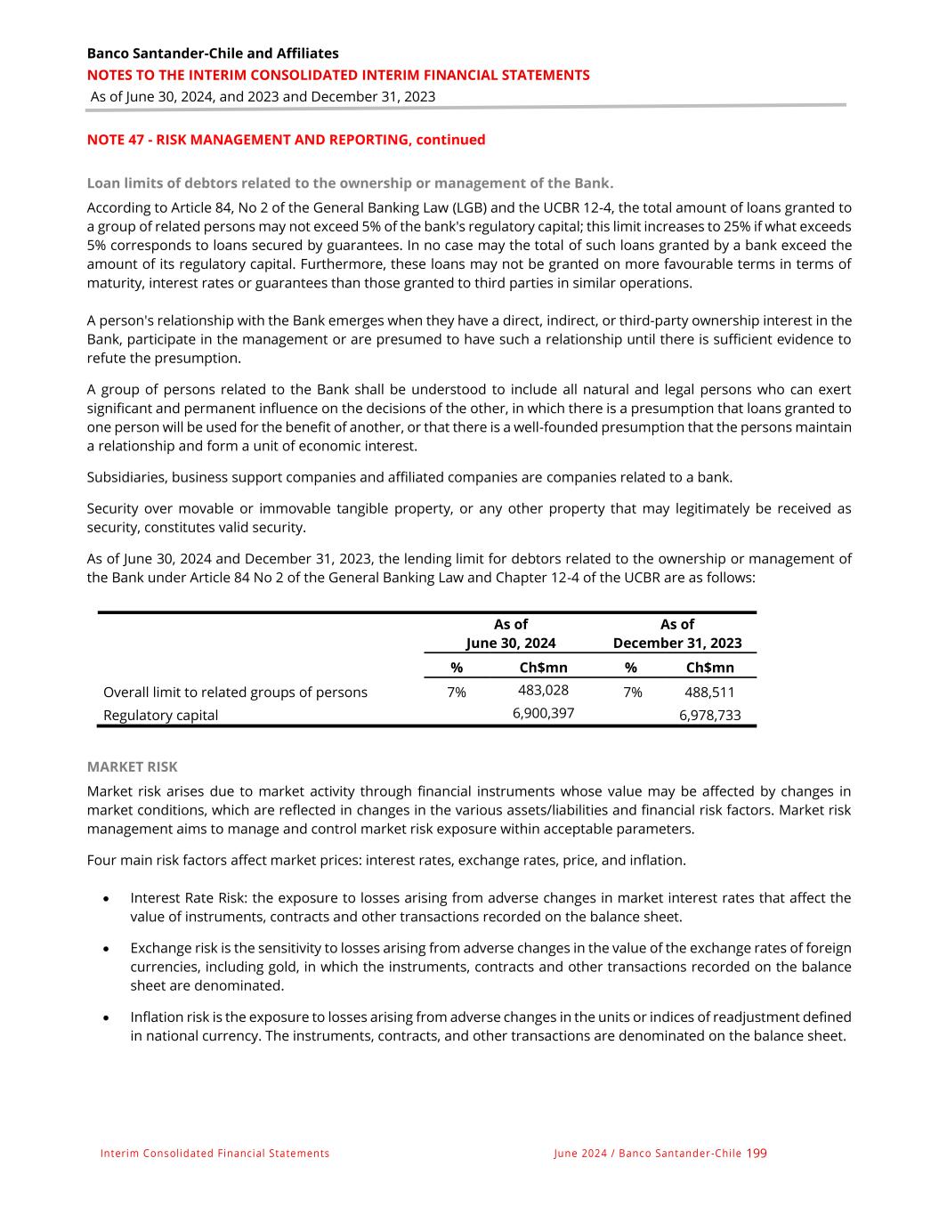 Banco Santander-Chile and Affiliates NOTES TO THE INTERIM CONSOLIDATED INTERIM FINANCIAL STATEMENTS As of June 30, 2024, and 2023 and December 31, 2023 Interim Consolidated Financial Statements June 2024 / Banco Santander -Chile 199 NOTE 47 - RISK MANAGEMENT AND REPORTING, continued Loan limits of debtors related to the ownership or management of the Bank. According to Article 84, No 2 of the General Banking Law (LGB) and the UCBR 12-4, the total amount of loans granted to a group of related persons may not exceed 5% of the bank's regulatory capital; this limit increases to 25% if what exceeds 5% corresponds to loans secured by guarantees. In no case may the total of such loans granted by a bank exceed the amount of its regulatory capital. Furthermore, these loans may not be granted on more favourable terms in terms of maturity, interest rates or guarantees than those granted to third parties in similar operations. A person's relationship with the Bank emerges when they have a direct, indirect, or third-party ownership interest in the Bank, participate in the management or are presumed to have such a relationship until there is sufficient evidence to refute the presumption. A group of persons related to the Bank shall be understood to include all natural and legal persons who can exert significant and permanent influence on the decisions of the other, in which there is a presumption that loans granted to one person will be used for the benefit of another, or that there is a well-founded presumption that the persons maintain a relationship and form a unit of economic interest. Subsidiaries, business support companies and affiliated companies are companies related to a bank. Security over movable or immovable tangible property, or any other property that may legitimately be received as security, constitutes valid security. As of June 30, 2024 and December 31, 2023, the lending limit for debtors related to the ownership or management of the Bank under Article 84 No 2 of the General Banking Law and Chapter 12-4 of the UCBR are as follows: As of June 30, 2024 As of December 31, 2023 % Ch$mn % Ch$mn Overall limit to related groups of persons 7% 483,028 7% 488,511 Regulatory capital 6,900,397 6,978,733 MARKET RISK Market risk arises due to market activity through financial instruments whose value may be affected by changes in market conditions, which are reflected in changes in the various assets/liabilities and financial risk factors. Market risk management aims to manage and control market risk exposure within acceptable parameters. Four main risk factors affect market prices: interest rates, exchange rates, price, and inflation. • Interest Rate Risk: the exposure to losses arising from adverse changes in market interest rates that affect the value of instruments, contracts and other transactions recorded on the balance sheet. • Exchange risk is the sensitivity to losses arising from adverse changes in the value of the exchange rates of foreign currencies, including gold, in which the instruments, contracts and other transactions recorded on the balance sheet are denominated. • Inflation risk is the exposure to losses arising from adverse changes in the units or indices of readjustment defined in national currency. The instruments, contracts, and other transactions are denominated on the balance sheet.
