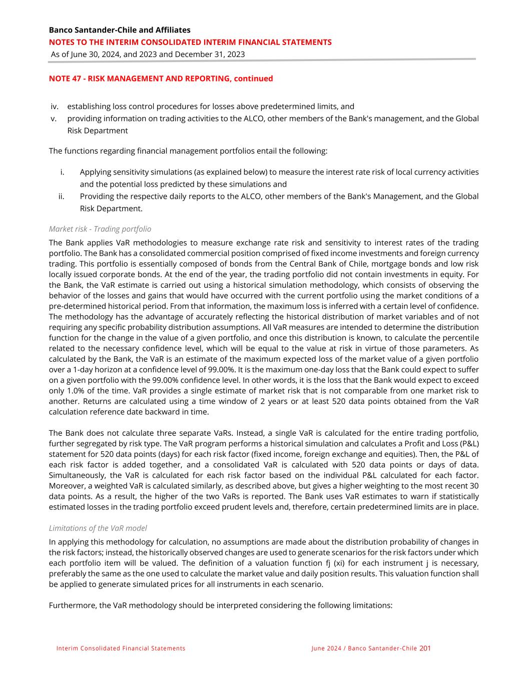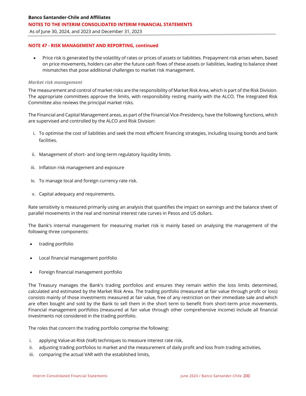 Banco Santander-Chile and Affiliates NOTES TO THE INTERIM CONSOLIDATED INTERIM FINANCIAL STATEMENTS As of June 30, 2024, and 2023 and December 31, 2023 Interim Consolidated Financial Statements June 2024 / Banco Santander -Chile 200 NOTE 47 - RISK MANAGEMENT AND REPORTING, continued • Price risk is generated by the volatility of rates or prices of assets or liabilities. Prepayment risk arises when, based on price movements, holders can alter the future cash flows of these assets or liabilities, leading to balance sheet mismatches that pose additional challenges to market risk management. Market risk management The measurement and control of market risks are the responsibility of Market Risk Area, which is part of the Risk Division. The appropriate committees approve the limits, with responsibility resting mainly with the ALCO. The Integrated Risk Committee also reviews the principal market risks. The Financial and Capital Management areas, as part of the Financial Vice-Presidency, have the following functions, which are supervised and controlled by the ALCO and Risk Division: i. To optimise the cost of liabilities and seek the most efficient financing strategies, including issuing bonds and bank facilities. ii. Management of short- and long-term regulatory liquidity limits. iii. Inflation risk management and exposure iv. To manage local and foreign currency rate risk. v. Capital adequacy and requirements. Rate sensitivity is measured primarily using an analysis that quantifies the impact on earnings and the balance sheet of parallel movements in the real and nominal interest rate curves in Pesos and US dollars. The Bank's internal management for measuring market risk is mainly based on analysing the management of the following three components: • trading portfolio • Local financial management portfolio • Foreign financial management portfolio The Treasury manages the Bank's trading portfolios and ensures they remain within the loss limits determined, calculated and estimated by the Market Risk Area. The trading portfolio (measured at fair value through profit or loss) consists mainly of those investments measured at fair value, free of any restriction on their immediate sale and which are often bought and sold by the Bank to sell them in the short term to benefit from short-term price movements. Financial management portfolios (measured at fair value through other comprehensive income) include all financial investments not considered in the trading portfolio. The roles that concern the trading portfolio comprise the following: i. applying Value-at-Risk (VaR) techniques to measure interest rate risk, ii. adjusting trading portfolios to market and the measurement of daily profit and loss from trading activities, iii. comparing the actual VAR with the established limits,