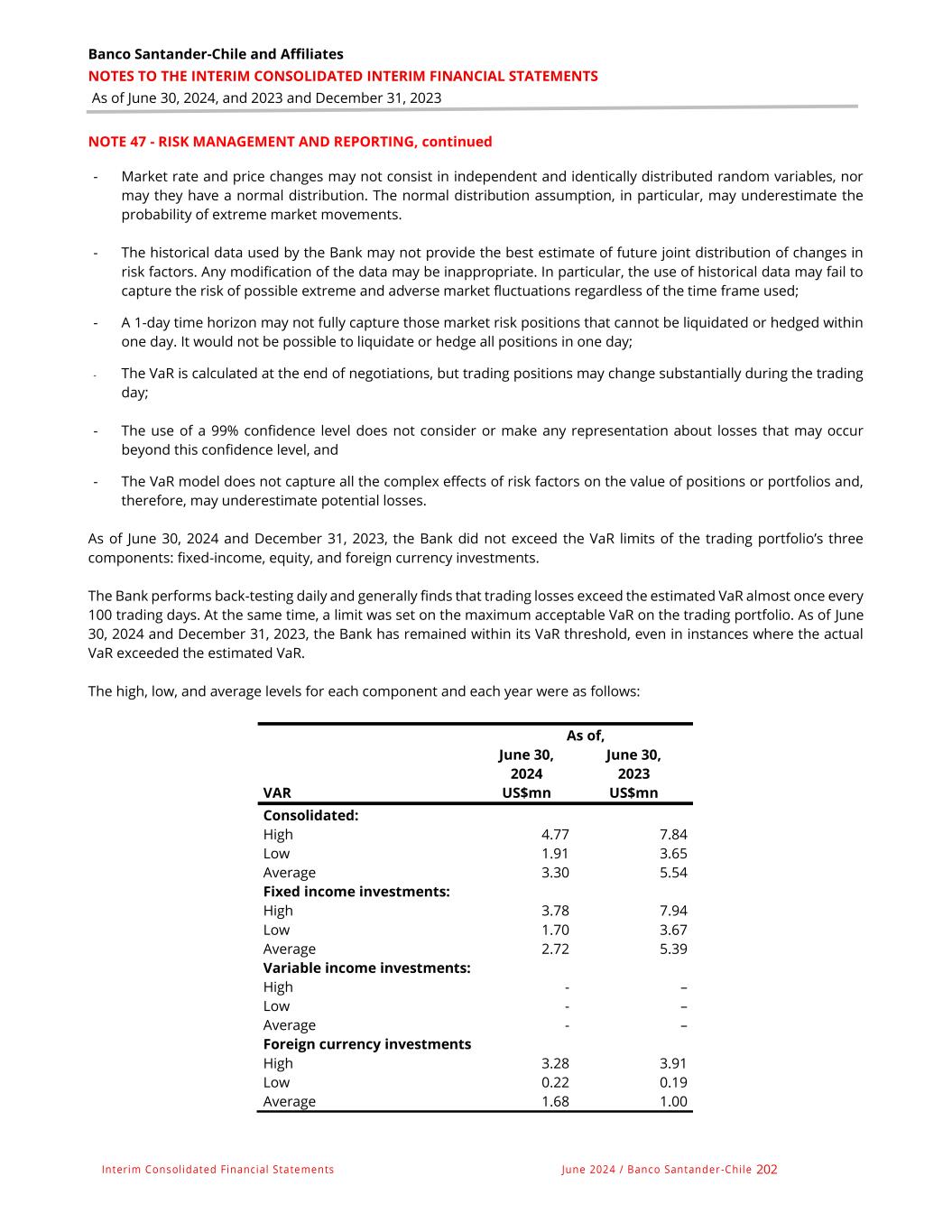 Banco Santander-Chile and Affiliates NOTES TO THE INTERIM CONSOLIDATED INTERIM FINANCIAL STATEMENTS As of June 30, 2024, and 2023 and December 31, 2023 Interim Consolidated Financial Statements June 2024 / Banco Santander -Chile 202 NOTE 47 - RISK MANAGEMENT AND REPORTING, continued - Market rate and price changes may not consist in independent and identically distributed random variables, nor may they have a normal distribution. The normal distribution assumption, in particular, may underestimate the probability of extreme market movements. - The historical data used by the Bank may not provide the best estimate of future joint distribution of changes in risk factors. Any modification of the data may be inappropriate. In particular, the use of historical data may fail to capture the risk of possible extreme and adverse market fluctuations regardless of the time frame used; - A 1-day time horizon may not fully capture those market risk positions that cannot be liquidated or hedged within one day. It would not be possible to liquidate or hedge all positions in one day; - The VaR is calculated at the end of negotiations, but trading positions may change substantially during the trading day; - The use of a 99% confidence level does not consider or make any representation about losses that may occur beyond this confidence level, and - The VaR model does not capture all the complex effects of risk factors on the value of positions or portfolios and, therefore, may underestimate potential losses. As of June 30, 2024 and December 31, 2023, the Bank did not exceed the VaR limits of the trading portfolio’s three components: fixed-income, equity, and foreign currency investments. The Bank performs back-testing daily and generally finds that trading losses exceed the estimated VaR almost once every 100 trading days. At the same time, a limit was set on the maximum acceptable VaR on the trading portfolio. As of June 30, 2024 and December 31, 2023, the Bank has remained within its VaR threshold, even in instances where the actual VaR exceeded the estimated VaR. The high, low, and average levels for each component and each year were as follows: As of, June 30, 2024 June 30, 2023 VAR US$mn US$mn Consolidated: High 4.77 7.84 Low 1.91 3.65 Average 3.30 5.54 Fixed income investments: High 3.78 7.94 Low 1.70 3.67 Average 2.72 5.39 Variable income investments: High - – Low - – Average - – Foreign currency investments High 3.28 3.91 Low 0.22 0.19 Average 1.68 1.00