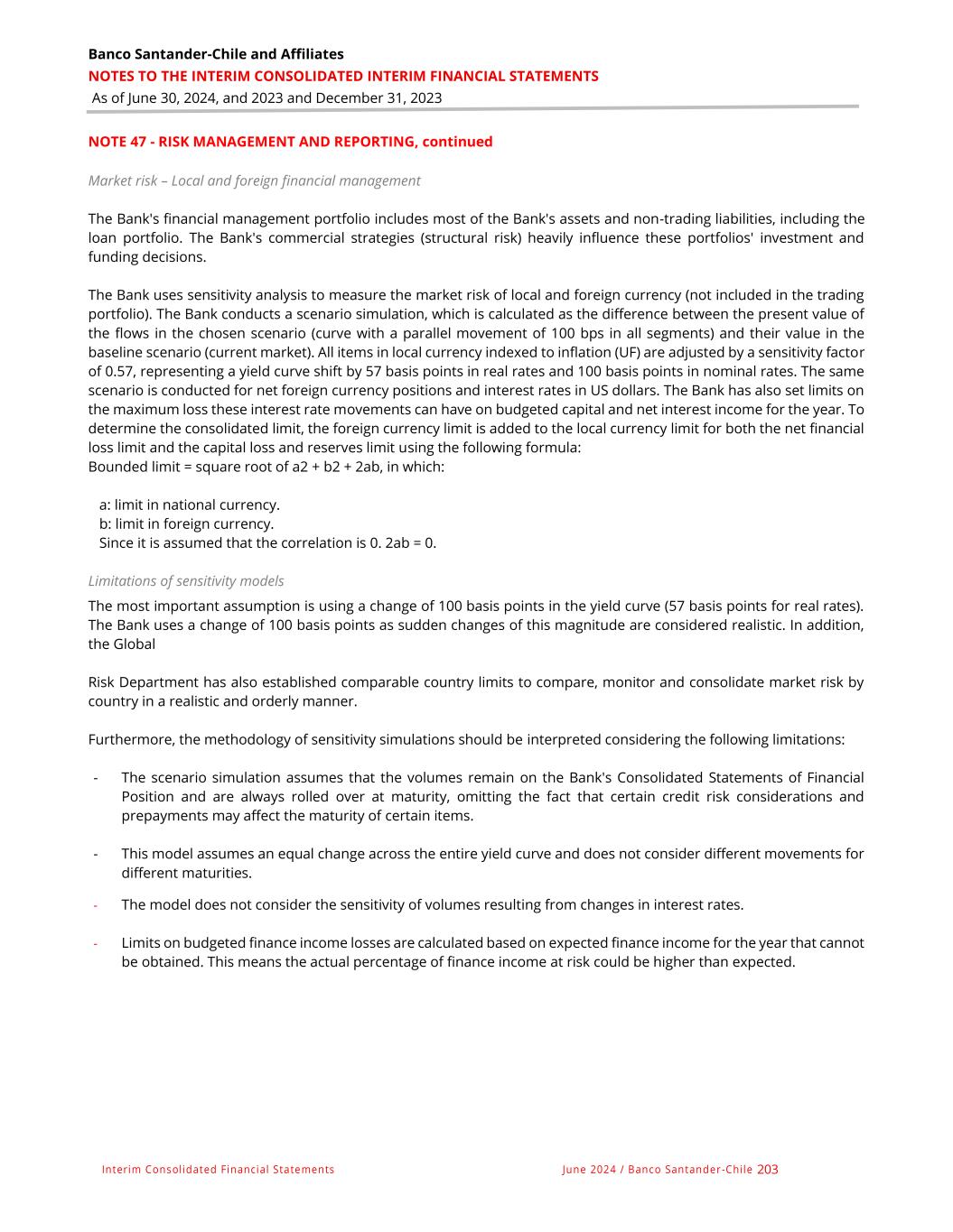 Banco Santander-Chile and Affiliates NOTES TO THE INTERIM CONSOLIDATED INTERIM FINANCIAL STATEMENTS As of June 30, 2024, and 2023 and December 31, 2023 Interim Consolidated Financial Statements June 2024 / Banco Santander -Chile 203 NOTE 47 - RISK MANAGEMENT AND REPORTING, continued Market risk – Local and foreign financial management The Bank's financial management portfolio includes most of the Bank's assets and non-trading liabilities, including the loan portfolio. The Bank's commercial strategies (structural risk) heavily influence these portfolios' investment and funding decisions. The Bank uses sensitivity analysis to measure the market risk of local and foreign currency (not included in the trading portfolio). The Bank conducts a scenario simulation, which is calculated as the difference between the present value of the flows in the chosen scenario (curve with a parallel movement of 100 bps in all segments) and their value in the baseline scenario (current market). All items in local currency indexed to inflation (UF) are adjusted by a sensitivity factor of 0.57, representing a yield curve shift by 57 basis points in real rates and 100 basis points in nominal rates. The same scenario is conducted for net foreign currency positions and interest rates in US dollars. The Bank has also set limits on the maximum loss these interest rate movements can have on budgeted capital and net interest income for the year. To determine the consolidated limit, the foreign currency limit is added to the local currency limit for both the net financial loss limit and the capital loss and reserves limit using the following formula: Bounded limit = square root of a2 + b2 + 2ab, in which: a: limit in national currency. b: limit in foreign currency. Since it is assumed that the correlation is 0. 2ab = 0. Limitations of sensitivity models The most important assumption is using a change of 100 basis points in the yield curve (57 basis points for real rates). The Bank uses a change of 100 basis points as sudden changes of this magnitude are considered realistic. In addition, the Global Risk Department has also established comparable country limits to compare, monitor and consolidate market risk by country in a realistic and orderly manner. Furthermore, the methodology of sensitivity simulations should be interpreted considering the following limitations: - The scenario simulation assumes that the volumes remain on the Bank's Consolidated Statements of Financial Position and are always rolled over at maturity, omitting the fact that certain credit risk considerations and prepayments may affect the maturity of certain items. - This model assumes an equal change across the entire yield curve and does not consider different movements for different maturities. - The model does not consider the sensitivity of volumes resulting from changes in interest rates. - Limits on budgeted finance income losses are calculated based on expected finance income for the year that cannot be obtained. This means the actual percentage of finance income at risk could be higher than expected.