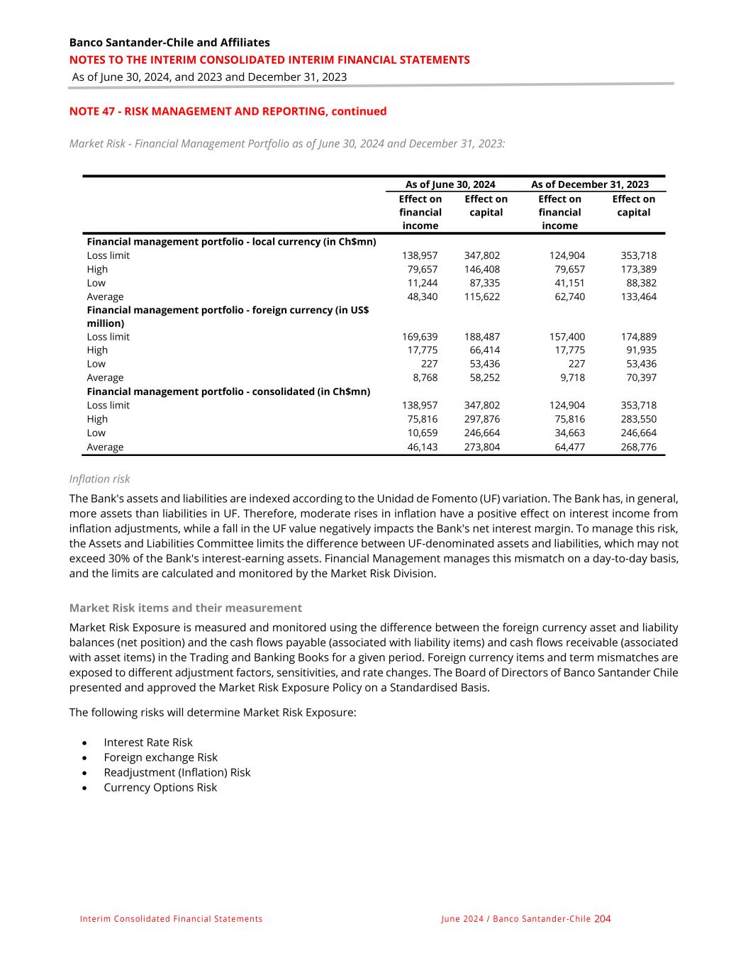 Banco Santander-Chile and Affiliates NOTES TO THE INTERIM CONSOLIDATED INTERIM FINANCIAL STATEMENTS As of June 30, 2024, and 2023 and December 31, 2023 Interim Consolidated Financial Statements June 2024 / Banco Santander -Chile 204 NOTE 47 - RISK MANAGEMENT AND REPORTING, continued Market Risk - Financial Management Portfolio as of June 30, 2024 and December 31, 2023: As of June 30, 2024 As of December 31, 2023 Effect on financial income Effect on capital Effect on financial income Effect on capital Financial management portfolio - local currency (in Ch$mn) Loss limit 138,957 347,802 124,904 353,718 High 79,657 146,408 79,657 173,389 Low 11,244 87,335 41,151 88,382 Average 48,340 115,622 62,740 133,464 Financial management portfolio - foreign currency (in US$ million) Loss limit 169,639 188,487 157,400 174,889 High 17,775 66,414 17,775 91,935 Low 227 53,436 227 53,436 Average 8,768 58,252 9,718 70,397 Financial management portfolio - consolidated (in Ch$mn) Loss limit 138,957 347,802 124,904 353,718 High 75,816 297,876 75,816 283,550 Low 10,659 246,664 34,663 246,664 Average 46,143 273,804 64,477 268,776 Inflation risk The Bank's assets and liabilities are indexed according to the Unidad de Fomento (UF) variation. The Bank has, in general, more assets than liabilities in UF. Therefore, moderate rises in inflation have a positive effect on interest income from inflation adjustments, while a fall in the UF value negatively impacts the Bank's net interest margin. To manage this risk, the Assets and Liabilities Committee limits the difference between UF-denominated assets and liabilities, which may not exceed 30% of the Bank's interest-earning assets. Financial Management manages this mismatch on a day-to-day basis, and the limits are calculated and monitored by the Market Risk Division. Market Risk items and their measurement Market Risk Exposure is measured and monitored using the difference between the foreign currency asset and liability balances (net position) and the cash flows payable (associated with liability items) and cash flows receivable (associated with asset items) in the Trading and Banking Books for a given period. Foreign currency items and term mismatches are exposed to different adjustment factors, sensitivities, and rate changes. The Board of Directors of Banco Santander Chile presented and approved the Market Risk Exposure Policy on a Standardised Basis. The following risks will determine Market Risk Exposure: • Interest Rate Risk • Foreign exchange Risk • Readjustment (Inflation) Risk • Currency Options Risk