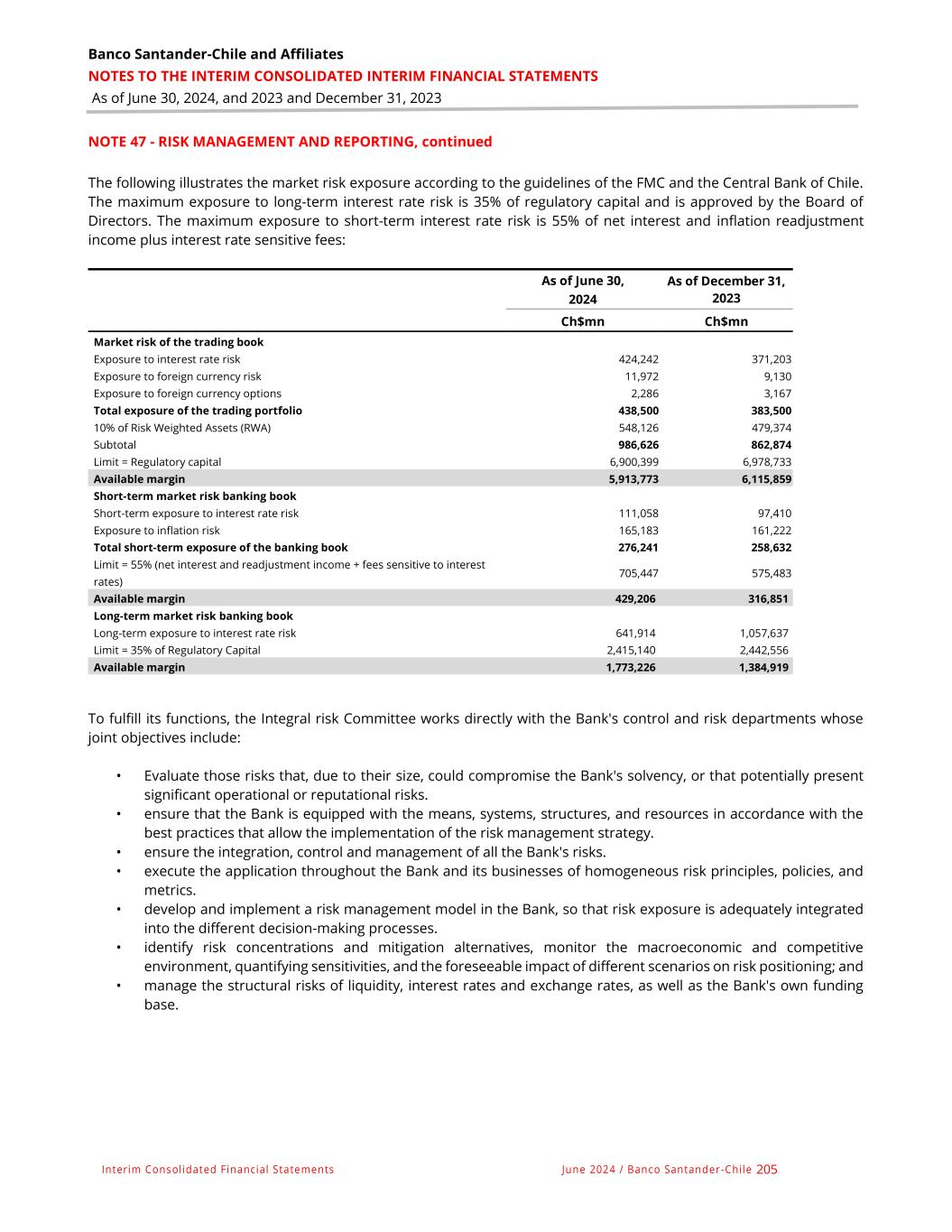 Banco Santander-Chile and Affiliates NOTES TO THE INTERIM CONSOLIDATED INTERIM FINANCIAL STATEMENTS As of June 30, 2024, and 2023 and December 31, 2023 Interim Consolidated Financial Statements June 2024 / Banco Santander -Chile 205 NOTE 47 - RISK MANAGEMENT AND REPORTING, continued The following illustrates the market risk exposure according to the guidelines of the FMC and the Central Bank of Chile. The maximum exposure to long-term interest rate risk is 35% of regulatory capital and is approved by the Board of Directors. The maximum exposure to short-term interest rate risk is 55% of net interest and inflation readjustment income plus interest rate sensitive fees: As of June 30, 2024 As of December 31, 2023 Ch$mn Ch$mn Market risk of the trading book Exposure to interest rate risk 424,242 371,203 Exposure to foreign currency risk 11,972 9,130 Exposure to foreign currency options 2,286 3,167 Total exposure of the trading portfolio 438,500 383,500 10% of Risk Weighted Assets (RWA) 548,126 479,374 Subtotal 986,626 862,874 Limit = Regulatory capital 6,900,399 6,978,733 Available margin 5,913,773 6,115,859 Short-term market risk banking book Short-term exposure to interest rate risk 111,058 97,410 Exposure to inflation risk 165,183 161,222 Total short-term exposure of the banking book 276,241 258,632 Limit = 55% (net interest and readjustment income + fees sensitive to interest rates) 705,447 575,483 Available margin 429,206 316,851 Long-term market risk banking book Long-term exposure to interest rate risk 641,914 1,057,637 Limit = 35% of Regulatory Capital 2,415,140 2,442,556 Available margin 1,773,226 1,384,919 To fulfill its functions, the Integral risk Committee works directly with the Bank's control and risk departments whose joint objectives include: • Evaluate those risks that, due to their size, could compromise the Bank's solvency, or that potentially present significant operational or reputational risks. • ensure that the Bank is equipped with the means, systems, structures, and resources in accordance with the best practices that allow the implementation of the risk management strategy. • ensure the integration, control and management of all the Bank's risks. • execute the application throughout the Bank and its businesses of homogeneous risk principles, policies, and metrics. • develop and implement a risk management model in the Bank, so that risk exposure is adequately integrated into the different decision-making processes. • identify risk concentrations and mitigation alternatives, monitor the macroeconomic and competitive environment, quantifying sensitivities, and the foreseeable impact of different scenarios on risk positioning; and • manage the structural risks of liquidity, interest rates and exchange rates, as well as the Bank's own funding base.