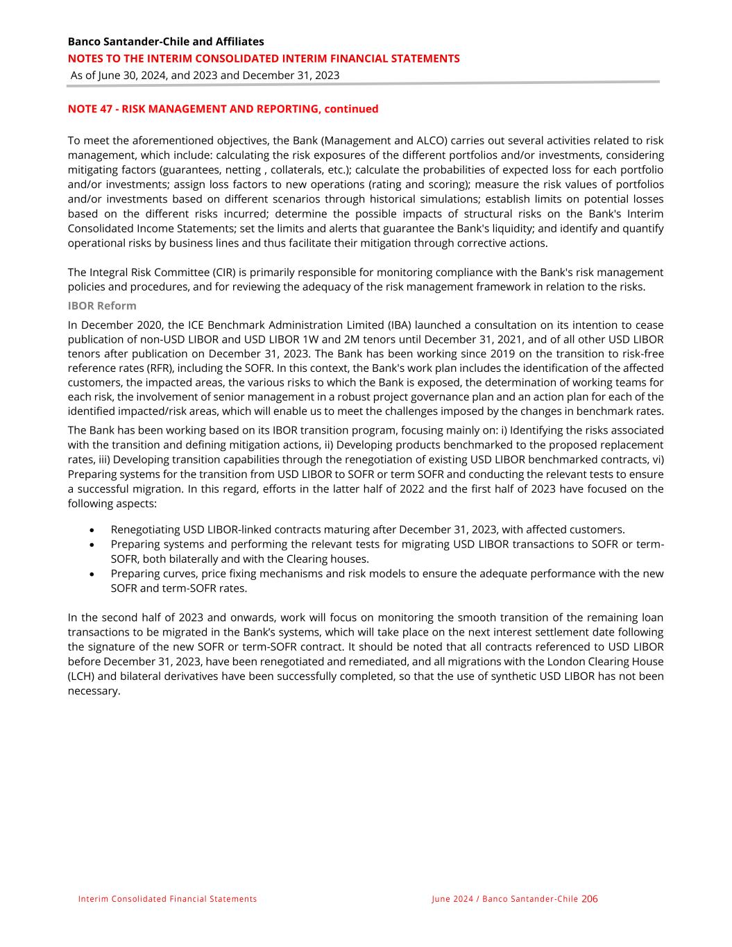 Banco Santander-Chile and Affiliates NOTES TO THE INTERIM CONSOLIDATED INTERIM FINANCIAL STATEMENTS As of June 30, 2024, and 2023 and December 31, 2023 Interim Consolidated Financial Statements June 2024 / Banco Santander -Chile 206 NOTE 47 - RISK MANAGEMENT AND REPORTING, continued To meet the aforementioned objectives, the Bank (Management and ALCO) carries out several activities related to risk management, which include: calculating the risk exposures of the different portfolios and/or investments, considering mitigating factors (guarantees, netting , collaterals, etc.); calculate the probabilities of expected loss for each portfolio and/or investments; assign loss factors to new operations (rating and scoring); measure the risk values of portfolios and/or investments based on different scenarios through historical simulations; establish limits on potential losses based on the different risks incurred; determine the possible impacts of structural risks on the Bank's Interim Consolidated Income Statements; set the limits and alerts that guarantee the Bank's liquidity; and identify and quantify operational risks by business lines and thus facilitate their mitigation through corrective actions. The Integral Risk Committee (CIR) is primarily responsible for monitoring compliance with the Bank's risk management policies and procedures, and for reviewing the adequacy of the risk management framework in relation to the risks. IBOR Reform In December 2020, the ICE Benchmark Administration Limited (IBA) launched a consultation on its intention to cease publication of non-USD LIBOR and USD LIBOR 1W and 2M tenors until December 31, 2021, and of all other USD LIBOR tenors after publication on December 31, 2023. The Bank has been working since 2019 on the transition to risk-free reference rates (RFR), including the SOFR. In this context, the Bank's work plan includes the identification of the affected customers, the impacted areas, the various risks to which the Bank is exposed, the determination of working teams for each risk, the involvement of senior management in a robust project governance plan and an action plan for each of the identified impacted/risk areas, which will enable us to meet the challenges imposed by the changes in benchmark rates. The Bank has been working based on its IBOR transition program, focusing mainly on: i) Identifying the risks associated with the transition and defining mitigation actions, ii) Developing products benchmarked to the proposed replacement rates, iii) Developing transition capabilities through the renegotiation of existing USD LIBOR benchmarked contracts, vi) Preparing systems for the transition from USD LIBOR to SOFR or term SOFR and conducting the relevant tests to ensure a successful migration. In this regard, efforts in the latter half of 2022 and the first half of 2023 have focused on the following aspects: • Renegotiating USD LIBOR-linked contracts maturing after December 31, 2023, with affected customers. • Preparing systems and performing the relevant tests for migrating USD LIBOR transactions to SOFR or term- SOFR, both bilaterally and with the Clearing houses. • Preparing curves, price fixing mechanisms and risk models to ensure the adequate performance with the new SOFR and term-SOFR rates. In the second half of 2023 and onwards, work will focus on monitoring the smooth transition of the remaining loan transactions to be migrated in the Bank’s systems, which will take place on the next interest settlement date following the signature of the new SOFR or term-SOFR contract. It should be noted that all contracts referenced to USD LIBOR before December 31, 2023, have been renegotiated and remediated, and all migrations with the London Clearing House (LCH) and bilateral derivatives have been successfully completed, so that the use of synthetic USD LIBOR has not been necessary.