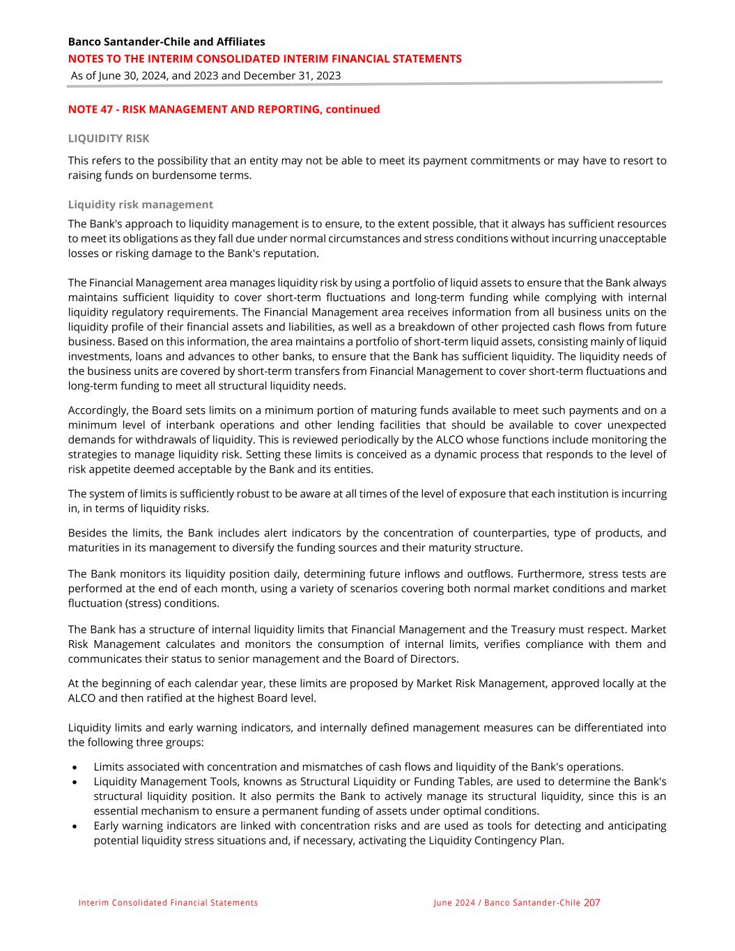 Banco Santander-Chile and Affiliates NOTES TO THE INTERIM CONSOLIDATED INTERIM FINANCIAL STATEMENTS As of June 30, 2024, and 2023 and December 31, 2023 Interim Consolidated Financial Statements June 2024 / Banco Santander -Chile 207 NOTE 47 - RISK MANAGEMENT AND REPORTING, continued LIQUIDITY RISK This refers to the possibility that an entity may not be able to meet its payment commitments or may have to resort to raising funds on burdensome terms. Liquidity risk management The Bank's approach to liquidity management is to ensure, to the extent possible, that it always has sufficient resources to meet its obligations as they fall due under normal circumstances and stress conditions without incurring unacceptable losses or risking damage to the Bank's reputation. The Financial Management area manages liquidity risk by using a portfolio of liquid assets to ensure that the Bank always maintains sufficient liquidity to cover short-term fluctuations and long-term funding while complying with internal liquidity regulatory requirements. The Financial Management area receives information from all business units on the liquidity profile of their financial assets and liabilities, as well as a breakdown of other projected cash flows from future business. Based on this information, the area maintains a portfolio of short-term liquid assets, consisting mainly of liquid investments, loans and advances to other banks, to ensure that the Bank has sufficient liquidity. The liquidity needs of the business units are covered by short-term transfers from Financial Management to cover short-term fluctuations and long-term funding to meet all structural liquidity needs. Accordingly, the Board sets limits on a minimum portion of maturing funds available to meet such payments and on a minimum level of interbank operations and other lending facilities that should be available to cover unexpected demands for withdrawals of liquidity. This is reviewed periodically by the ALCO whose functions include monitoring the strategies to manage liquidity risk. Setting these limits is conceived as a dynamic process that responds to the level of risk appetite deemed acceptable by the Bank and its entities. The system of limits is sufficiently robust to be aware at all times of the level of exposure that each institution is incurring in, in terms of liquidity risks. Besides the limits, the Bank includes alert indicators by the concentration of counterparties, type of products, and maturities in its management to diversify the funding sources and their maturity structure. The Bank monitors its liquidity position daily, determining future inflows and outflows. Furthermore, stress tests are performed at the end of each month, using a variety of scenarios covering both normal market conditions and market fluctuation (stress) conditions. The Bank has a structure of internal liquidity limits that Financial Management and the Treasury must respect. Market Risk Management calculates and monitors the consumption of internal limits, verifies compliance with them and communicates their status to senior management and the Board of Directors. At the beginning of each calendar year, these limits are proposed by Market Risk Management, approved locally at the ALCO and then ratified at the highest Board level. Liquidity limits and early warning indicators, and internally defined management measures can be differentiated into the following three groups: • Limits associated with concentration and mismatches of cash flows and liquidity of the Bank's operations. • Liquidity Management Tools, knowns as Structural Liquidity or Funding Tables, are used to determine the Bank's structural liquidity position. It also permits the Bank to actively manage its structural liquidity, since this is an essential mechanism to ensure a permanent funding of assets under optimal conditions. • Early warning indicators are linked with concentration risks and are used as tools for detecting and anticipating potential liquidity stress situations and, if necessary, activating the Liquidity Contingency Plan.