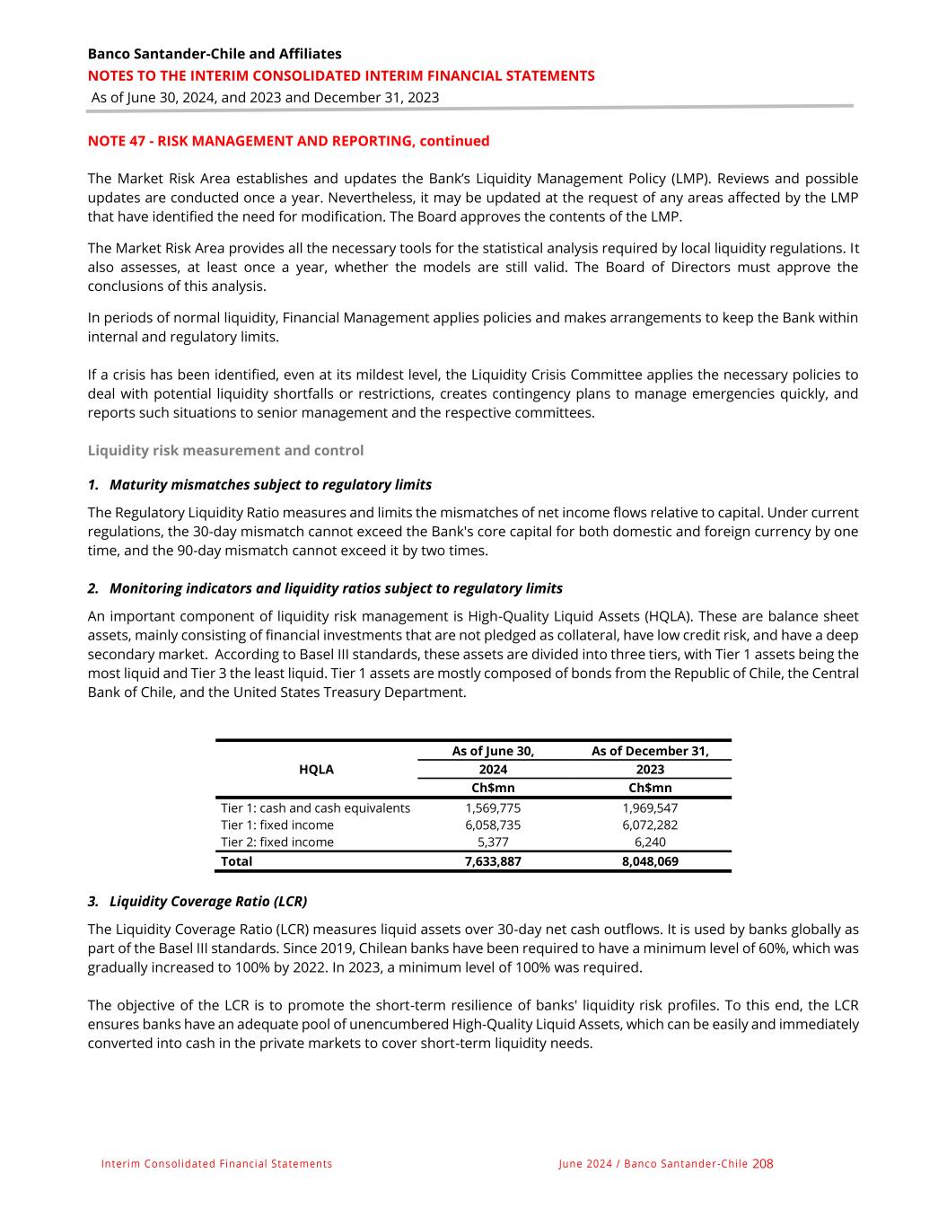 Banco Santander-Chile and Affiliates NOTES TO THE INTERIM CONSOLIDATED INTERIM FINANCIAL STATEMENTS As of June 30, 2024, and 2023 and December 31, 2023 Interim Consolidated Financial Statements June 2024 / Banco Santander -Chile 208 NOTE 47 - RISK MANAGEMENT AND REPORTING, continued The Market Risk Area establishes and updates the Bank’s Liquidity Management Policy (LMP). Reviews and possible updates are conducted once a year. Nevertheless, it may be updated at the request of any areas affected by the LMP that have identified the need for modification. The Board approves the contents of the LMP. The Market Risk Area provides all the necessary tools for the statistical analysis required by local liquidity regulations. It also assesses, at least once a year, whether the models are still valid. The Board of Directors must approve the conclusions of this analysis. In periods of normal liquidity, Financial Management applies policies and makes arrangements to keep the Bank within internal and regulatory limits. If a crisis has been identified, even at its mildest level, the Liquidity Crisis Committee applies the necessary policies to deal with potential liquidity shortfalls or restrictions, creates contingency plans to manage emergencies quickly, and reports such situations to senior management and the respective committees. Liquidity risk measurement and control 1. Maturity mismatches subject to regulatory limits The Regulatory Liquidity Ratio measures and limits the mismatches of net income flows relative to capital. Under current regulations, the 30-day mismatch cannot exceed the Bank's core capital for both domestic and foreign currency by one time, and the 90-day mismatch cannot exceed it by two times. 2. Monitoring indicators and liquidity ratios subject to regulatory limits An important component of liquidity risk management is High-Quality Liquid Assets (HQLA). These are balance sheet assets, mainly consisting of financial investments that are not pledged as collateral, have low credit risk, and have a deep secondary market. According to Basel III standards, these assets are divided into three tiers, with Tier 1 assets being the most liquid and Tier 3 the least liquid. Tier 1 assets are mostly composed of bonds from the Republic of Chile, the Central Bank of Chile, and the United States Treasury Department. As of June 30, As of December 31, HQLA 2024 2023 Ch$mn Ch$mn Tier 1: cash and cash equivalents 1,569,775 1,969,547 Tier 1: fixed income 6,058,735 6,072,282 Tier 2: fixed income 5,377 6,240 Total 7,633,887 8,048,069 3. Liquidity Coverage Ratio (LCR) The Liquidity Coverage Ratio (LCR) measures liquid assets over 30-day net cash outflows. It is used by banks globally as part of the Basel III standards. Since 2019, Chilean banks have been required to have a minimum level of 60%, which was gradually increased to 100% by 2022. In 2023, a minimum level of 100% was required. The objective of the LCR is to promote the short-term resilience of banks' liquidity risk profiles. To this end, the LCR ensures banks have an adequate pool of unencumbered High-Quality Liquid Assets, which can be easily and immediately converted into cash in the private markets to cover short-term liquidity needs.