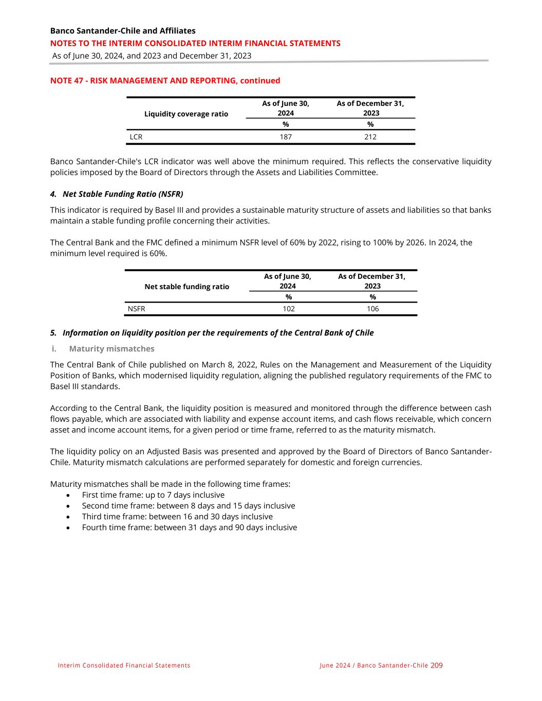 Banco Santander-Chile and Affiliates NOTES TO THE INTERIM CONSOLIDATED INTERIM FINANCIAL STATEMENTS As of June 30, 2024, and 2023 and December 31, 2023 Interim Consolidated Financial Statements June 2024 / Banco Santander -Chile 209 NOTE 47 - RISK MANAGEMENT AND REPORTING, continued Liquidity coverage ratio As of June 30, 2024 As of December 31, 2023 % % LCR 187 212 Banco Santander-Chile's LCR indicator was well above the minimum required. This reflects the conservative liquidity policies imposed by the Board of Directors through the Assets and Liabilities Committee. 4. Net Stable Funding Ratio (NSFR) This indicator is required by Basel III and provides a sustainable maturity structure of assets and liabilities so that banks maintain a stable funding profile concerning their activities. The Central Bank and the FMC defined a minimum NSFR level of 60% by 2022, rising to 100% by 2026. In 2024, the minimum level required is 60%. Net stable funding ratio As of June 30, 2024 As of December 31, 2023 % % NSFR 102 106 5. Information on liquidity position per the requirements of the Central Bank of Chile i. Maturity mismatches The Central Bank of Chile published on March 8, 2022, Rules on the Management and Measurement of the Liquidity Position of Banks, which modernised liquidity regulation, aligning the published regulatory requirements of the FMC to Basel III standards. According to the Central Bank, the liquidity position is measured and monitored through the difference between cash flows payable, which are associated with liability and expense account items, and cash flows receivable, which concern asset and income account items, for a given period or time frame, referred to as the maturity mismatch. The liquidity policy on an Adjusted Basis was presented and approved by the Board of Directors of Banco Santander- Chile. Maturity mismatch calculations are performed separately for domestic and foreign currencies. Maturity mismatches shall be made in the following time frames: • First time frame: up to 7 days inclusive • Second time frame: between 8 days and 15 days inclusive • Third time frame: between 16 and 30 days inclusive • Fourth time frame: between 31 days and 90 days inclusive