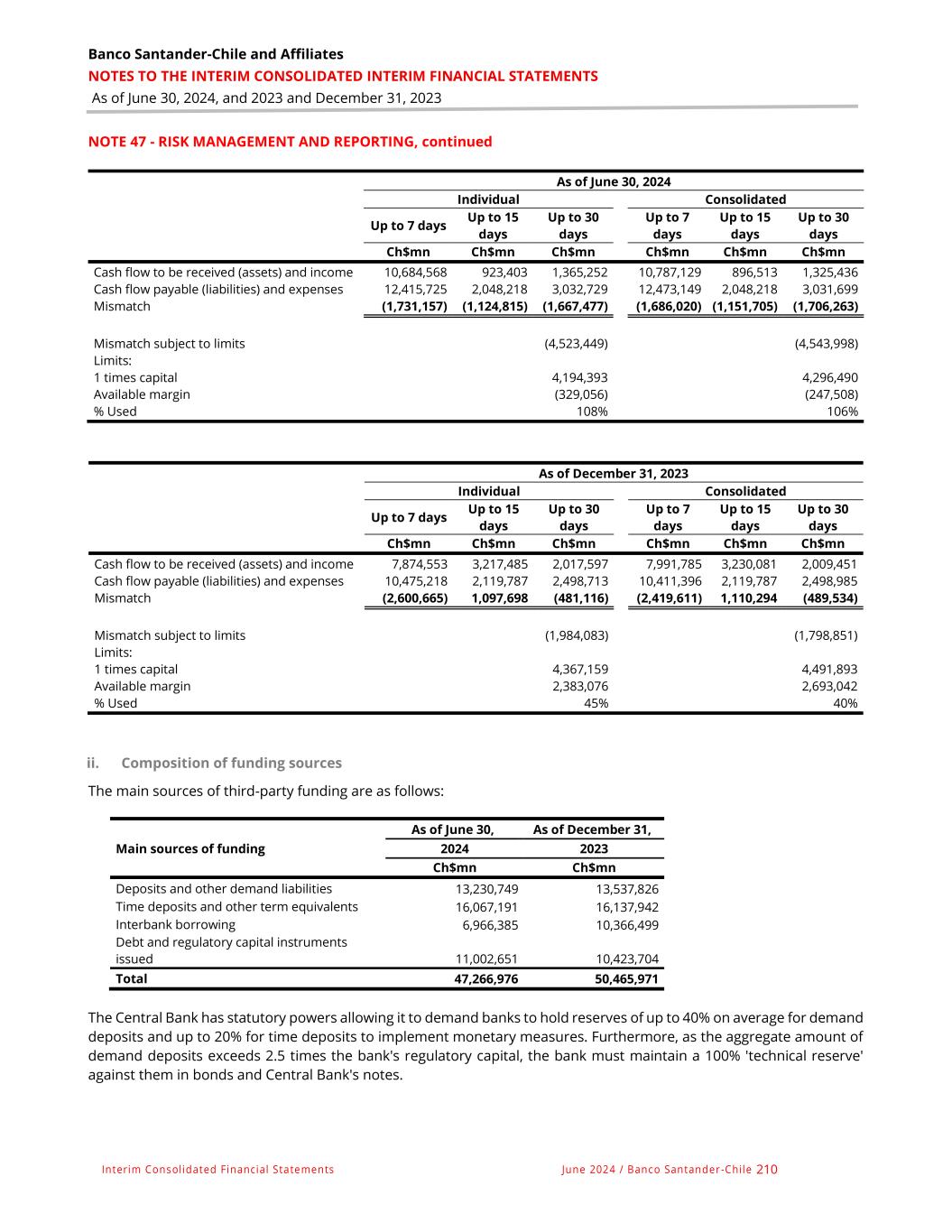 Banco Santander-Chile and Affiliates NOTES TO THE INTERIM CONSOLIDATED INTERIM FINANCIAL STATEMENTS As of June 30, 2024, and 2023 and December 31, 2023 Interim Consolidated Financial Statements June 2024 / Banco Santander -Chile 210 NOTE 47 - RISK MANAGEMENT AND REPORTING, continued As of June 30, 2024 Individual Consolidated Up to 7 days Up to 15 days Up to 30 days Up to 7 days Up to 15 days Up to 30 days Ch$mn Ch$mn Ch$mn Ch$mn Ch$mn Ch$mn Cash flow to be received (assets) and income 10,684,568 923,403 1,365,252 10,787,129 896,513 1,325,436 Cash flow payable (liabilities) and expenses 12,415,725 2,048,218 3,032,729 12,473,149 2,048,218 3,031,699 Mismatch (1,731,157) (1,124,815) (1,667,477) (1,686,020) (1,151,705) (1,706,263) Mismatch subject to limits (4,523,449) (4,543,998) Limits: 1 times capital 4,194,393 4,296,490 Available margin (329,056) (247,508) % Used 108% 106% As of December 31, 2023 Individual Consolidated Up to 7 days Up to 15 days Up to 30 days Up to 7 days Up to 15 days Up to 30 days Ch$mn Ch$mn Ch$mn Ch$mn Ch$mn Ch$mn Cash flow to be received (assets) and income 7,874,553 3,217,485 2,017,597 7,991,785 3,230,081 2,009,451 Cash flow payable (liabilities) and expenses 10,475,218 2,119,787 2,498,713 10,411,396 2,119,787 2,498,985 Mismatch (2,600,665) 1,097,698 (481,116) (2,419,611) 1,110,294 (489,534) Mismatch subject to limits (1,984,083) (1,798,851) Limits: 1 times capital 4,367,159 4,491,893 Available margin 2,383,076 2,693,042 % Used 45% 40% ii. Composition of funding sources The main sources of third-party funding are as follows: As of June 30, As of December 31, Main sources of funding 2024 2023 Ch$mn Ch$mn Deposits and other demand liabilities 13,230,749 13,537,826 Time deposits and other term equivalents 16,067,191 16,137,942 Interbank borrowing 6,966,385 10,366,499 Debt and regulatory capital instruments issued 11,002,651 10,423,704 Total 47,266,976 50,465,971 The Central Bank has statutory powers allowing it to demand banks to hold reserves of up to 40% on average for demand deposits and up to 20% for time deposits to implement monetary measures. Furthermore, as the aggregate amount of demand deposits exceeds 2.5 times the bank's regulatory capital, the bank must maintain a 100% 'technical reserve' against them in bonds and Central Bank's notes.