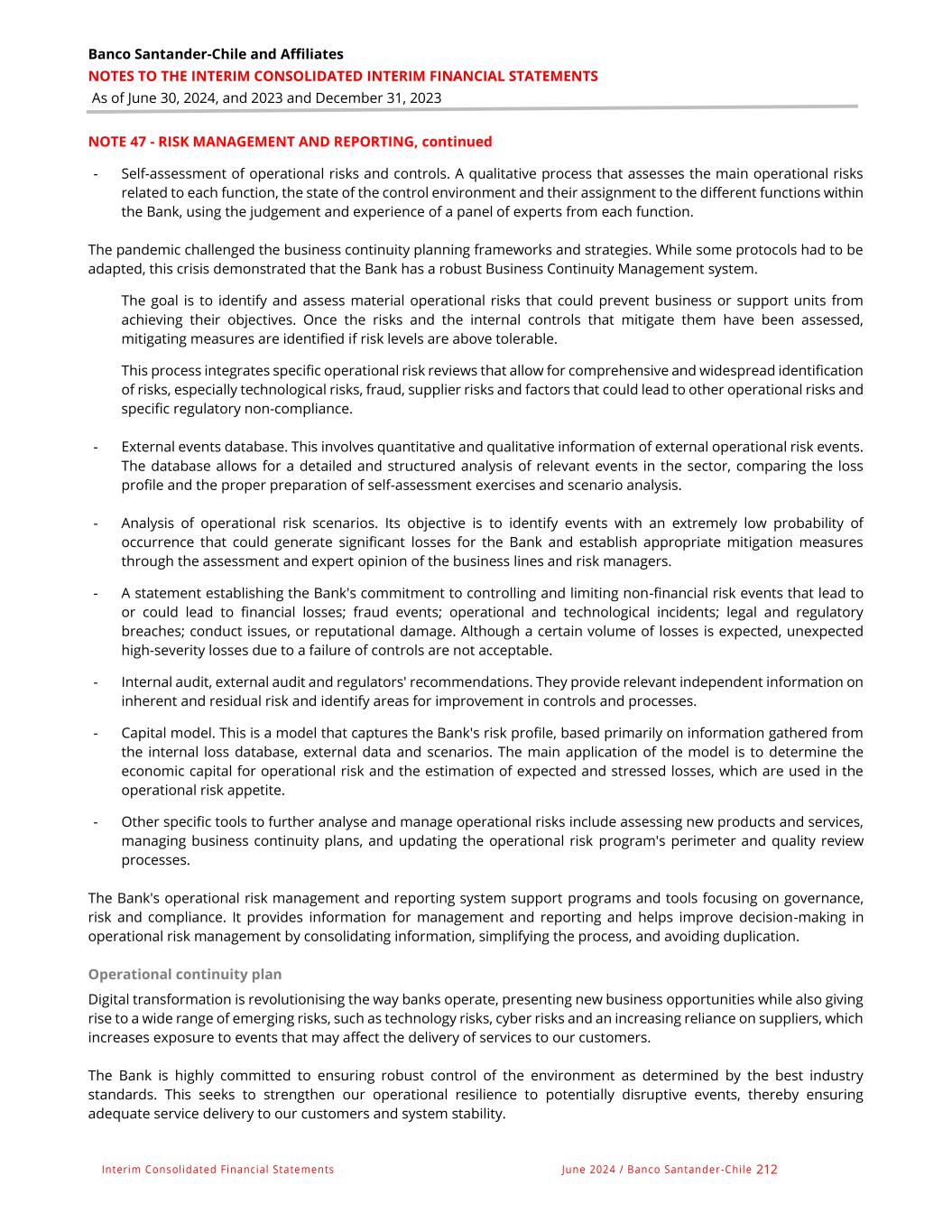 Banco Santander-Chile and Affiliates NOTES TO THE INTERIM CONSOLIDATED INTERIM FINANCIAL STATEMENTS As of June 30, 2024, and 2023 and December 31, 2023 Interim Consolidated Financial Statements June 2024 / Banco Santander -Chile 212 NOTE 47 - RISK MANAGEMENT AND REPORTING, continued - Self-assessment of operational risks and controls. A qualitative process that assesses the main operational risks related to each function, the state of the control environment and their assignment to the different functions within the Bank, using the judgement and experience of a panel of experts from each function. The pandemic challenged the business continuity planning frameworks and strategies. While some protocols had to be adapted, this crisis demonstrated that the Bank has a robust Business Continuity Management system. The goal is to identify and assess material operational risks that could prevent business or support units from achieving their objectives. Once the risks and the internal controls that mitigate them have been assessed, mitigating measures are identified if risk levels are above tolerable. This process integrates specific operational risk reviews that allow for comprehensive and widespread identification of risks, especially technological risks, fraud, supplier risks and factors that could lead to other operational risks and specific regulatory non-compliance. - External events database. This involves quantitative and qualitative information of external operational risk events. The database allows for a detailed and structured analysis of relevant events in the sector, comparing the loss profile and the proper preparation of self-assessment exercises and scenario analysis. - Analysis of operational risk scenarios. Its objective is to identify events with an extremely low probability of occurrence that could generate significant losses for the Bank and establish appropriate mitigation measures through the assessment and expert opinion of the business lines and risk managers. - A statement establishing the Bank's commitment to controlling and limiting non-financial risk events that lead to or could lead to financial losses; fraud events; operational and technological incidents; legal and regulatory breaches; conduct issues, or reputational damage. Although a certain volume of losses is expected, unexpected high-severity losses due to a failure of controls are not acceptable. - Internal audit, external audit and regulators' recommendations. They provide relevant independent information on inherent and residual risk and identify areas for improvement in controls and processes. - Capital model. This is a model that captures the Bank's risk profile, based primarily on information gathered from the internal loss database, external data and scenarios. The main application of the model is to determine the economic capital for operational risk and the estimation of expected and stressed losses, which are used in the operational risk appetite. - Other specific tools to further analyse and manage operational risks include assessing new products and services, managing business continuity plans, and updating the operational risk program's perimeter and quality review processes. The Bank's operational risk management and reporting system support programs and tools focusing on governance, risk and compliance. It provides information for management and reporting and helps improve decision-making in operational risk management by consolidating information, simplifying the process, and avoiding duplication. Operational continuity plan Digital transformation is revolutionising the way banks operate, presenting new business opportunities while also giving rise to a wide range of emerging risks, such as technology risks, cyber risks and an increasing reliance on suppliers, which increases exposure to events that may affect the delivery of services to our customers. The Bank is highly committed to ensuring robust control of the environment as determined by the best industry standards. This seeks to strengthen our operational resilience to potentially disruptive events, thereby ensuring adequate service delivery to our customers and system stability.