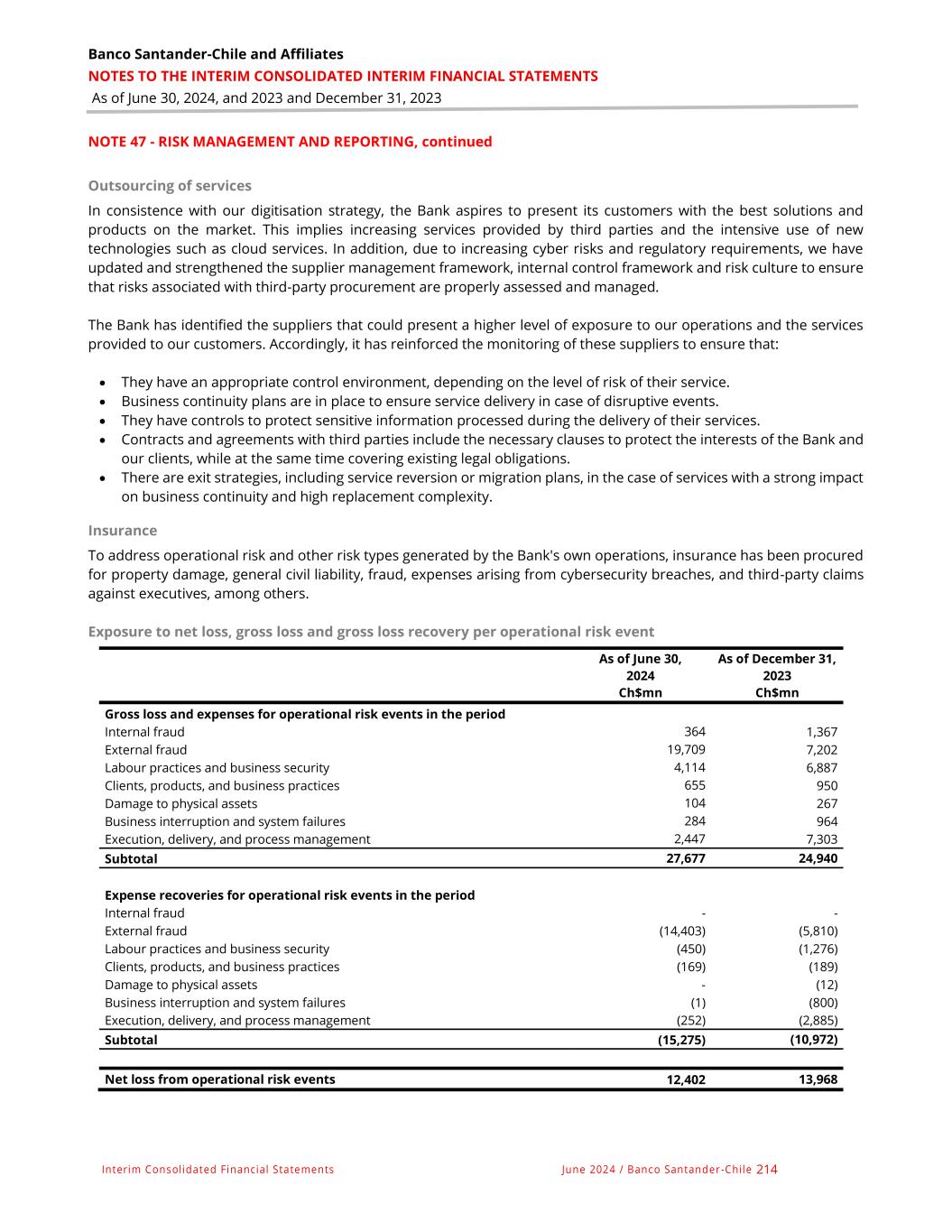 Banco Santander-Chile and Affiliates NOTES TO THE INTERIM CONSOLIDATED INTERIM FINANCIAL STATEMENTS As of June 30, 2024, and 2023 and December 31, 2023 Interim Consolidated Financial Statements June 2024 / Banco Santander -Chile 214 NOTE 47 - RISK MANAGEMENT AND REPORTING, continued Outsourcing of services In consistence with our digitisation strategy, the Bank aspires to present its customers with the best solutions and products on the market. This implies increasing services provided by third parties and the intensive use of new technologies such as cloud services. In addition, due to increasing cyber risks and regulatory requirements, we have updated and strengthened the supplier management framework, internal control framework and risk culture to ensure that risks associated with third-party procurement are properly assessed and managed. The Bank has identified the suppliers that could present a higher level of exposure to our operations and the services provided to our customers. Accordingly, it has reinforced the monitoring of these suppliers to ensure that: • They have an appropriate control environment, depending on the level of risk of their service. • Business continuity plans are in place to ensure service delivery in case of disruptive events. • They have controls to protect sensitive information processed during the delivery of their services. • Contracts and agreements with third parties include the necessary clauses to protect the interests of the Bank and our clients, while at the same time covering existing legal obligations. • There are exit strategies, including service reversion or migration plans, in the case of services with a strong impact on business continuity and high replacement complexity. Insurance To address operational risk and other risk types generated by the Bank's own operations, insurance has been procured for property damage, general civil liability, fraud, expenses arising from cybersecurity breaches, and third-party claims against executives, among others. Exposure to net loss, gross loss and gross loss recovery per operational risk event As of June 30, 2024 As of December 31, 2023 Ch$mn Ch$mn Gross loss and expenses for operational risk events in the period Internal fraud 364 1,367 External fraud 19,709 7,202 Labour practices and business security 4,114 6,887 Clients, products, and business practices 655 950 Damage to physical assets 104 267 Business interruption and system failures 284 964 Execution, delivery, and process management 2,447 7,303 Subtotal 27,677 24,940 Expense recoveries for operational risk events in the period Internal fraud - - External fraud (14,403) (5,810) Labour practices and business security (450) (1,276) Clients, products, and business practices (169) (189) Damage to physical assets - (12) Business interruption and system failures (1) (800) Execution, delivery, and process management (252) (2,885) Subtotal (15,275) (10,972) Net loss from operational risk events 12,402 13,968