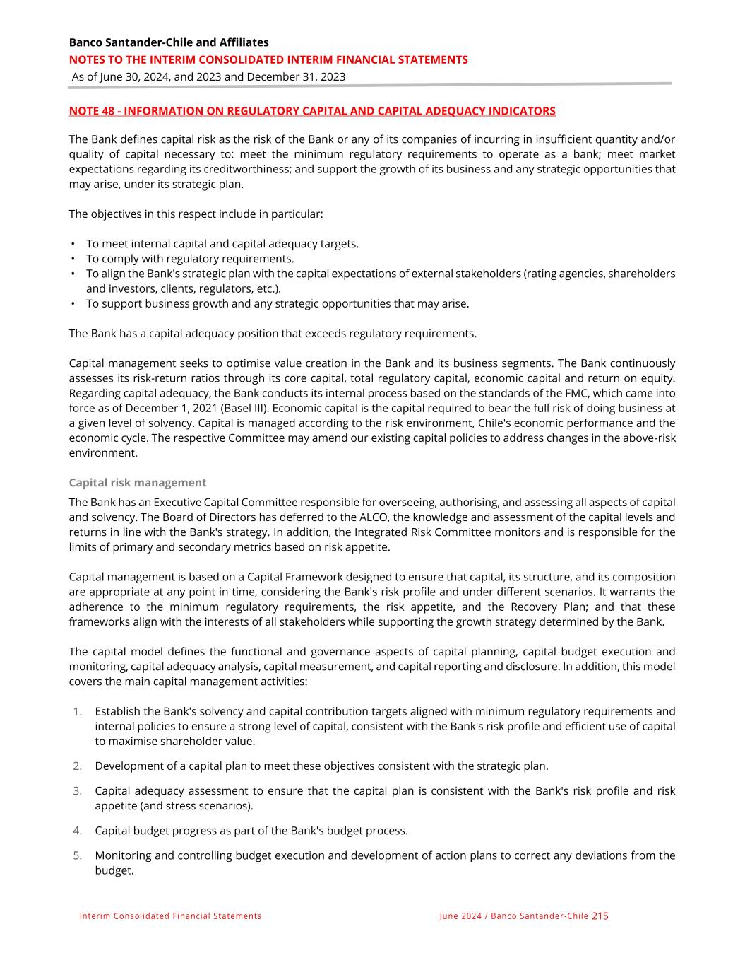 Banco Santander-Chile and Affiliates NOTES TO THE INTERIM CONSOLIDATED INTERIM FINANCIAL STATEMENTS As of June 30, 2024, and 2023 and December 31, 2023 Interim Consolidated Financial Statements June 2024 / Banco Santander -Chile 215 NOTE 48 - INFORMATION ON REGULATORY CAPITAL AND CAPITAL ADEQUACY INDICATORS The Bank defines capital risk as the risk of the Bank or any of its companies of incurring in insufficient quantity and/or quality of capital necessary to: meet the minimum regulatory requirements to operate as a bank; meet market expectations regarding its creditworthiness; and support the growth of its business and any strategic opportunities that may arise, under its strategic plan. The objectives in this respect include in particular: • To meet internal capital and capital adequacy targets. • To comply with regulatory requirements. • To align the Bank's strategic plan with the capital expectations of external stakeholders (rating agencies, shareholders and investors, clients, regulators, etc.). • To support business growth and any strategic opportunities that may arise. The Bank has a capital adequacy position that exceeds regulatory requirements. Capital management seeks to optimise value creation in the Bank and its business segments. The Bank continuously assesses its risk-return ratios through its core capital, total regulatory capital, economic capital and return on equity. Regarding capital adequacy, the Bank conducts its internal process based on the standards of the FMC, which came into force as of December 1, 2021 (Basel III). Economic capital is the capital required to bear the full risk of doing business at a given level of solvency. Capital is managed according to the risk environment, Chile's economic performance and the economic cycle. The respective Committee may amend our existing capital policies to address changes in the above-risk environment. Capital risk management The Bank has an Executive Capital Committee responsible for overseeing, authorising, and assessing all aspects of capital and solvency. The Board of Directors has deferred to the ALCO, the knowledge and assessment of the capital levels and returns in line with the Bank's strategy. In addition, the Integrated Risk Committee monitors and is responsible for the limits of primary and secondary metrics based on risk appetite. Capital management is based on a Capital Framework designed to ensure that capital, its structure, and its composition are appropriate at any point in time, considering the Bank's risk profile and under different scenarios. It warrants the adherence to the minimum regulatory requirements, the risk appetite, and the Recovery Plan; and that these frameworks align with the interests of all stakeholders while supporting the growth strategy determined by the Bank. The capital model defines the functional and governance aspects of capital planning, capital budget execution and monitoring, capital adequacy analysis, capital measurement, and capital reporting and disclosure. In addition, this model covers the main capital management activities: 1. Establish the Bank's solvency and capital contribution targets aligned with minimum regulatory requirements and internal policies to ensure a strong level of capital, consistent with the Bank's risk profile and efficient use of capital to maximise shareholder value. 2. Development of a capital plan to meet these objectives consistent with the strategic plan. 3. Capital adequacy assessment to ensure that the capital plan is consistent with the Bank's risk profile and risk appetite (and stress scenarios). 4. Capital budget progress as part of the Bank's budget process. 5. Monitoring and controlling budget execution and development of action plans to correct any deviations from the budget.