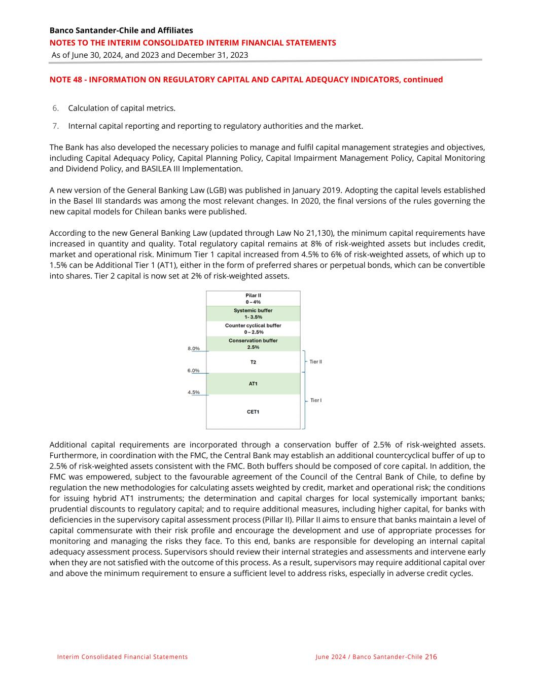 Banco Santander-Chile and Affiliates NOTES TO THE INTERIM CONSOLIDATED INTERIM FINANCIAL STATEMENTS As of June 30, 2024, and 2023 and December 31, 2023 Interim Consolidated Financial Statements June 2024 / Banco Santander -Chile 216 NOTE 48 - INFORMATION ON REGULATORY CAPITAL AND CAPITAL ADEQUACY INDICATORS, continued 6. Calculation of capital metrics. 7. Internal capital reporting and reporting to regulatory authorities and the market. The Bank has also developed the necessary policies to manage and fulfil capital management strategies and objectives, including Capital Adequacy Policy, Capital Planning Policy, Capital Impairment Management Policy, Capital Monitoring and Dividend Policy, and BASILEA III Implementation. A new version of the General Banking Law (LGB) was published in January 2019. Adopting the capital levels established in the Basel III standards was among the most relevant changes. In 2020, the final versions of the rules governing the new capital models for Chilean banks were published. According to the new General Banking Law (updated through Law No 21,130), the minimum capital requirements have increased in quantity and quality. Total regulatory capital remains at 8% of risk-weighted assets but includes credit, market and operational risk. Minimum Tier 1 capital increased from 4.5% to 6% of risk-weighted assets, of which up to 1.5% can be Additional Tier 1 (AT1), either in the form of preferred shares or perpetual bonds, which can be convertible into shares. Tier 2 capital is now set at 2% of risk-weighted assets. Additional capital requirements are incorporated through a conservation buffer of 2.5% of risk-weighted assets. Furthermore, in coordination with the FMC, the Central Bank may establish an additional countercyclical buffer of up to 2.5% of risk-weighted assets consistent with the FMC. Both buffers should be composed of core capital. In addition, the FMC was empowered, subject to the favourable agreement of the Council of the Central Bank of Chile, to define by regulation the new methodologies for calculating assets weighted by credit, market and operational risk; the conditions for issuing hybrid AT1 instruments; the determination and capital charges for local systemically important banks; prudential discounts to regulatory capital; and to require additional measures, including higher capital, for banks with deficiencies in the supervisory capital assessment process (Pillar II). Pillar II aims to ensure that banks maintain a level of capital commensurate with their risk profile and encourage the development and use of appropriate processes for monitoring and managing the risks they face. To this end, banks are responsible for developing an internal capital adequacy assessment process. Supervisors should review their internal strategies and assessments and intervene early when they are not satisfied with the outcome of this process. As a result, supervisors may require additional capital over and above the minimum requirement to ensure a sufficient level to address risks, especially in adverse credit cycles.