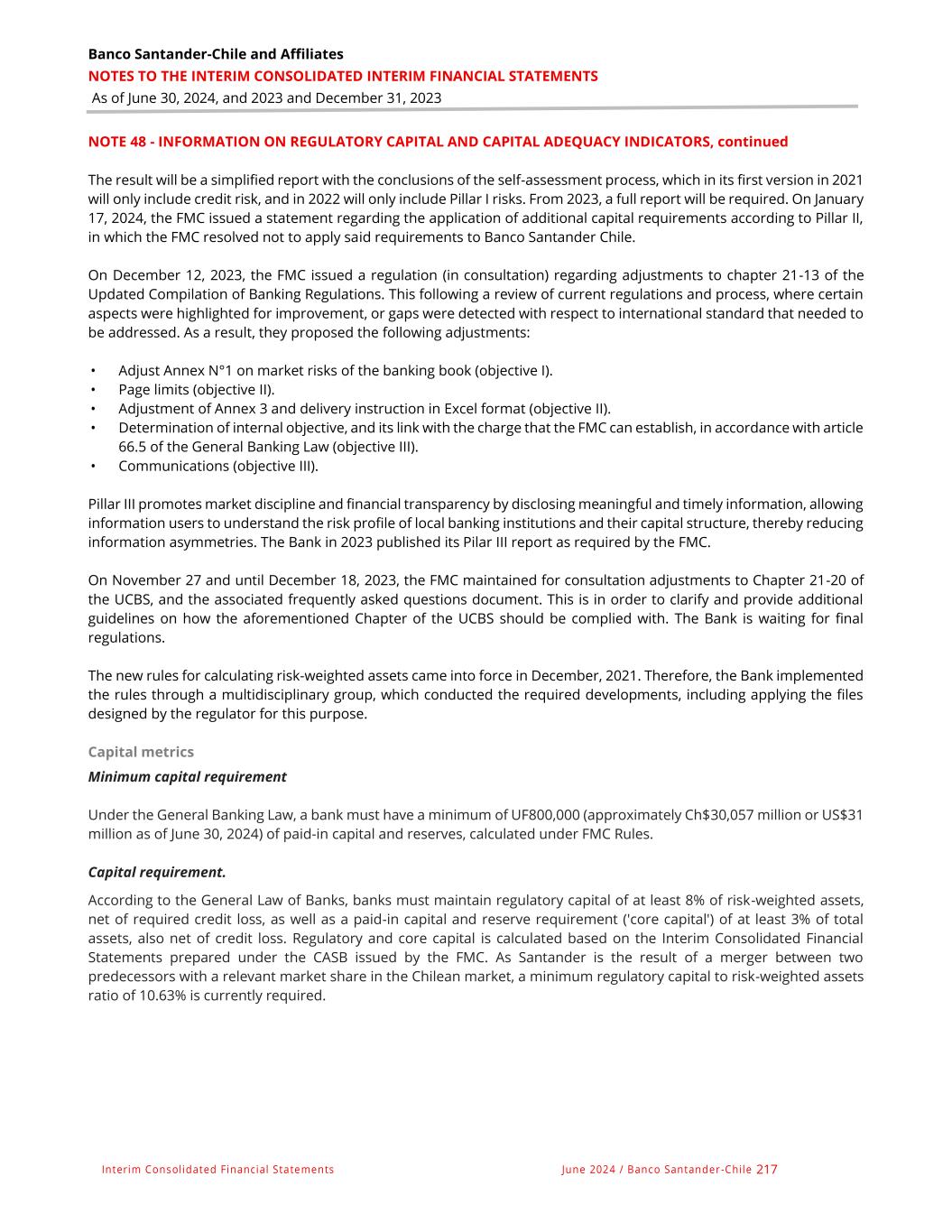Banco Santander-Chile and Affiliates NOTES TO THE INTERIM CONSOLIDATED INTERIM FINANCIAL STATEMENTS As of June 30, 2024, and 2023 and December 31, 2023 Interim Consolidated Financial Statements June 2024 / Banco Santander -Chile 217 NOTE 48 - INFORMATION ON REGULATORY CAPITAL AND CAPITAL ADEQUACY INDICATORS, continued The result will be a simplified report with the conclusions of the self-assessment process, which in its first version in 2021 will only include credit risk, and in 2022 will only include Pillar I risks. From 2023, a full report will be required. On January 17, 2024, the FMC issued a statement regarding the application of additional capital requirements according to Pillar II, in which the FMC resolved not to apply said requirements to Banco Santander Chile. On December 12, 2023, the FMC issued a regulation (in consultation) regarding adjustments to chapter 21-13 of the Updated Compilation of Banking Regulations. This following a review of current regulations and process, where certain aspects were highlighted for improvement, or gaps were detected with respect to international standard that needed to be addressed. As a result, they proposed the following adjustments: • Adjust Annex N°1 on market risks of the banking book (objective I). • Page limits (objective II). • Adjustment of Annex 3 and delivery instruction in Excel format (objective II). • Determination of internal objective, and its link with the charge that the FMC can establish, in accordance with article 66.5 of the General Banking Law (objective III). • Communications (objective III). Pillar III promotes market discipline and financial transparency by disclosing meaningful and timely information, allowing information users to understand the risk profile of local banking institutions and their capital structure, thereby reducing information asymmetries. The Bank in 2023 published its Pilar III report as required by the FMC. On November 27 and until December 18, 2023, the FMC maintained for consultation adjustments to Chapter 21-20 of the UCBS, and the associated frequently asked questions document. This is in order to clarify and provide additional guidelines on how the aforementioned Chapter of the UCBS should be complied with. The Bank is waiting for final regulations. The new rules for calculating risk-weighted assets came into force in December, 2021. Therefore, the Bank implemented the rules through a multidisciplinary group, which conducted the required developments, including applying the files designed by the regulator for this purpose. Capital metrics Minimum capital requirement Under the General Banking Law, a bank must have a minimum of UF800,000 (approximately Ch$30,057 million or US$31 million as of June 30, 2024) of paid-in capital and reserves, calculated under FMC Rules. Capital requirement. According to the General Law of Banks, banks must maintain regulatory capital of at least 8% of risk-weighted assets, net of required credit loss, as well as a paid-in capital and reserve requirement ('core capital') of at least 3% of total assets, also net of credit loss. Regulatory and core capital is calculated based on the Interim Consolidated Financial Statements prepared under the CASB issued by the FMC. As Santander is the result of a merger between two predecessors with a relevant market share in the Chilean market, a minimum regulatory capital to risk-weighted assets ratio of 10.63% is currently required.