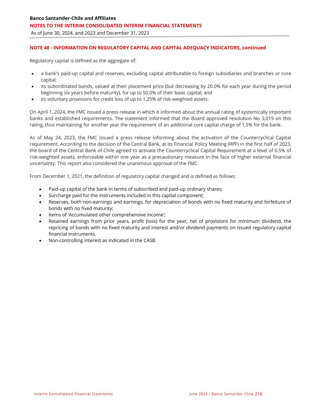 Banco Santander-Chile and Affiliates NOTES TO THE INTERIM CONSOLIDATED INTERIM FINANCIAL STATEMENTS As of June 30, 2024, and 2023 and December 31, 2023 Interim Consolidated Financial Statements June 2024 / Banco Santander -Chile 218 NOTE 48 - INFORMATION ON REGULATORY CAPITAL AND CAPITAL ADEQUACY INDICATORS, continued Regulatory capital is defined as the aggregate of: • a bank's paid-up capital and reserves, excluding capital attributable to foreign subsidiaries and branches or core capital; • its subordinated bonds, valued at their placement price (but decreasing by 20.0% for each year during the period beginning six years before maturity), for up to 50.0% of their basic capital; and • its voluntary provisions for credit loss of up to 1.25% of risk-weighted assets. On April 1, 2024, the FMC issued a press release in which it informed about the annual rating of systemically important banks and established requirements. The statement informed that the Board approved resolution No 3,019 on this rating, thus maintaining for another year the requirement of an additional core capital charge of 1.5% for the bank. As of May 24, 2023, the FMC issued a press release informing about the activation of the Countercyclical Capital requirement. According to the decision of the Central Bank, at its Financial Policy Meeting (RPF) in the first half of 2023, the board of the Central Bank of Chile agreed to activate the Countercyclical Capital Requirement at a level of 0.5% of risk-weighted assets, enforceable within one year as a precautionary measure in the face of higher external financial uncertainty. This report also considered the unanimous approval of the FMC. From December 1, 2021, the definition of regulatory capital changed and is defined as follows: • Paid-up capital of the bank in terms of subscribed and paid-up ordinary shares; • Surcharge paid for the instruments included in this capital component; • Reserves, both non-earnings and earnings, for depreciation of bonds with no fixed maturity and forfeiture of bonds with no fixed maturity; • Items of 'Accumulated other comprehensive income'; • Retained earnings from prior years, profit (loss) for the year, net of provisions for minimum dividend, the repricing of bonds with no fixed maturity and interest and/or dividend payments on issued regulatory capital financial instruments. • Non-controlling interest as indicated in the CASB.