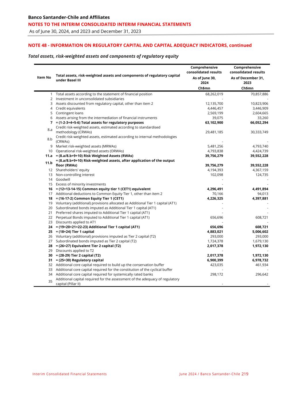 Banco Santander-Chile and Affiliates NOTES TO THE INTERIM CONSOLIDATED INTERIM FINANCIAL STATEMENTS As of June 30, 2024, and 2023 and December 31, 2023 Interim Consolidated Financial Statements June 2024 / Banco Santander -Chile 219 NOTE 48 - INFORMATION ON REGULATORY CAPITAL AND CAPITAL ADEQUACY INDICATORS, continued Total assets, risk-weighted assets and components of regulatory equity Item No Total assets, risk-weighted assets and components of regulatory capital under Basel III Comprehensive consolidated results Comprehensive consolidated results As of June 30, 2024 As of December 31, 2023 Ch$mn Ch$mn 1 Total assets according to the statement of financial position 68,262,019 70,857,886 2 Investment in unconsolidated subsidiaries - - 3 Assets discounted from regulatory capital, other than item 2 12,135,700 10,823,906 4 Credit equivalents 4,446,457 3,446,909 5 Contingent loans 2,569,199 2,604,665 6 Assets arising from the intermediation of financial instruments 39,075 33,260 7 = (1-2-3+4+5-6) Total assets for regulatory purposes 63,102,900 66,052,294 8.a Credit risk-weighted assets, estimated according to standardised methodology (CRWAs) 29,481,185 30,333,749 8.b Credit risk-weighted assets, estimated according to internal methodologies (CRWAs) - - 9 Market risk-weighted assets (MRWAs) 5,481,256 4,793,740 10 Operational risk-weighted assets (ORWAs) 4,793,838 4,424,739 11.a = (8.a/8.b+9+10) Risk Weighted Assets (RWAs) 39,756,279 39,552,228 11.b = (8.a/8.b+9+10) Risk-weighted assets, after application of the output floor (RWAs) 39,756,279 39,552,228 12 Shareholders' equity 4,194,393 4,367,159 13 Non-controlling interest 102,098 124,735 14 Goodwill - - 15 Excess of minority investments - - 16 = (12+13-14-15) Common equity tier 1 (CET1) equivalent 4,296,491 4,491,894 17 Additional deductions to Common Equity Tier 1, other than item 2 70,166 94,013 18 = (16-17-2) Common Equity Tier 1 (CET1) 4,226,325 4,397,881 19 Voluntary (additional) provisions allocated as Additional Tier 1 capital (AT1) - - 20 Subordinated bonds imputed as Additional Tier 1 capital (AT1) - - 21 Preferred shares imputed to Additional Tier 1 capital (AT1) - - 22 Perpetual Bonds imputed to Additional Tier 1 capital (AT1) 656,696 608,721 23 Discounts applied to AT1 - - 24 = (19+20+21+22-23) Additional Tier 1 capital (AT1) 656,696 608,721 25 = (18+24) Tier 1 capital 4,883,021 5,006,602 26 Voluntary (additional) provisions imputed as Tier 2 capital (T2) 293,000 293,000 27 Subordinated bonds imputed as Tier 2 capital (T2) 1,724,378 1,679,130 28 = (26+27) Equivalent Tier 2 capital (T2) 2,017,378 1,972,130 29 Discounts applied to T2 - - 30 = (28-29) Tier 2 capital (T2) 2,017,378 1,972,130 31 = (25+30) Regulatory capital 6,900,399 6,978,732 32 Additional core capital required to build up the conservation buffer 423,035 461,934 33 Additional core capital required for the constitution of the cyclical buffer - - 34 Additional core capital required for systemically rated banks 298,172 296,642 35 Additional capital required for the assessment of the adequacy of regulatory capital (Pillar II) - -