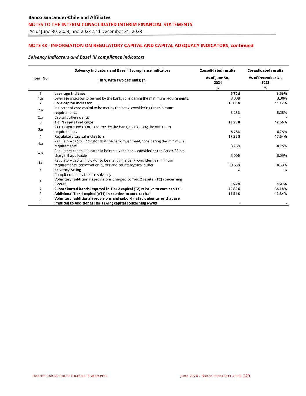 Banco Santander-Chile and Affiliates NOTES TO THE INTERIM CONSOLIDATED INTERIM FINANCIAL STATEMENTS As of June 30, 2024, and 2023 and December 31, 2023 Interim Consolidated Financial Statements June 2024 / Banco Santander -Chile 220 NOTE 48 - INFORMATION ON REGULATORY CAPITAL AND CAPITAL ADEQUACY INDICATORS, continued Solvency indicators and Basel III compliance indicators Item No Solvency indicators and Basel III compliance indicators Consolidated results Consolidated results (in % with two decimals) (*) As of June 30, 2024 As of December 31, 2023 % % 1 Leverage indicator 6.70% 6.66% 1.a Leverage indicator to be met by the bank, considering the minimum requirements. 3.00% 3.00% 2 Core capital indicator 10.63% 11.12% 2.a Indicator of core capital to be met by the bank, considering the minimum requirements. 5.25% 5.25% 2.b Capital buffers deficit - - 3 Tier 1 capital indicator 12.28% 12.66% 3.a Tier 1 capital indicator to be met by the bank, considering the minimum requirements. 6.75% 6.75% 4 Regulatory capital indicators 17.36% 17.64% 4.a Regulatory capital indicator that the bank must meet, considering the minimum requirements. 8.75% 8.75% 4.b Regulatory capital indicator to be met by the bank, considering the Article 35 bis charge, if applicable 8.00% 8.00% 4.c Regulatory capital indicator to be met by the bank, considering minimum requirements, conservation buffer and countercyclical buffer 10.63% 10.63% 5 Solvency rating A A Compliance indicators for solvency 6 Voluntary (additional) provisions charged to Tier 2 capital (T2) concerning CRWAS 0.99% 0.97% 7 Subordinated bonds imputed in Tier 2 capital (T2) relative to core capital. 40.80% 38.18% 8 Additional Tier 1 capital (AT1) in relation to core capital 15.54% 13.84% 9 Voluntary (additional) provisions and subordinated debentures that are imputed to Additional Tier 1 (AT1) capital concerning RWAs - -
